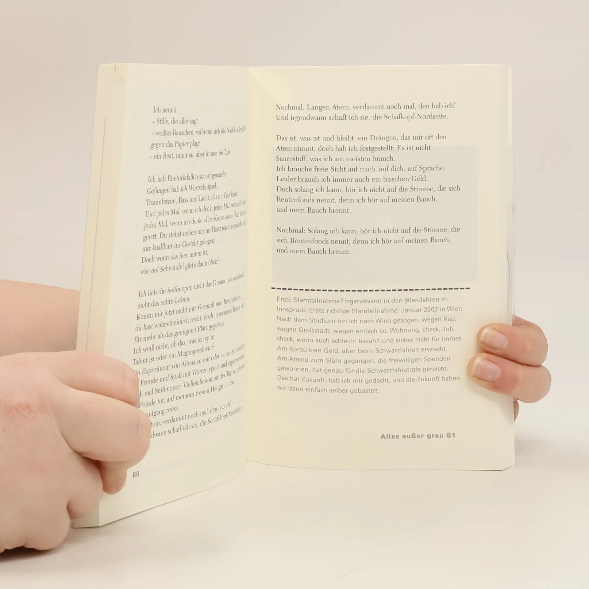 Seit Jahren boomt die Poetry-Slam-Szene auch in Österreich. Mieze Medusa und Markus Köhle waren von Anfang an dabei und legen jetzt mit „Alles außer grau – Texte to go“ ihr viertes abendfüllendes Poetry-Slam-Programm vor. Die österreichischen Poetry-Slam-Ikonen erzählen in ihren Texten vom Unterwegssein mit Gorgonzola und Gelächter. Erzherzog Franz Ferdinand macht eine Weltreise. Amy Winehouse wartet in einem Warteraum im Waldviertel auf bessere Zeiten. Mit einer Jogginghose ist man nie allein. Es tauchen Buchbiber, Leseorks und Busenmaulwürfe auf. Was ist ein Schnitzel, wenn keine Diktatur der Brösel? Ein Supergau ist ein Supergau ist ein Supergau. Wenn nichts mehr hilft, dann hilft Lesen. Aber Achtung: Seiten ändern dich!
