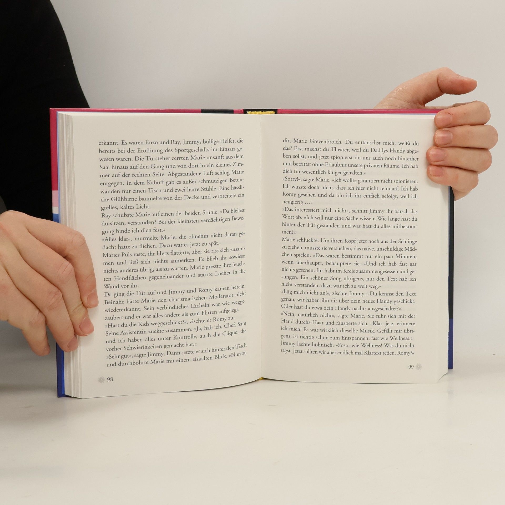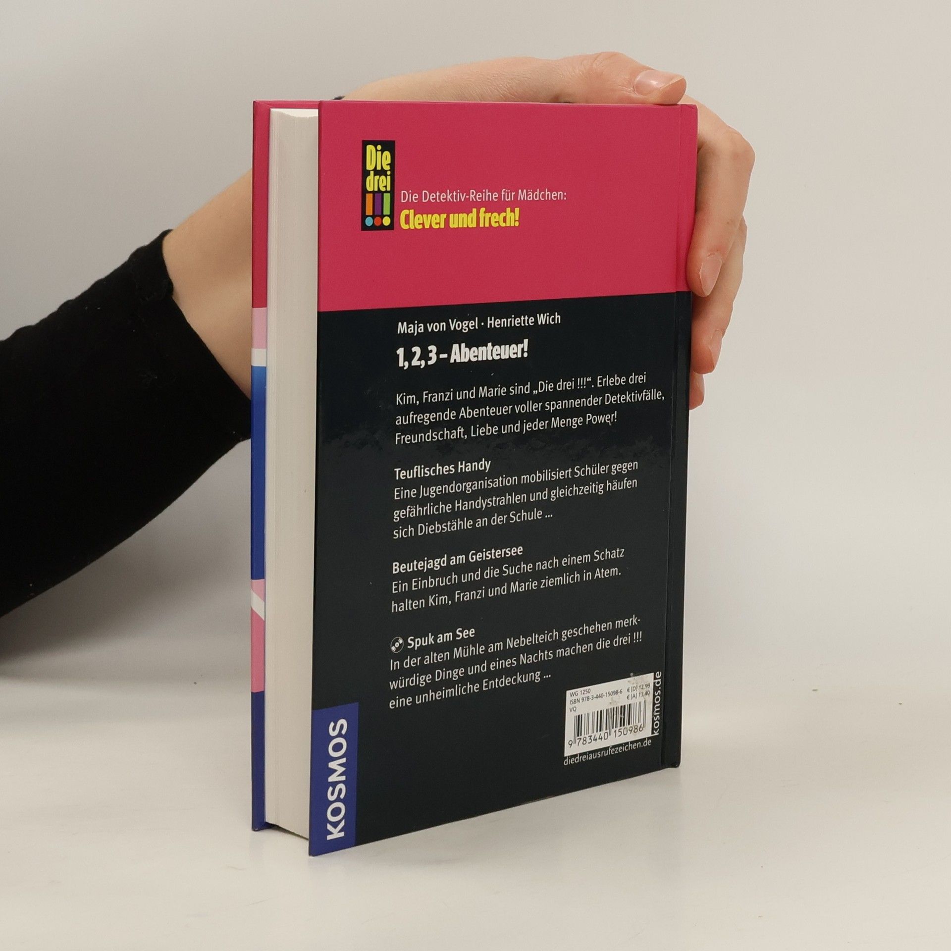 Zwei spannende Fälle zum Lesen plus ein Original-Hörspiel! Kim, Franzi und Marie sind „Die drei !!!“ und ermitteln mutig und clever in aufregenden Abenteuern. Im ersten Fall, "Teuflisches Handy", sorgt eine Jugendorganisation an Maries Schule für Aufregung, indem sie strahlungsfreie Handys und eine exklusive Mitgliedschaft anbietet. Doch als Diebstähle zunehmen, wird das Trio misstrauisch und beginnt zu ermitteln. Dabei geraten sie mehrmals in große Gefahr. Im zweiten Fall, "Beutejagd am Geistersee", wird bei Kims Patentante eingebrochen, ohne dass etwas gestohlen wurde. Die drei Detektivinnen vermuten, dass ein legendärer Schatz und ein dunkles Geheimnis im Spiel sind, und starten sofort ihre Ermittlungen. Ein gefährlicher Wettlauf gegen die Zeit beginnt. Das Hörspiel "Spuk am See" thematisiert Gerüchte über eine unheimliche Gestalt in der alten Mühle am See. Die drei !!! nehmen die Herausforderung an und entdecken bei Nacht etwas Erschreckendes im glitzernden Wasser des Sees. Ist es wirklich … eine Hand?!