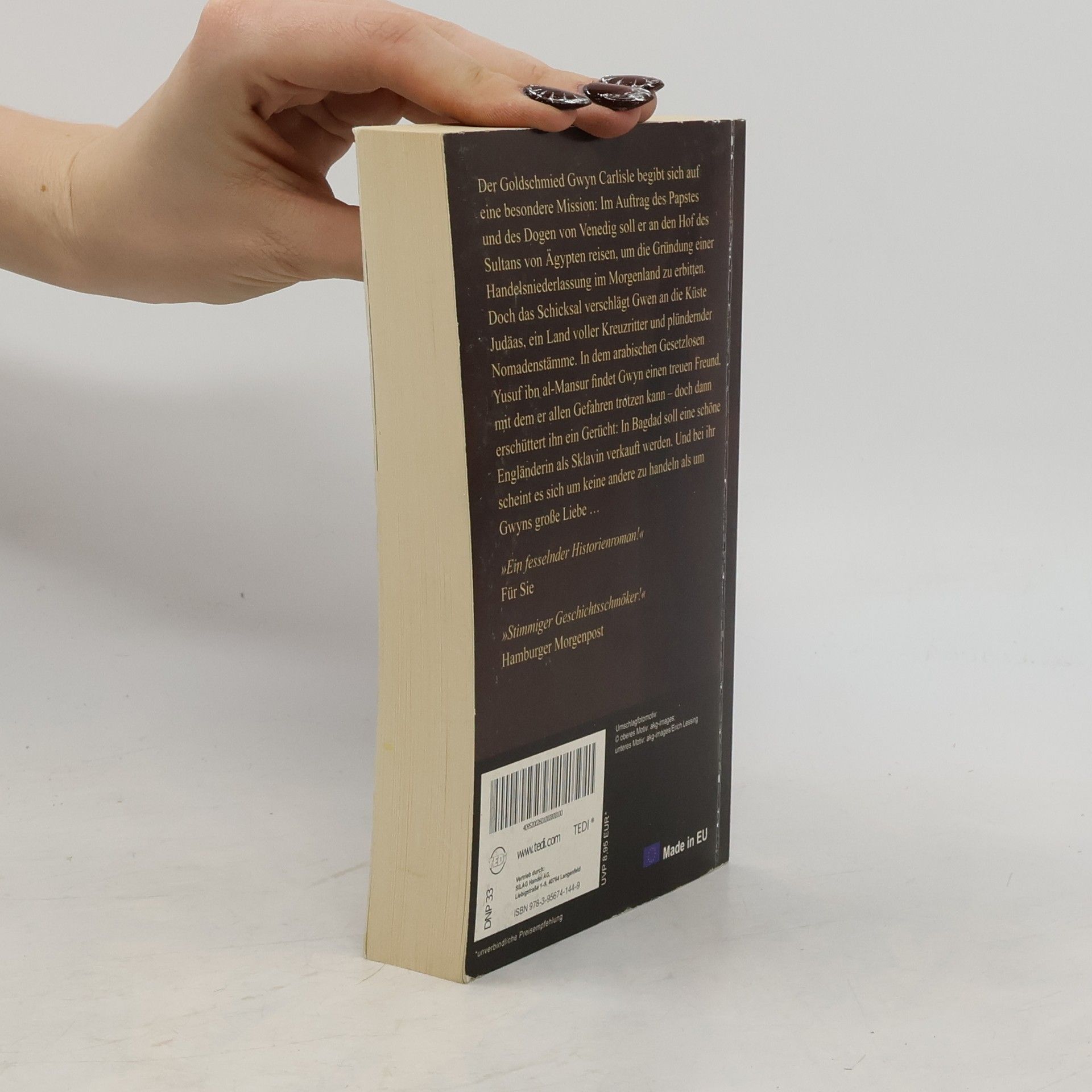 England im frühen Mittelalter. Auf der Flucht vor quälenden Erinnerungen hat der begabte Junge Goldschmied Gwyn Carlisle seine Heimat verlassen und macht sich im Auftrag der Bürgerschaft von Venedig und des Papstes auf den Weg ins Morgenland, um vom Sultan von Ägypten die Erlaubnis zur Gründung einer Handelsniederlassung zu erbitten. Doch sein Weg ins Heilige Land wird ihm durch plündernde Nomadenstämme und hilfesuchende Kreuzritter immer wieder erschwert. Er würde an seiner Mission verzweifeln, wäre da nicht der arabische Gesetzlose Yusuf ibn al-Mansur, der ihm stets zur Seite steht und trotz aller religiösen und kulturellen Unterschiede sein Freund wird. Ihre beginnende Freundschaft wird auf die Probe gestellt, als Gwyn erfährt, daß in Bagdad eine schöne Engländerin als Sklavin verkauft werden soll. Handelt es sich bei dieser Unbekannten um Gwyns eigene Frau? Ein spannender und facettenreicher historischer Roman für all jene, die den Goldschmied gelesen haben oder die den sympathischen Helden Gwyn Carlisle kennenlernen wollen.