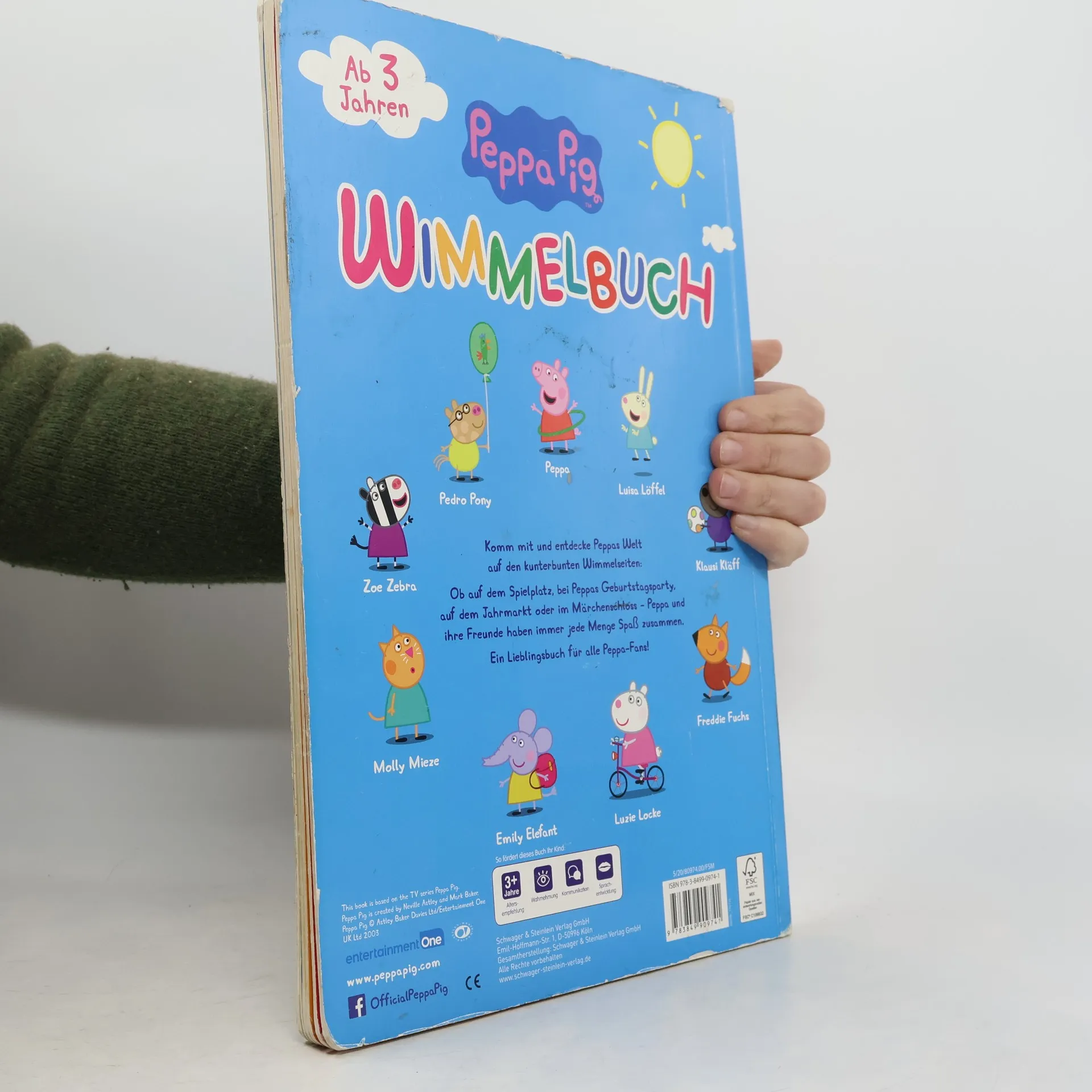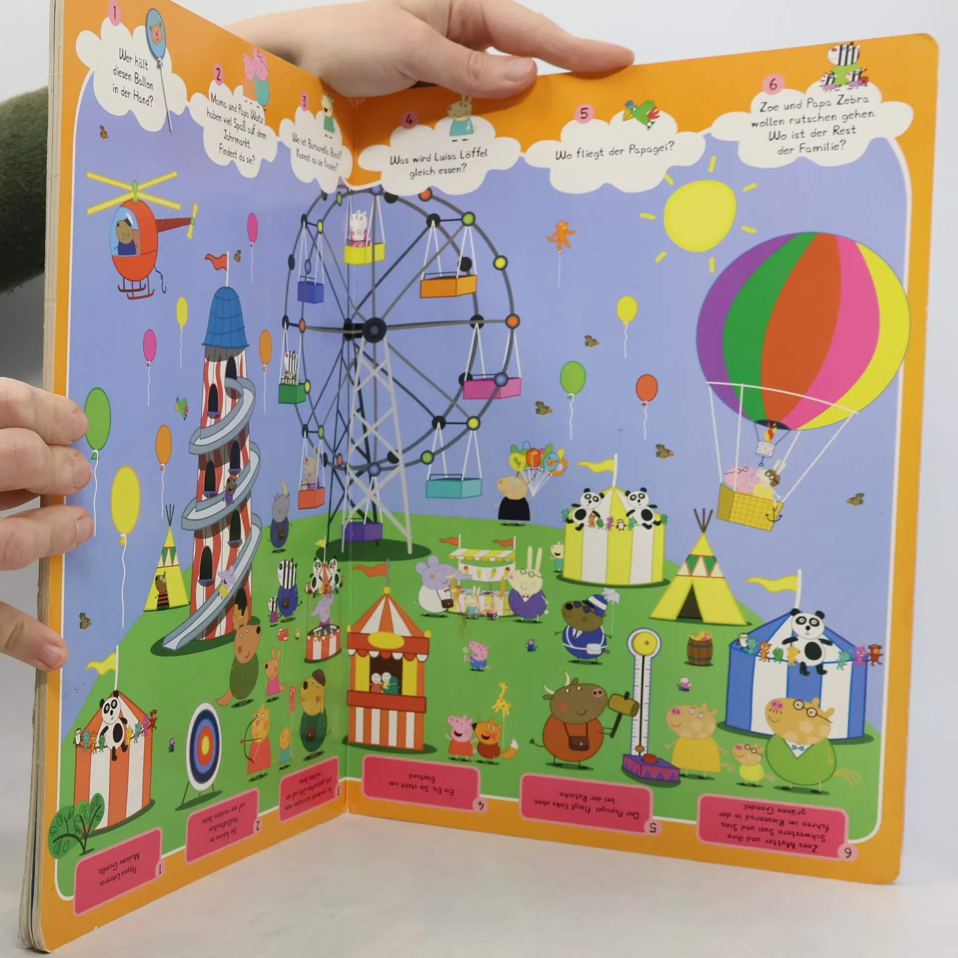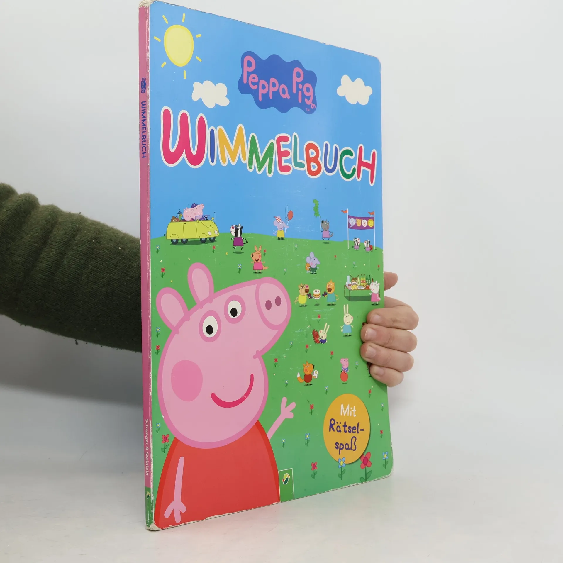 Wimmelspaß mit Peppa Pig • Mit allen Charakteren aus der beliebten TV-Serie Peppa Wutz • Mit lustigen Such-Aufgaben • Details entdecken und benennen: fördert Konzentration und Wahrnehmungsvermögen, erweitert den Wortschatz Was macht Peppa auf dem Spielplatz? Wo hat Schorsch seinen Dinosaurier versteckt? Und findest du Familie Zebra auf dem Jahrmarkt? Entdecke die kunterbunte Welt von Peppa Wutz! Auf dem Spielplatz, bei Peppas Geburtstagsparty im Kindergarten, auf dem Jahrmarkt oder im Märchenschloss – auf den riesengroßen Wimmelseiten gibt es zahlreiche Details zu entdecken. Besonders toll: Zu jeder Szene gibt es Suchaufgaben, die die Kinder zum Geschichten erfinden und Erzählen animieren. So werden ganz nebenbei noch Wortschatz, Konzentration und Fantasie aller kleinen Peppa-Fans gefördert.
