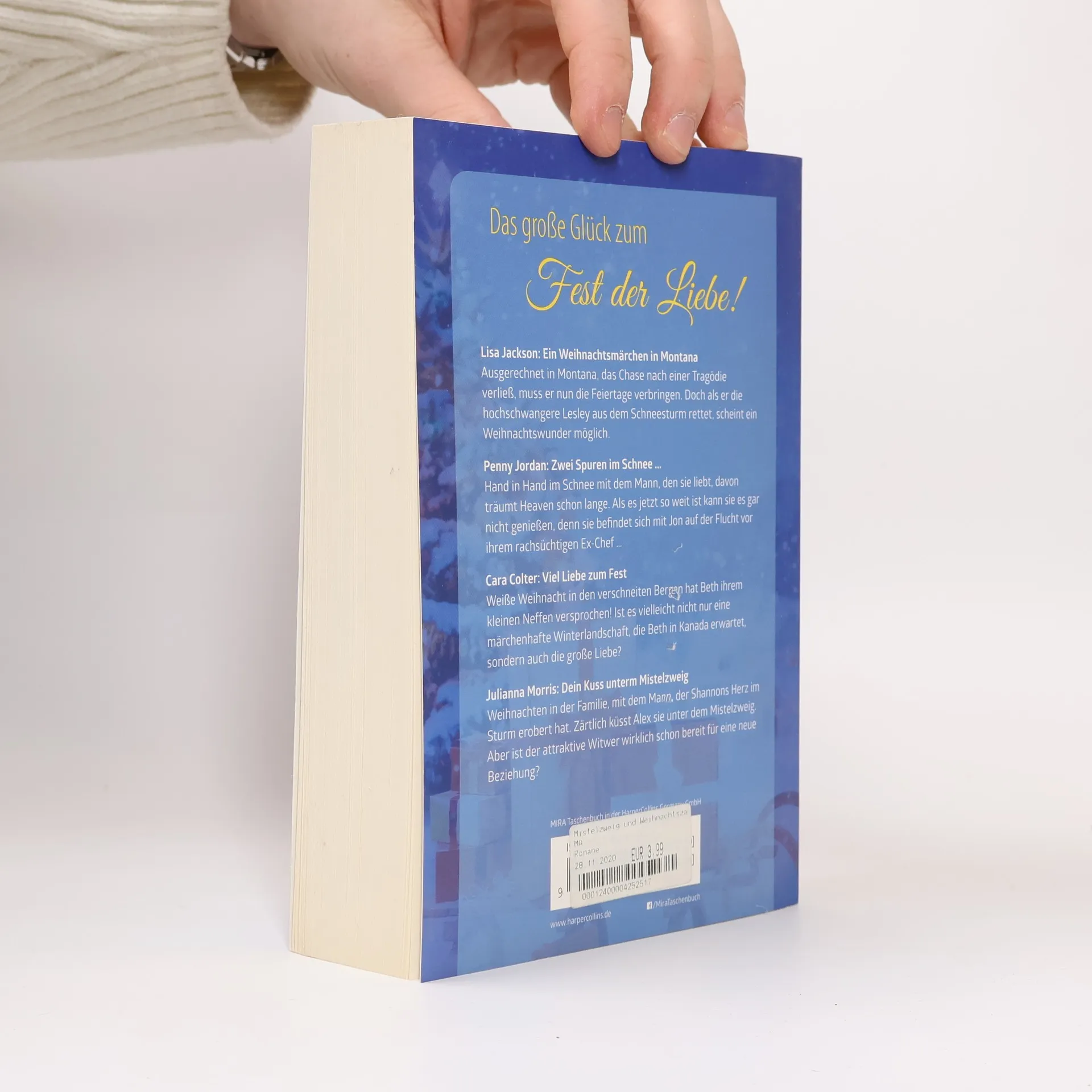 Ein Weihnachtsmärchen in Montana - Lisa Jackson Ausgerechnet in Montana, das Chase nach einer Tragödie verließ, muss er nun die Feiertage verbringen. Doch als er die hochschwangere Lesley aus dem Schneesturm rettet, scheint ein Weihnachtswunder möglich. Zwei Spuren im Schnee … - Penny Jordan Hand in Hand im Schnee mit dem Mann, den sie liebt, davon träumt Heaven schon lange. Als es jetzt so weit ist kann sie es gar nicht genießen, denn sie befindet sich mit Jon auf der Flucht vor ihrem rachsüchtigen Ex-Chef … Viel Liebe zum Fest - Cara Colter Weiße Weihnacht in den verschneiten Bergen hat Beth ihrem kleinen Neffen versprochen! Ist es vielleicht nicht nur eine märchenhafte Winterlandschaft, die Beth in Kanada erwartet, sondern auch die große Liebe? Dein Kuss unterm Mistelzweig - Julianna Morris Weihnachten in der Familie, mit dem Mann, der Shannons Herz im Sturm erobert hat. Zärtlich küsst Alex sie unter dem Mistelzweig. Aber ist der attraktive Witwer wirklich schon bereit für eine neue Beziehung?