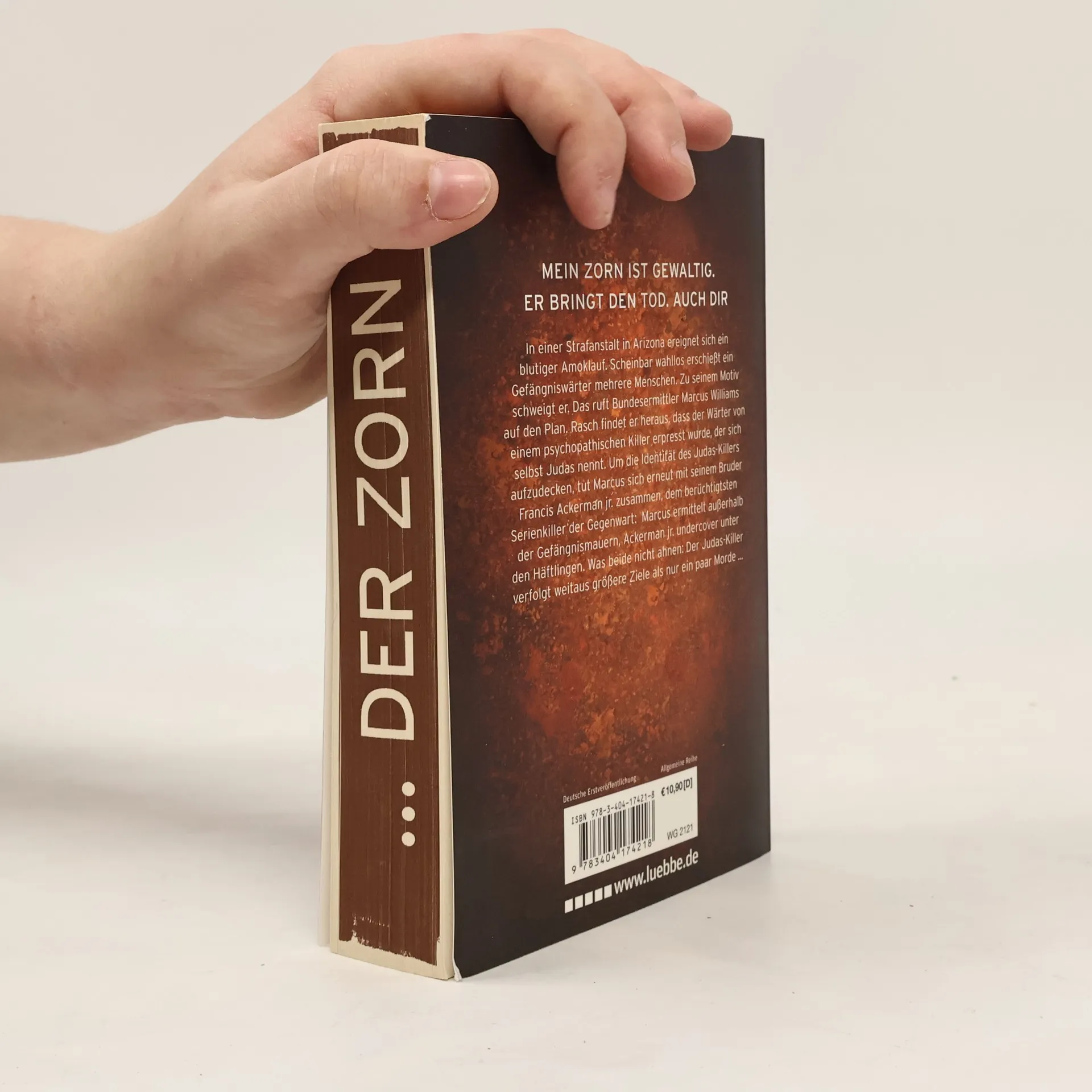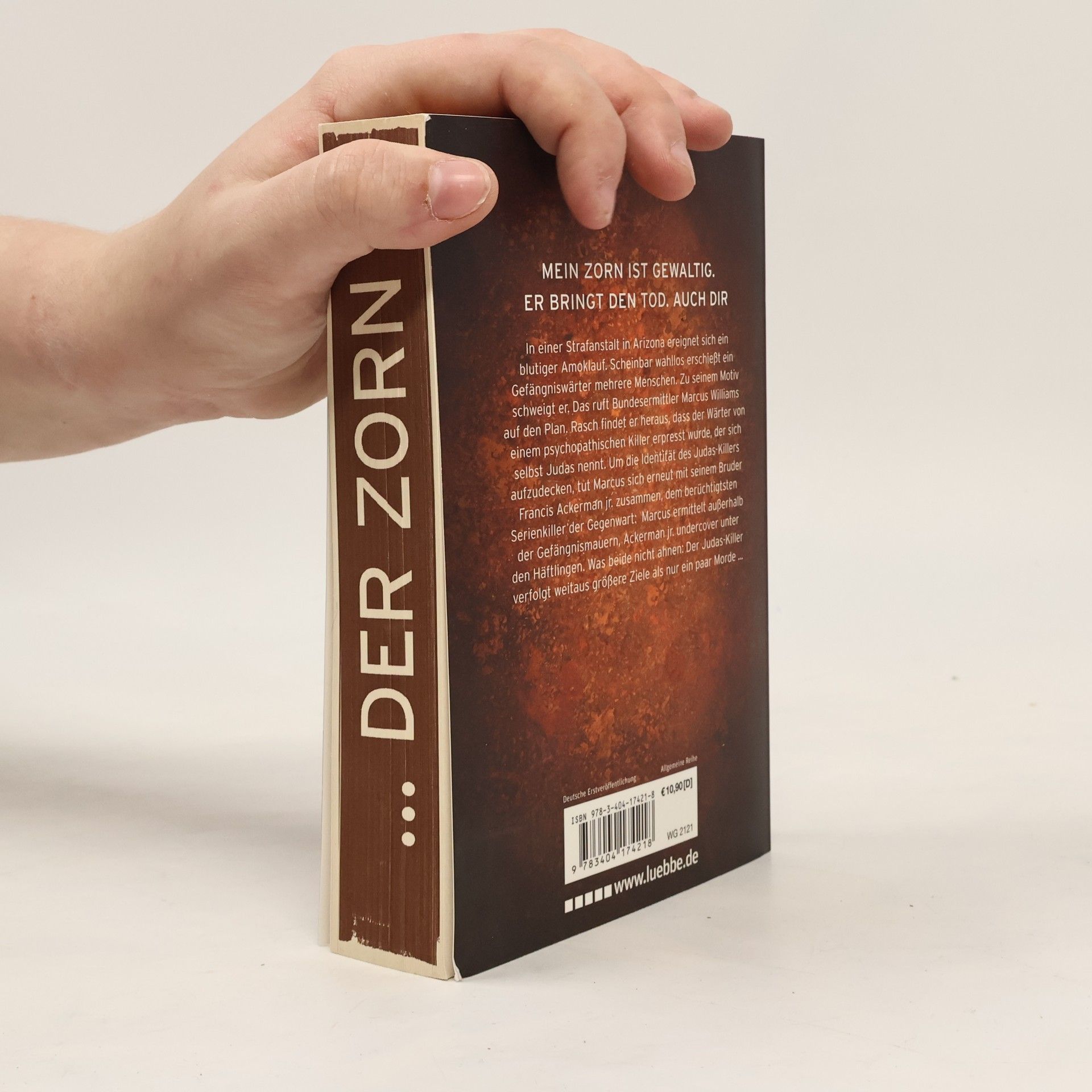 Der 4. Band der Bestseller-Reihe um den Serienkiller Francis Ackerman junior Mein Zorn ist gewaltig. Er bringt den Tod. Auch dir. In einer Strafanstalt in Arizona ereignet sich ein blutiger Amoklauf. Scheinbar wahllos erschießt ein Gefängniswärter mehrere Menschen. Zu seinem Motiv schweigt er. Das ruft Bundesermittler Marcus Williams auf den Plan. Rasch findet er heraus, dass der Wärter von einem psychopathischen Killer erpresst wurde, der sich selbst Judas nennt. Um die Identität des Judaskillers aufzudecken, tut Marcus sich erneut mit seinem Bruder Francis Ackerman junior zusammen, dem berüchtigtsten Serienkiller der Gegenwart: Marcus ermittelt außerhalb der Gefängnismauern, Ackerman junior undercover unter den Häftlingen. Was beide nicht ahnen: Der Judaskiller verfolgt weitaus größere Ziele als nur ein paar Morde ...