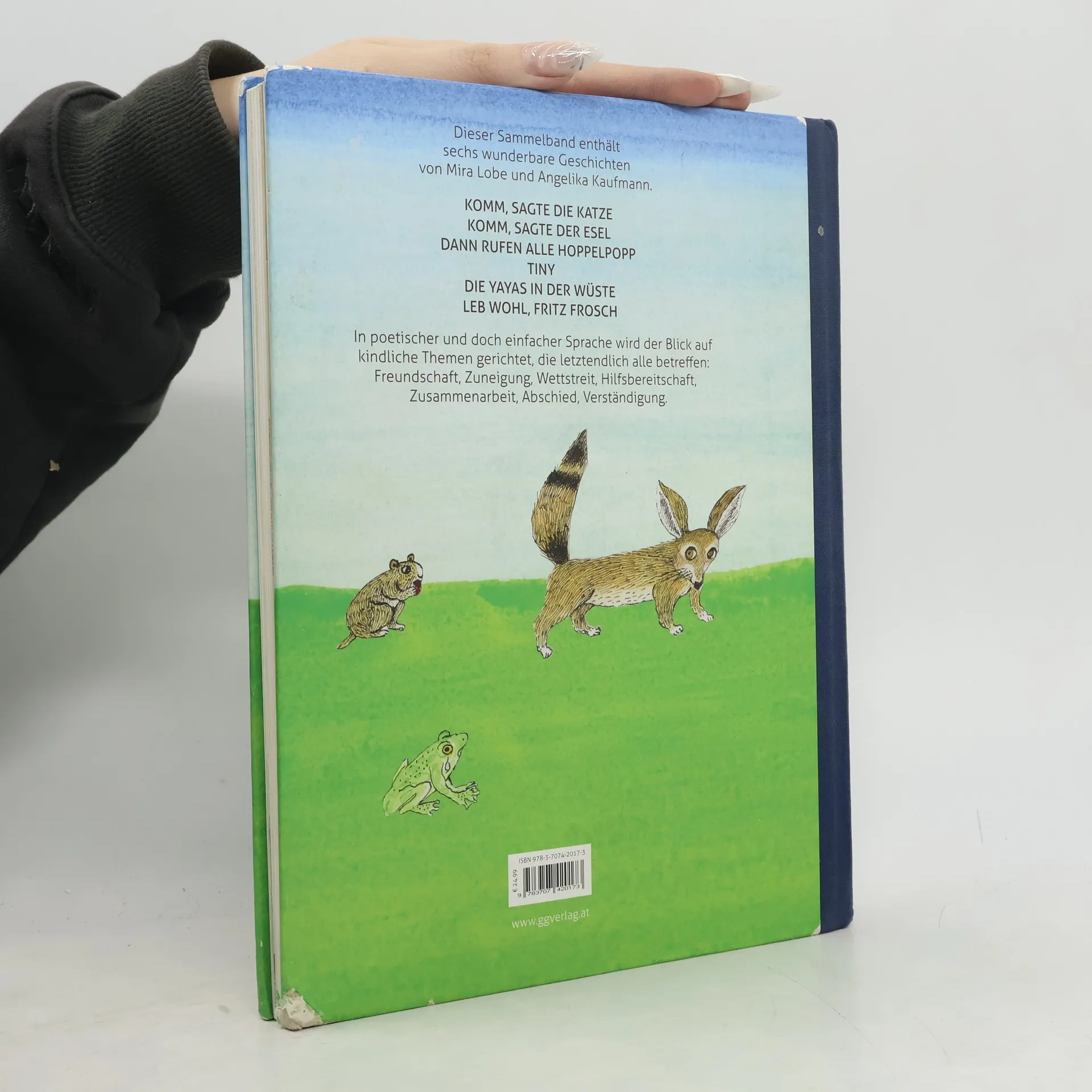 Sechs wunderbare Geschichten aus der Feder von Mira Lobe. Illustriert von Angelika Kaufmann. Geschichten im Buch: Komm, sagte die Katze Komm, sagte der Esel Dann rufen alle Hoppelpopp Tiny Die Yayas in der Wüste Leb wohl, Fritz Frosch