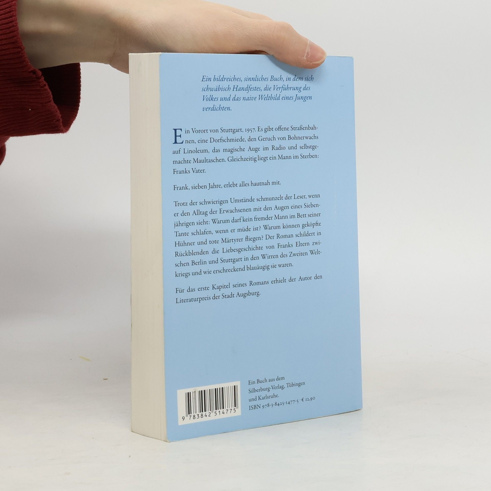 Ein Vorort von Stuttgart, 1957: Es gibt offene Straßenbahnen, eine Dorfschmiede, den Geruch von Bohnerwachs auf Linoleum, das magische Auge im Radio und selbstgemachte Maultaschen. Gleichzeitig liegt ein Mann im Sterben: Franks Vater. Frank, sieben Jahre, Schulanfänger, erlebt alles hautnah mit. Trotz der schwierigen Umstände schmunzelt der Leser, wenn er den seltsamen Alltag der Erwachsenen mit den Augen eines Siebenjährigen sieht: Warum darf kein fremder Mann im Bett von Franks Tante schlafen, wenn er müde ist? Was geschieht eigentlich mit dem toten Mädchen, das in der Leichenhalle liegt und mitten in dem Blumenmeer wie Schneewittchen aussieht? Was hat ein heimlicher Nazi 1957 im Haus der jungen Witwe verloren? Rückblenden schildern die Liebesgeschichte von Franks Eltern, Arnold und Elisabeth, zwischen Berlin und Stuttgart in den Wirren des Zweiten Weltkriegs und ihre erschreckend blauäugige Sicht auf das »Dritte Reich«.