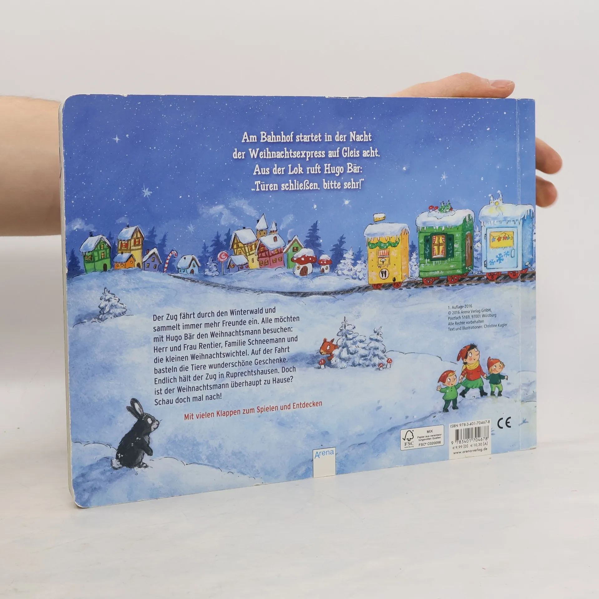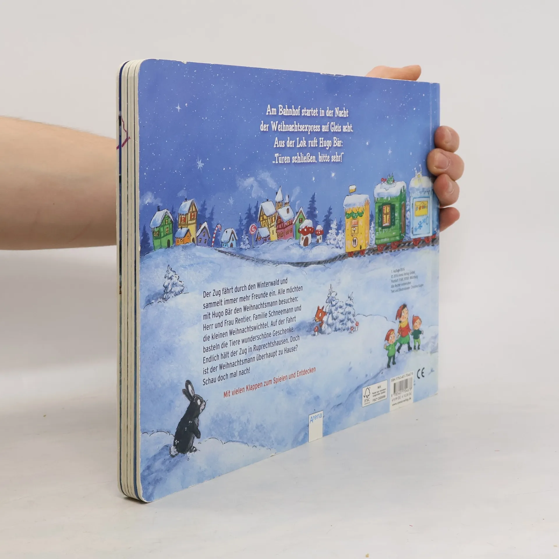 Wo wohnt eigentlich der Weihnachtsmann? Hugo Bär möchte ihn unbedingt besuchen! Und schon saust der Weihnachtsexpress durch den Winterwald. An jeder Station steigen neue Freunde ein: Herr und Frau Rentier, Familie Schneemann und die kleinen Weihnachtswichtel. Endlich hält der Zug in Ruprechtshausen. Doch ist der Weihnachtsmann überhaupt zu Hause?