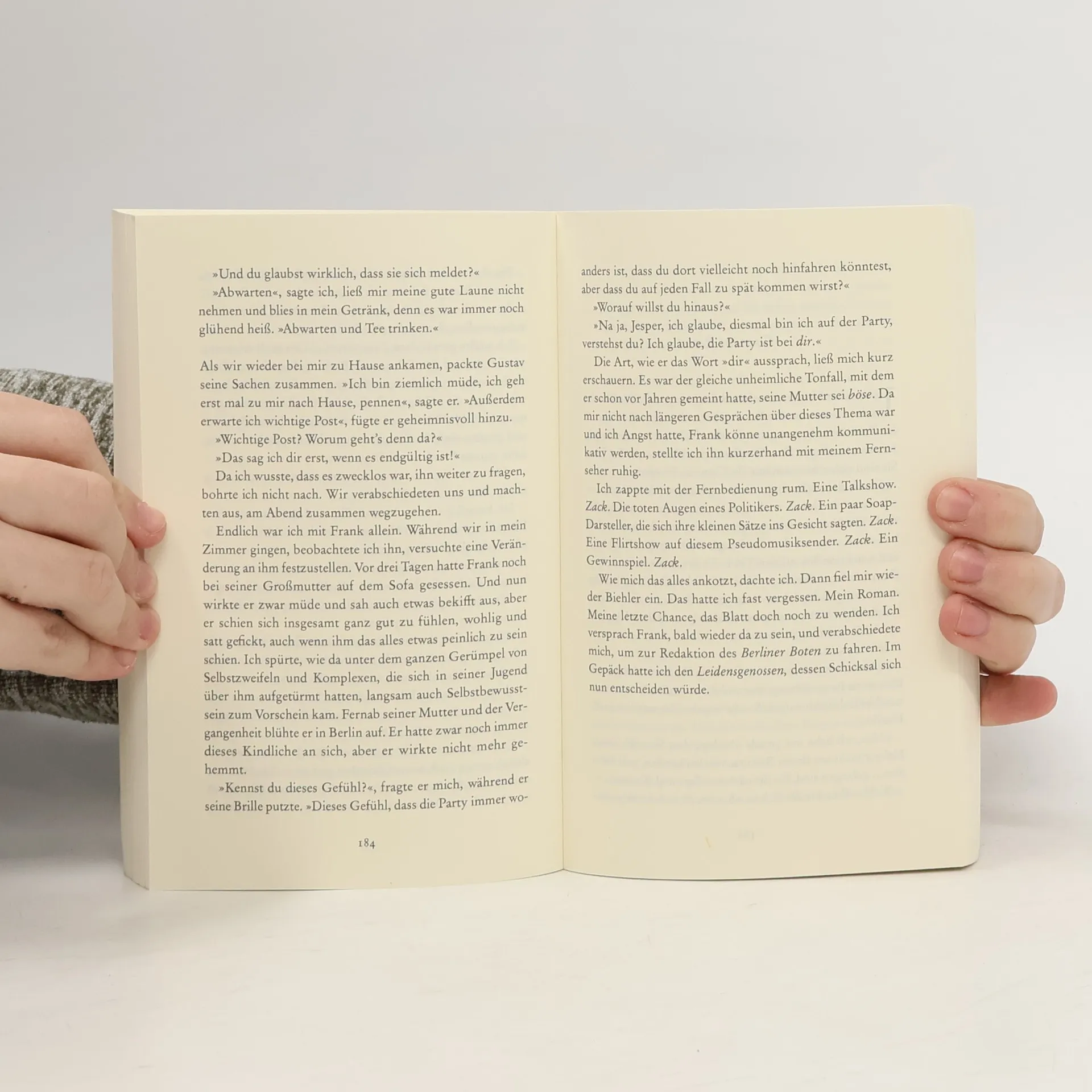 Verlagstext "Ich habe keine Angst vor der Zukunft, verstehen Sie? Ich hab nur 'n kleines bisschen Angst vor der Gegenwart." Jesper Lier, 20, ist voller Erwartungen nach Berlin gekommen: Er hofft auf ein aufregendes Leben in der Stadt der Verheißungen und auf einen fulminanten Start als Schriftsteller. Stattdessen haust er in einem Kellerloch am Prenzlauerberg, sein Roman ›Der Leidensgenosse‹ ist zu einem Monstrum angeschwollen, und seine Aversion gegen die Gesellschaft und die sich selbst feiernde Stadt hat ihn zum Einzelgänger gemacht. Jesper konsumiert im Wechsel Alkohol und Schlaftabletten und entwickelt bedrohliche Tagträume. Bis seine Freunde Gustav und Frank bei ihm aufkreuzen und ihn aus seiner Einsamkeit reißen. Eine verrückte Woche lang erleben die drei eine rauschhafte Odyssee durch Berlin, bei der Jesper nicht nur das Mädchen seiner Träume über den Weg läuft, sondern viele schräge Gestalten und sogar seine eigenen Romanfiguren. Und die meinen es nicht immer gut mit ihrem Autor.
