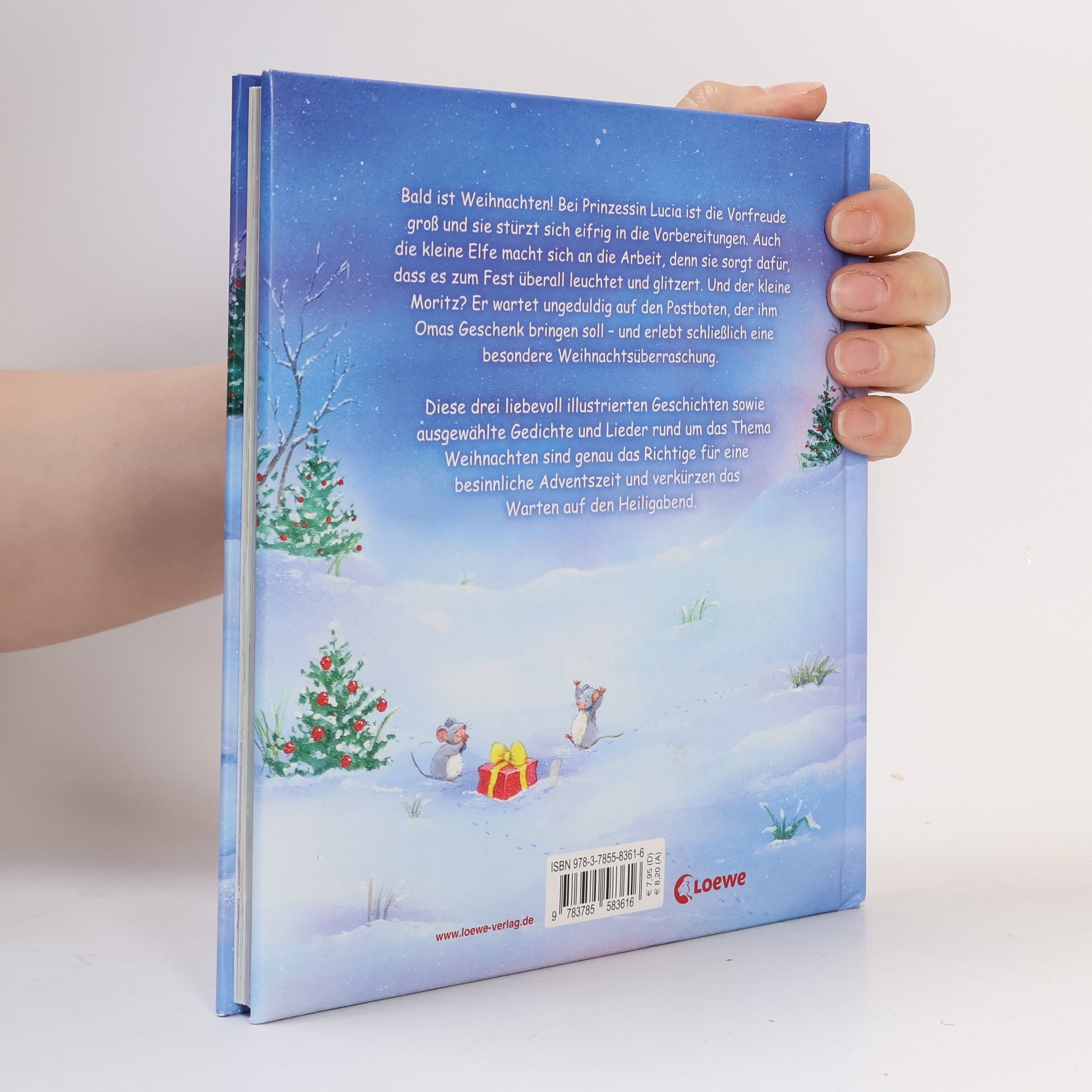 Bald ist Weihnachten! Bei Prinzessin Lucia ist die Vorfreude groß und sie stürzt sich eifrig in die Vorbereitungen. Auch die kleine Elfe macht sich an die Arbeit, denn sie sorgt dafür, dass es zum Fest überall leuchtet und glitzert. Und der kleine Moritz? Er wartet ungeduldig auf den Postboten, der ihm Omas Geschenk bringen soll – und erlebt schließlich eine besondere Weihnachtsüberraschung. Drei Bücher rund um das Thema Weihnachten in einem Sammelband , geschrieben von Annette Moser und Sandra Grimm , mit liebevollen Illustrationen von Marina Krämer . Er enthält die drei beliebten Bücher Die kleine Elfe und der Weihnachtszauber , Die kleine Prinzessin feiert Weihnachten und Die schönste Weihnachtsüberraschung sowie ausgewählte Gedichte und Lieder . Das ideale Weihnachtsgeschenk zum gemütlichen Vorlesen und Kuscheln .