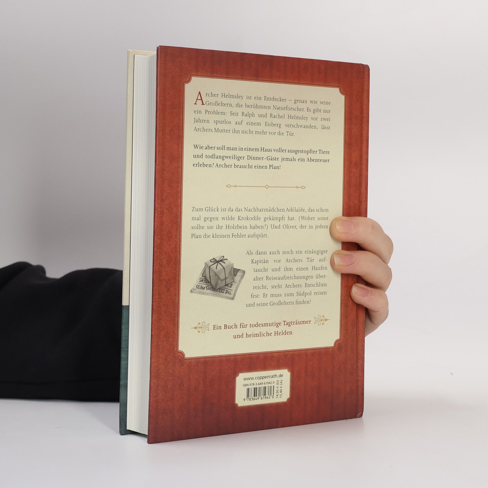 Archer Helmsley ist ein Entdecker – genau wie seine Großeltern, die berühmten Naturforscher. Es gibt nur ein Problem: Seit Ralph und Rachel Helmsley vor zwei Jahren spurlos auf einem Eisberg verschwanden, lässt Archers Mutter ihn nicht mehr vor die Tür. Wie aber soll man in einem Haus voller ausgestopfter Tiere und todlangweiliger Dinner-Gäste jemals ein Abenteuer erleben? Archer braucht einen Plan! Zum Glück ist da das Nachbarmädchen Adélaïde, das schon mal gegen wilde Krokodile gekämpft hat. (Woher sonst sollte sie ihr Holzbein haben?) Und Oliver, der in jedem Plan die kleinen Fehler aufspürt. (Zum Beispiel, dass man ohne U-Boot und die Möglichkeit, das Haus zu verlassen, kein Tiefseeforscher werden kann.) Als dann auch noch ein einäugiger Kapitän vor Archers Tür auftaucht und ihm einen Haufen alter Reiseaufzeichnungen von Ralph und Rachel Helmsley überreicht, steht Archers Entschluss fest: Er muss zum Südpol reisen und seine Großeltern finden! Ein Buch für todesmutige Tagträumer und heimliche Helden