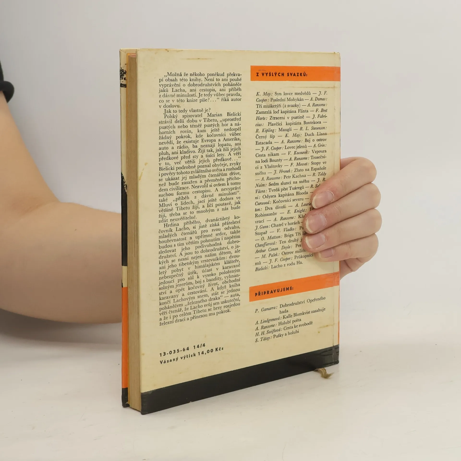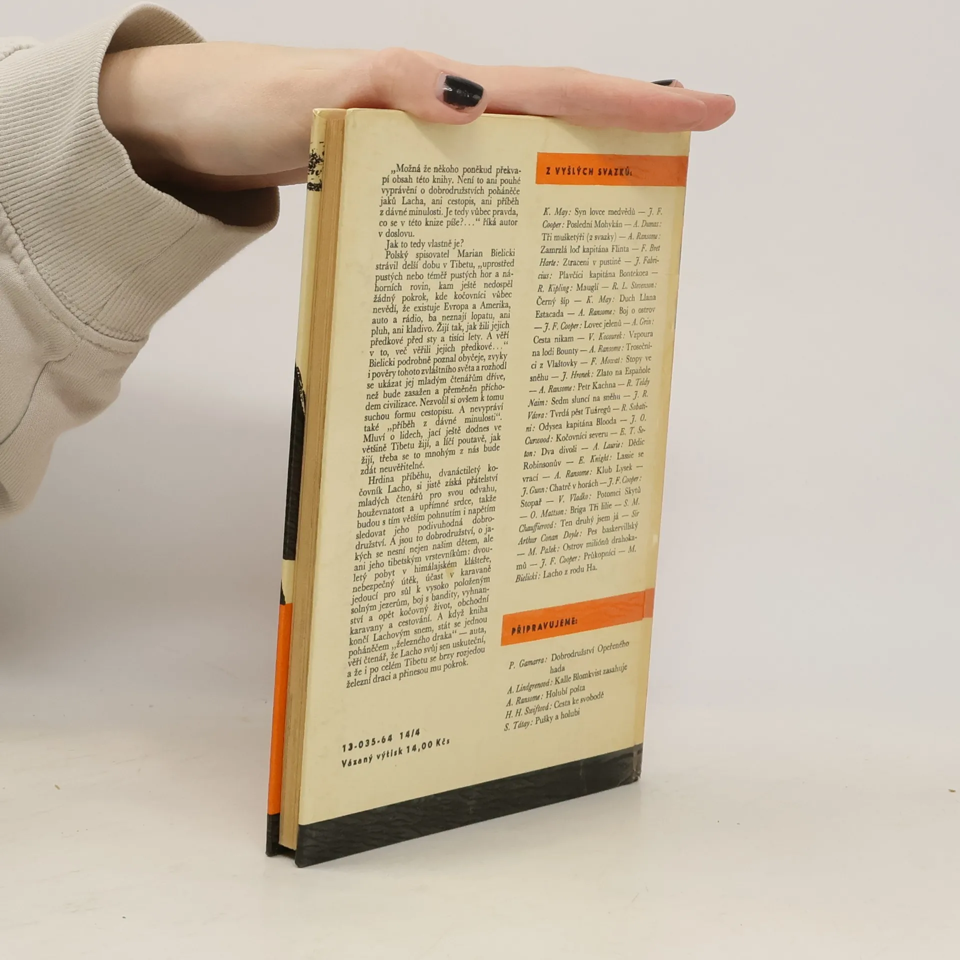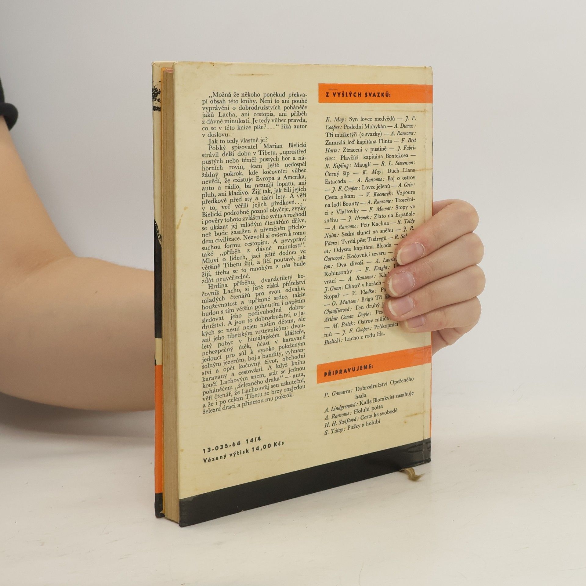 Hrdina příběhu, dvanáctiletý kočovník Lacho, si jistě získá přátelství mladých čtenářů pro svou odvahu, houževnatost a upřímné srdce, takže budou s tím větším pohnutím i napětím sledovat jeho podivuhodná dobrodružství. A jsou to dobrodružství, o jakých se nesní nejen našim dětem, ale ani jeho tibetským vrstevníkům: dvouletý pobyt v himálajském klášteře, nebezpečný útěk, účast v karavaně jedoucí pro sůl k vysoko položeným solným jezerům, boj s bandity, vyhnanství a opět kočovný život, obchodní karavany a cestování. A když kniha končí Lachovým snem, stát se jednou poháněčem „železného draka“ – auta, věří čtenář, že Lacho svůj sen uskuteční, a že i po celém Tibetu se brzy rozjedou železní draci a přinesou mu pokrok. 13-035-64