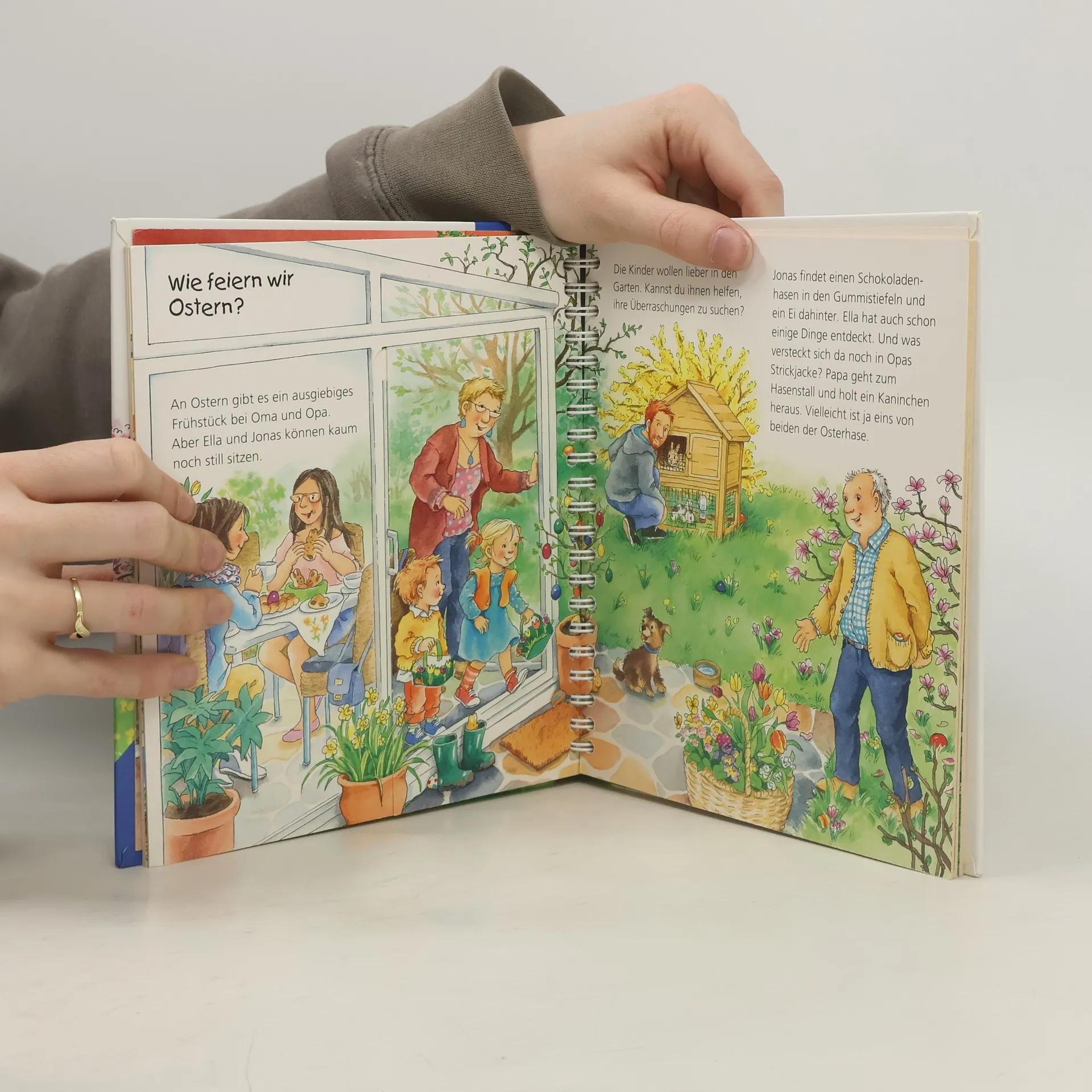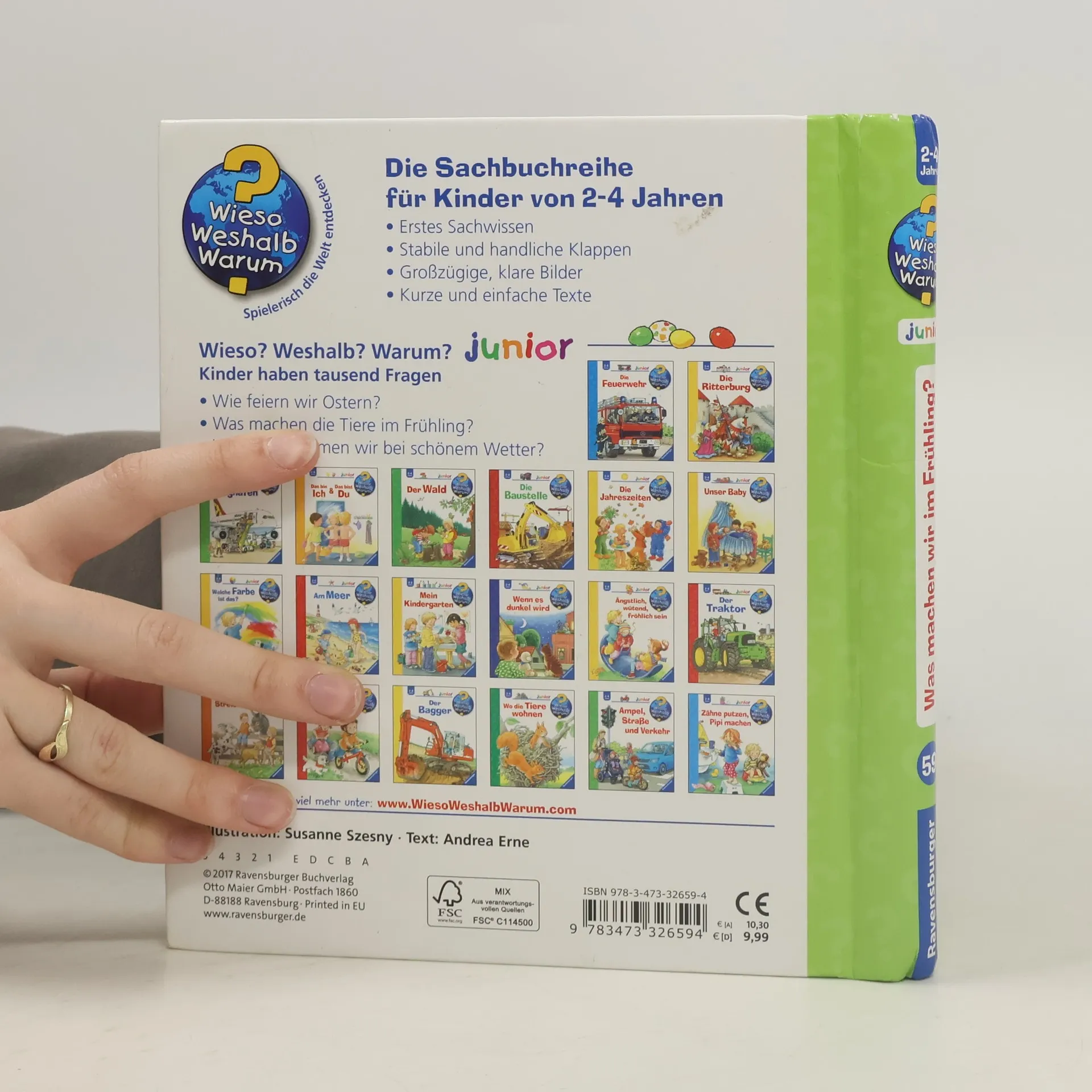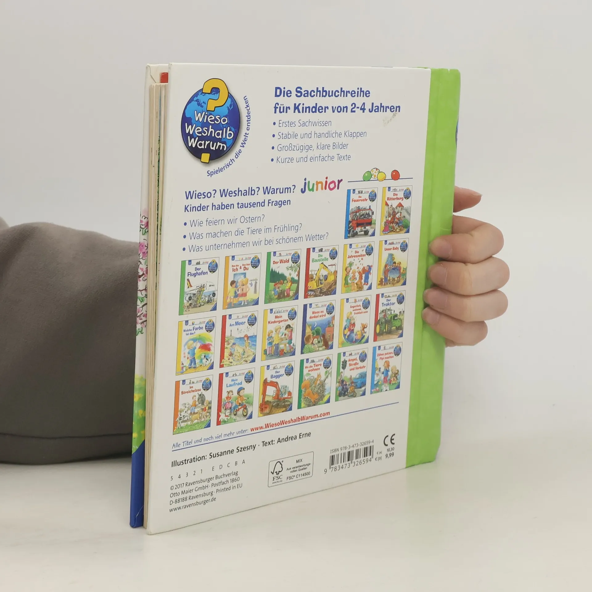 Endlich ist der Frühling da: Nun können die Zwillinge Ella und Jonas wieder im Garten und auf dem Spielplatz toben. Auch Blumen einpflanzen, Waldspaziergänge und Fahrradausflüge stehen auf dem Programm. Am meisten freuen sich die beiden aber auf Ostern und darauf, Eier zu bemalen, zu basteln und zu dekorieren. Und was machen wir im Sommer, Herbst und Winter? Das verraten die weiteren Bände dieser Jahreszeiten Serie von Wieso? Weshalb? Warum? Wieso? Weshalb? Warum? junior Die Sachbuchreihe für Kinder von 2-4 Jahren Jeden Tag entdecken Kinder etwas Neues – und haben viele Fragen. Wann kommt die Feuerwehr? Was machen die Tiere im Winter? Warum muss ich Zähne putzen? Die beliebte Sachbuchreihe Wieso? Weshalb? Warum? junior beantwortet die Fragen der Kinder auf Augenhöhe. Sie beleuchtet unterschiedlichste Themen aus ihrer Alltags- und Interessenswelt altersgerecht und mit viel Liebe zum Detail. Die Reihe ist speziell auf kleine Hände und die Bedürfnisse der Kleinsten angepasst. Klare und liebevolle Bilder, kurze Sachtexte sowie handliche Klappen, die Bewegungen veranschaulichen und überraschende und lustige Einblicke gewähren, ermöglichen Kindern, sich ihre Themen selbst zu erschließen. Der Spaß am eigenhändigen Entdecken, die liebevolle Umsetzung und die hochwertige Ausstattung garantieren langanhaltende Freude an jedem Buch.