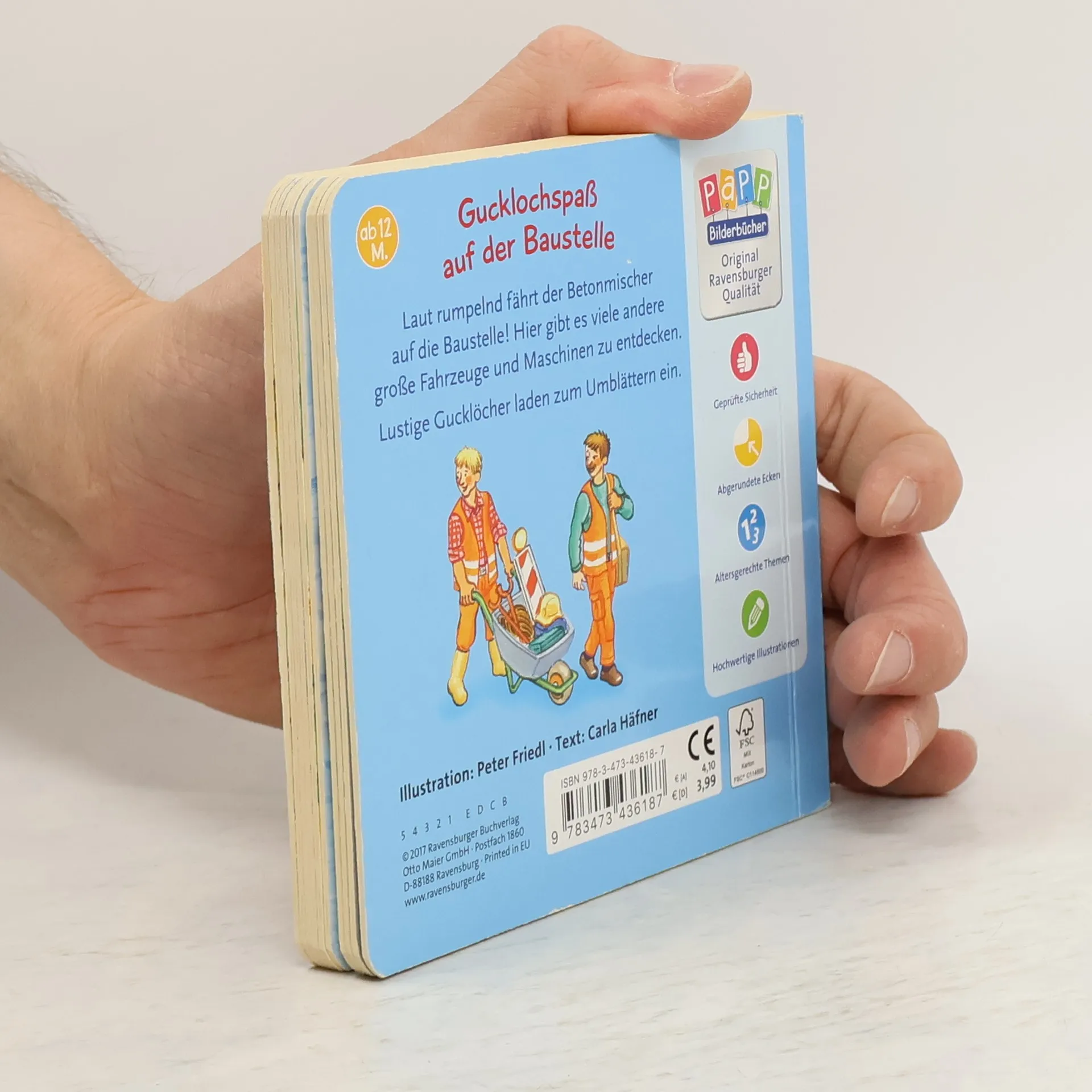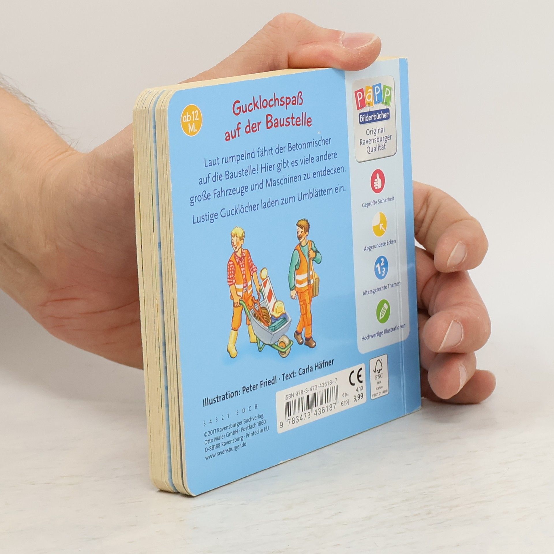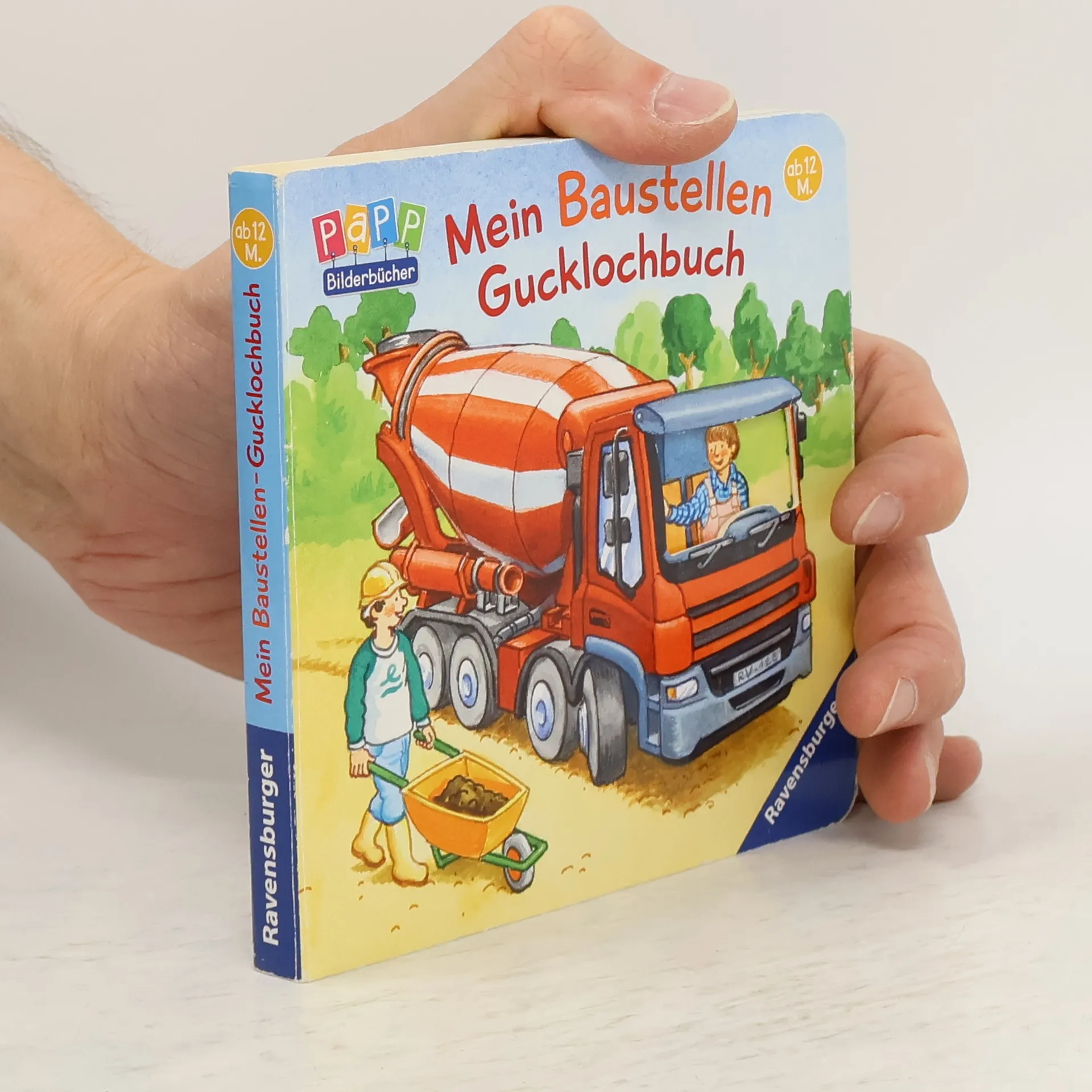 Laut rumpelnd fährt der Betonmischer auf die Baustelle! Hier gibt es jede Menge große Fahrzeuge und viele Maschinen zu sehen. Lustige Gucklöcher ermöglichen immer wieder einen neuen Blick auf die Arbeiten. Ein ideales Buch für alle kleinen Bauarbeiter: hier sind sie alle versammelt: der Betonmischer, der Bagger, der Kran und all die anderen großen Baufahrzeuge. Die durchgestanzten Gucklöcher sind ein schöner Zusatzeffekt, der immer wieder zum hin und her blättern auffordert.
