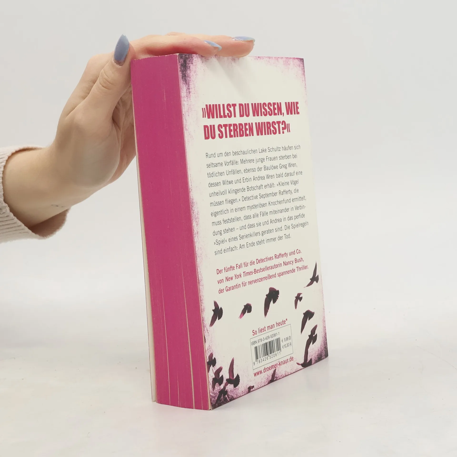 In dem Thriller „Dafür musst du sterben“ von der amerikanischen Bestseller-Autorin Nancy Bush haben es die junge Witwe Andrea Wren und Privatdetektiv Luke Denton mit einem machtbesessenen Serienkiller und seinem makabren, todbringenden „Spiel“ zu tun. Wie im Vorgänger-Thriller „Dafür wirst du leiden“ übernimmt Detective September Rafferty vom Laurelton Police Department die Ermittlungen – doch wird sie das alles entscheidende Endgame gewinnen? „Ein Pageturner voller Hochspannung und Intrigen“ (Romantic Times Book Reviews)! Rund um den beschaulichen Lake Schultz in Oregon häufen sich seltsame Vorfälle: Mehrere junge Frauen sterben bei tödlichen Unfällen, und auch der Baulöwe Greg Wren kommt ums Leben. Als dessen Witwe Andrea Wren die Firma übernimmt, erhält sie eine unheilvoll klingende Botschaft: „Kleine Vögel müssen fliegen“. Aus Angst schaltet Andi den Privatdetektiv Luke Denton ein, der mit Hochdruck nach einer Spur sucht, während die Zahl der Leichen weiter zunimmt. Detective September Rafferty vom Laurelton Police Department steckt zur gleichen Zeit mitten in den Ermittlungen zu einem mysteriösen Knochenfund in einem Haus in der Nähe des Sees. Es ist fast zu spät, als sie die Zusammenhänge zwischen den Fällen erkennt und feststellen muss, dass sie, ohne es zu wissen, das „Spiel“ eines perfiden Serienkillers mitspielt, der aller Welt seine Genialität beweisen will. Gelingt es ihr, das Mastermind zu besiegen?