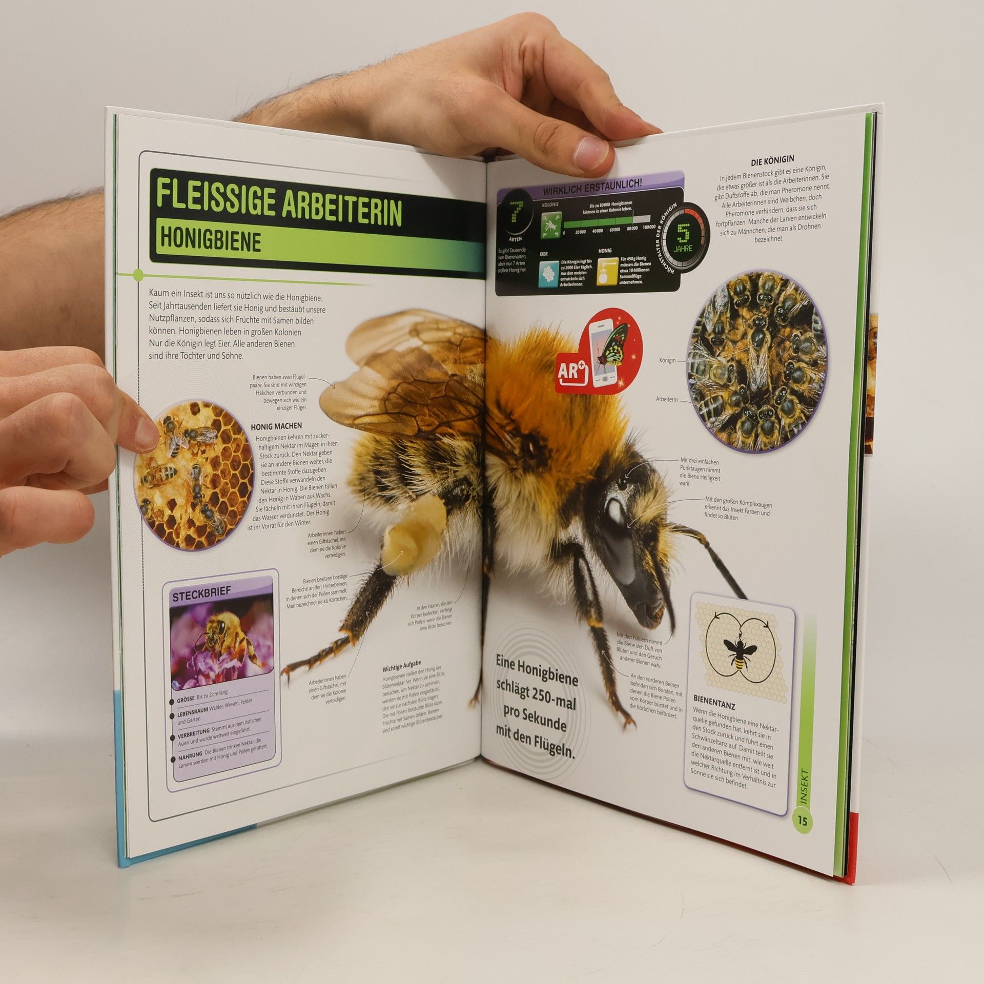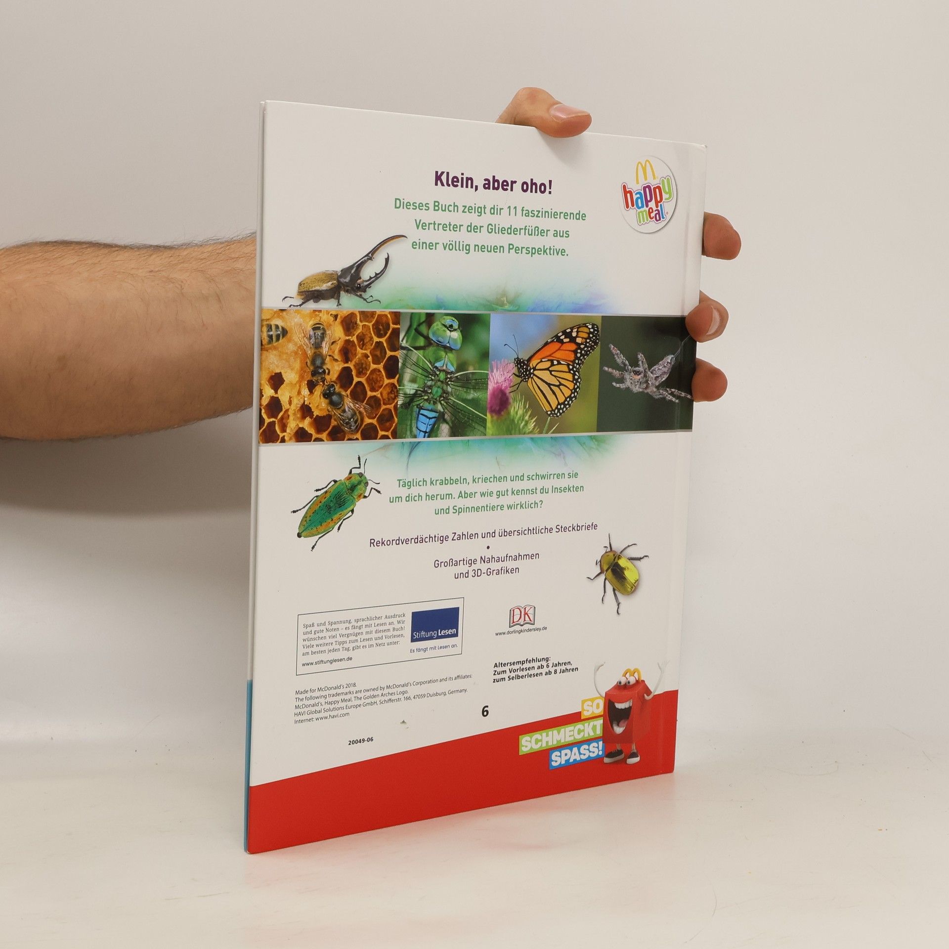 Kleine Tierchen ganz groß – in diesem Buch findet ihr alles was krabbelt, kriecht und herumschwirrt! Beeindruckende Makrofotografien in doppelseitigen Porträts zeigen über 100 Insekten ganz nah und enthüllen dabei ihre faszinierenden Fähigkeiten sowie ihr cleveres Jagdverhalten. In realistischen 3-D-Grafiken könnt ihr verblüffende anatomische Details und Besonderheiten von riesigen Vogelspinnen, vielbeinigen Tausendfüßern oder mikroskopisch kleinen Zwergwespen entdecken. Schaut genau hin, denn so detailliert habt ihr die interessanten Krabbeltierchen noch nie gesehen! Oder habt ihr zuvor schon mal in die riesigen dunklen Komplexaugen einer Libelle oder in das glühende Leuchtorgan eines Glühwürmchens geblickt? In ungewöhnlichen Rekorden und spannenden Forschungsdaten erfahrt ihr, dass ein Morphofalter eine Flügelspannweite von bis zu 20 cm erreichen und dass eine Wanderameisen-Kolonne bis zu 100m lang sein kann. Einfach unglaublich, oder? Dieses Buch ist bei Antolin.de verfügbar.