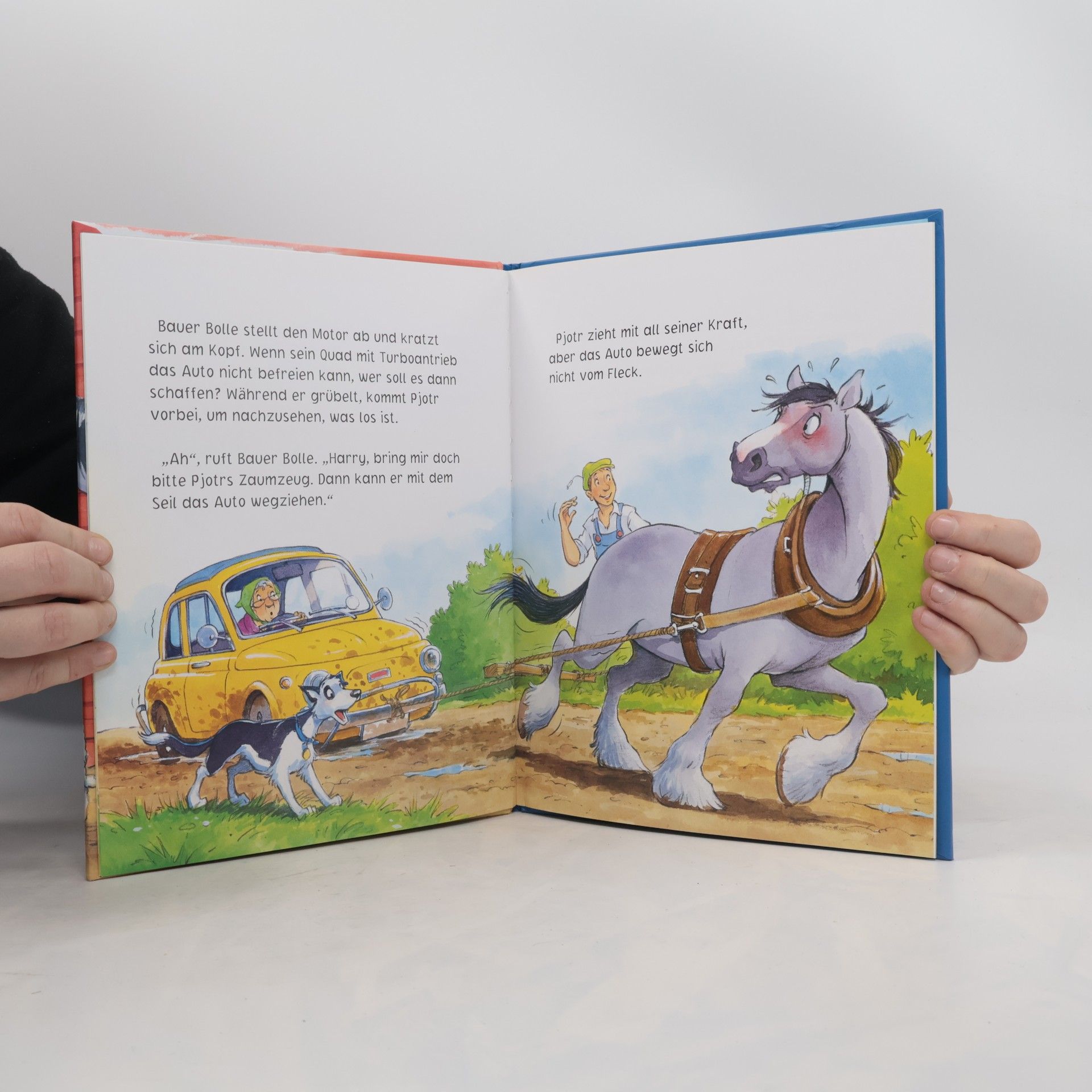 Lustige Bauernhofgeschichte zum Vorlesen und Mitlachen! • Bauer Bolle findet immer eine Lösung: Eine spannende Geschichte mit lustiger Erfindung und überraschender Wendung! • Liebenswerte Bauernhof-Bewohner: ein freundlicher Bauer, ein roter Traktor und jede Menge lustige Tiere! • Umschlag extraknuffig für kleine Kinderhände und mit edlem Glanzeffekt In diesem liebenswert und kunterbunt illustrierten Bilderbuch erwartet Kinder ein weiteres lustiges Abenteuer mit Bauer Bolle und seinen Tieren. Die Aufregung ist groß: Bauer Bolles neues Quad ist endlich da – und es ist besser als jeder Traktor. Aber kann es auch das Auto von Tante Hilde aus dem Matsch ziehen? Keine Bange – Bauer Bolle hat eine Idee! Dem beliebten Zeichner Steve Smallman gelingt es ganz wunderbar, die liebenswerten Charaktere seiner Bauernhofgeschichten mit leichtem Strich und viel Humor kindgerecht und mit starkem Ausdruck aufs Papier zu bringen. Kinder freuen sich auf ein Wiedersehen mit dem treuen Hirtenhund Harry, Fred, dem frechen Ferkel, und Pjotr, Bauer Bolles starkem Pferd. Wer kann die lustige Scherzfrage am Anfang des Buches beantworten? Die letzte Seite verrät die Lösung - aber erst einmal sollte man natürlich selbst überlegen!