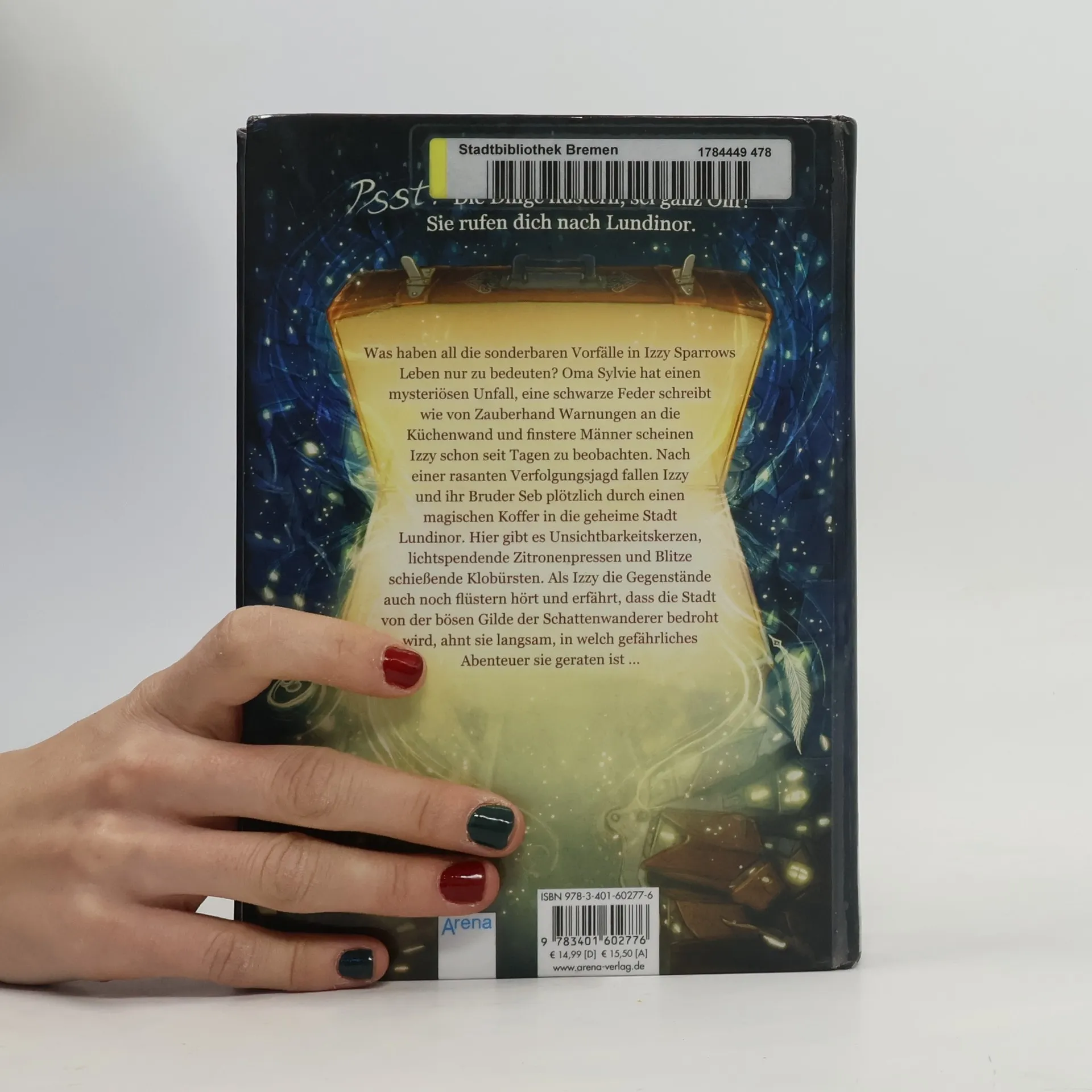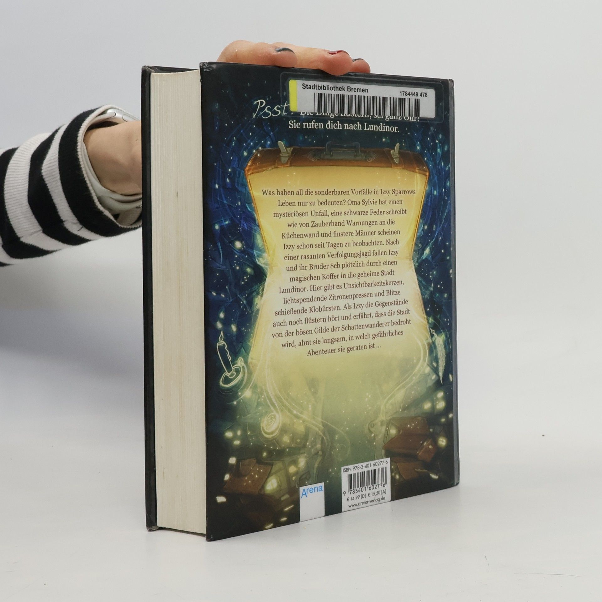 Was haben diese Vorfälle bloß zu bedeuten, die Izzy Sparrows Leben durcheinanderbringen? Ihre Oma hat einen mysteriösen Unfall, eine schwarze Feder schreibt wie von Zauberhand Warnungen an die Küchenwand und finstere Männer jagen sie und ihren Bruder Seb. In letzter Sekunde können sie ihre Verfolger abschütteln - und entdecken die magische Stadt Lundinor. Doch sind sie wirklich zufällig dort gelandet? Als Izzy plötzlich ganz normale Alltagsgegenstände flüstern hört und die böse Gilde der Klage die ganze Stadt bedroht, ahnt sie noch nicht, in welch gefährliches Abenteuer sie geraten ist…