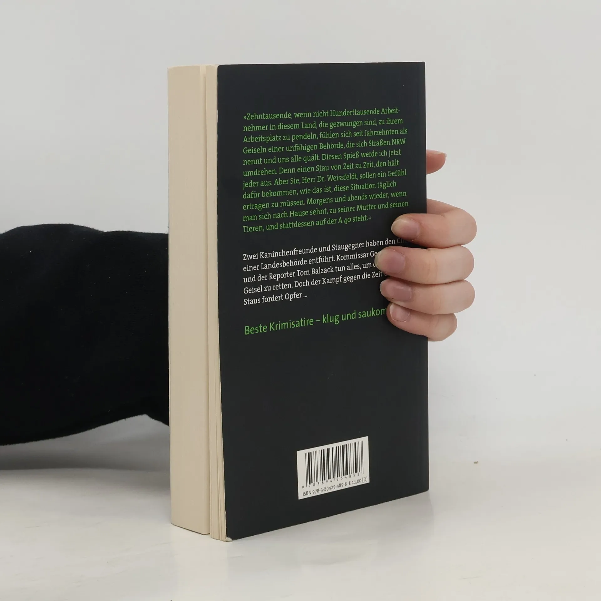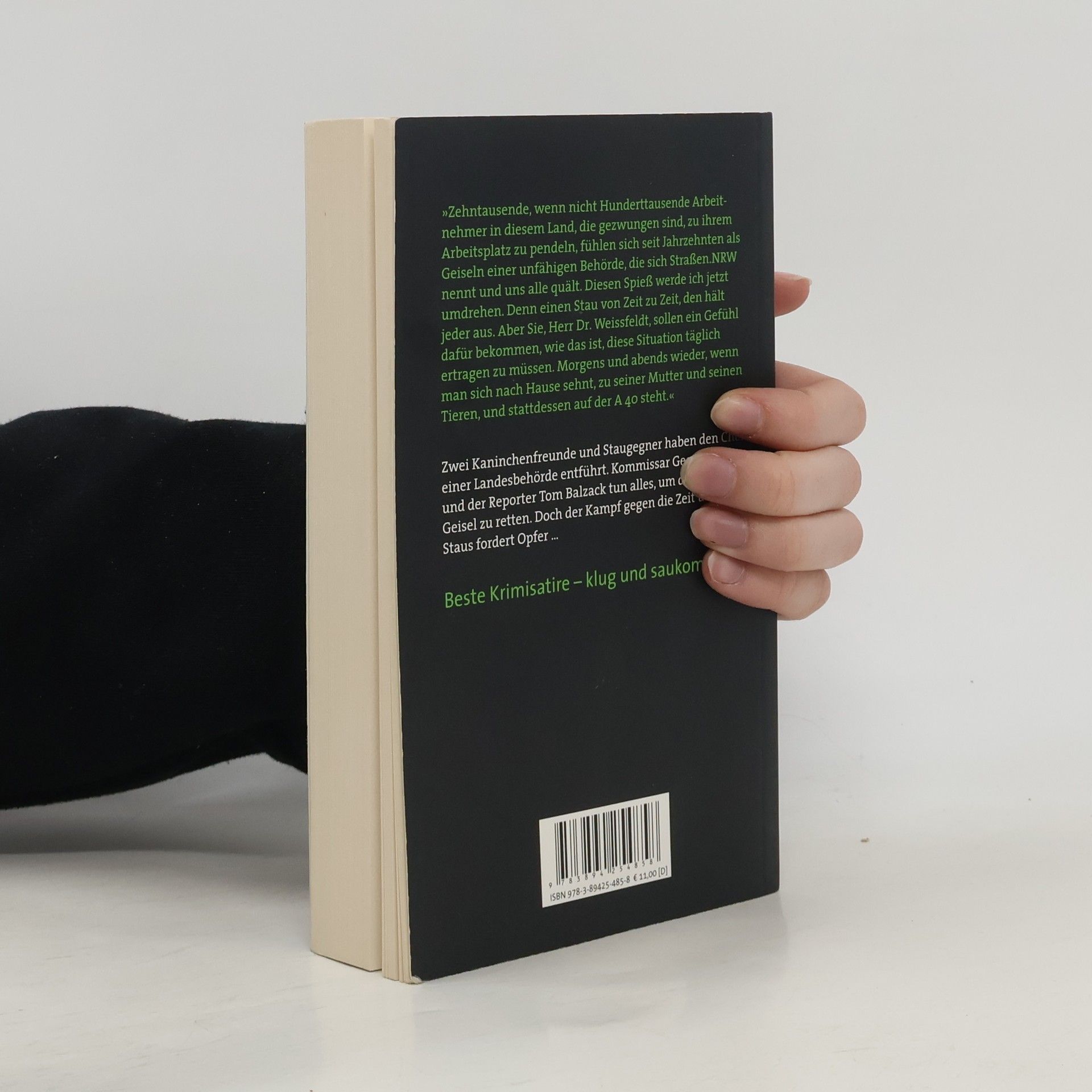 In den letzten vier Jahren hat er 209 Stunden im Stau gestanden – sinnlos vergeudete Lebens- und Leidenszeit. Gemeinsam mit einem Kumpel entführt Klaus-Werner Lippermann Dr. Rainer Weissfeldt, den Chef des Straßenbaubetriebs Straßen. NRW. Der soll am eigenen Leib erfahren, wie das ist, täglich über die A 40 zur Arbeit fahren zu müssen. Zugleich erhält die Polizei Post: Der TuS-V! (Tierfreunde und Staugegner – Vereinigt!) fordert Maßnahmen zur Verkehrsflussverbesserung, 55.000 Euro und die Aufklärung sogenannter Kaninchenmorde. Kommissar Georg Schüppe ist ernsthaft besorgt um das Leben des Topmanagers, denn diese Entführer ticken offensichtlich nicht normal. Und mit jedem Tag wächst die Gefahr, dass die Öffentlichkeit von Weissfeldts Schicksal erfährt. Tatsächlich wird Reporter Tom Balzack bald misstrauisch, stolpert aber über eine ganz andere Leiche … Beste Krimisatire – klug und saukomisch!