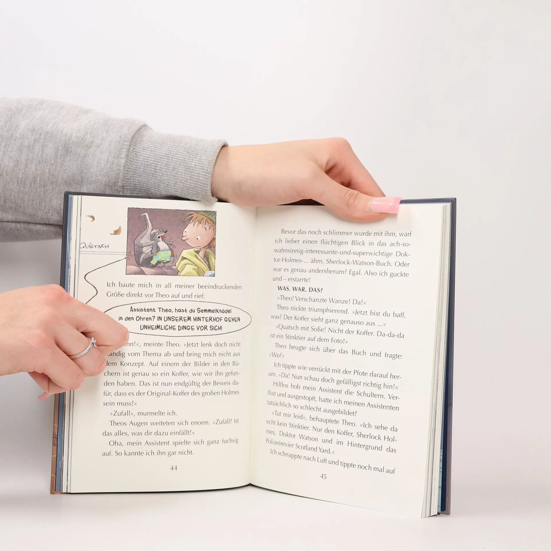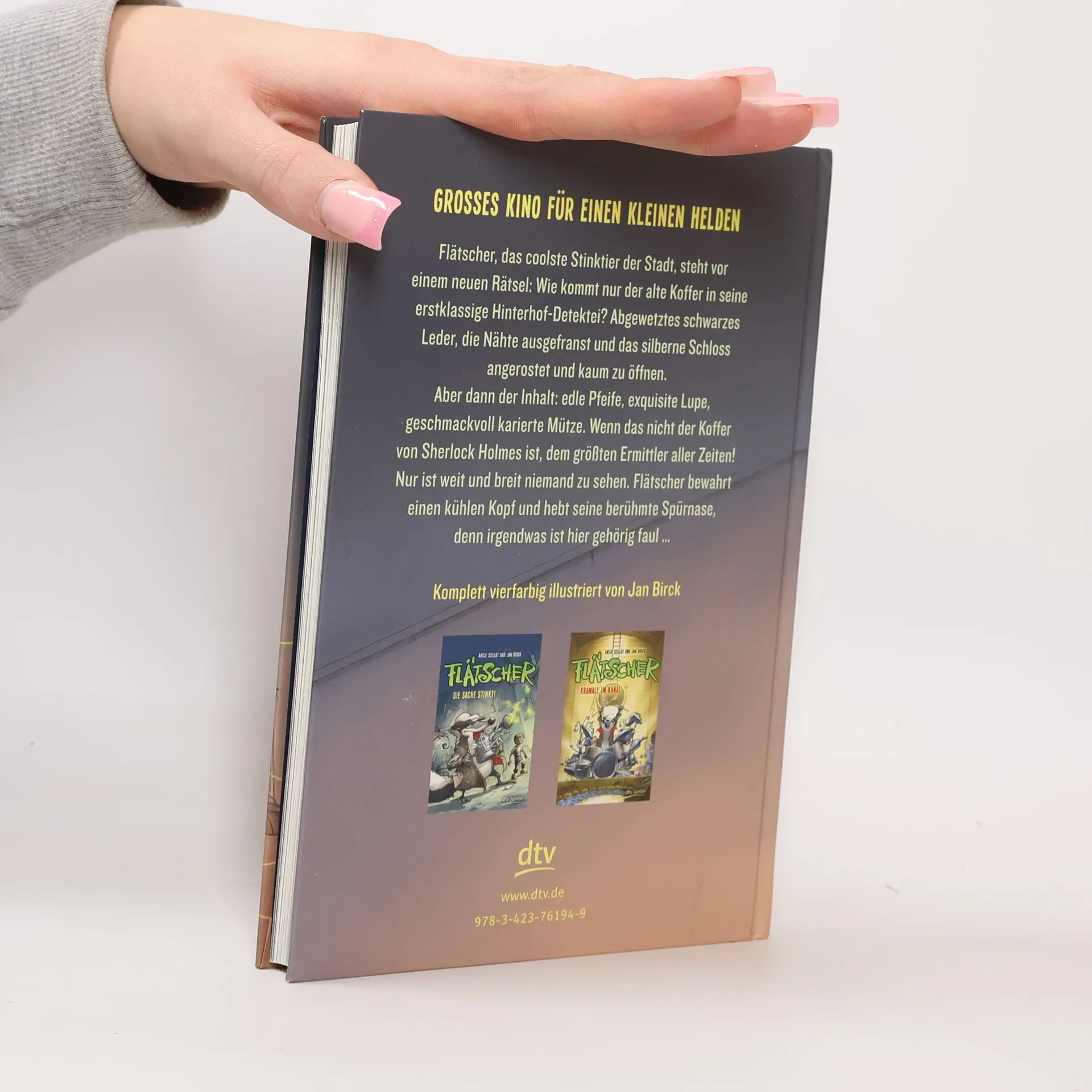 Neues aus der Hinterhof-Detektei Flätscher Flätscher, das coolste Stinktier der Stadt, steht vor einem neuen Rätsel: Wie kommt nur der alte Koffer in seine erstklassige Hinterhof- Detektei? Abgewetztes schwarzes Leder, die Nähte ausgefranst und das silberne Schloss angerostet und kaum zu öffnen. Aber dann der Inhalt: edle Pfeife, exquisite Lupe, geschmackvoll karierte Mütze. Wenn das nicht der Koffer von Sherlock Holmes, dem größten Ermittler aller Zeiten, ist. Nur ist weit und breit niemand zu sehen. Flätscher bewahrt einen kühlen Kopf und hebt seine berühmte Spürnase, denn irgendwas ist hier gehörig faul. Zu diesem Buch finden Sie Quizfragen auf antolin. de