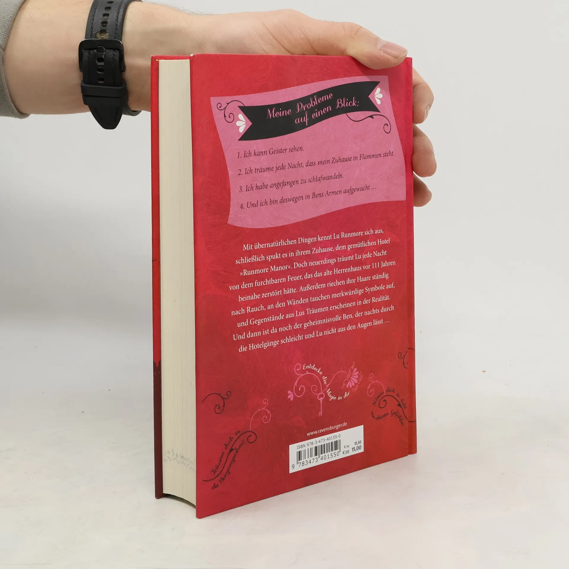 Mit übernatürlichen Dingen kennt Lu Runmore sich aus, schließlich spukt es in ihrem Zuhause, dem gemütlichen Hotel „Runmore Manor“. Doch neuerdings träumt Lu jede Nacht von dem furchtbaren Feuer, das das alte Herrenhaus vor 111 Jahren beinahe zerstört hätte. Außerdem riechen ihre Haare ständig nach Rauch, an den Wänden tauchen merkwürdige Symbole auf, und Gegenstände aus Lus Träumen erscheinen in der Realität. Und dann ist da noch der geheimnisvolle Ben, der nachts durch die Hotelgänge schleicht und Lu nicht aus den Augen lässt ...