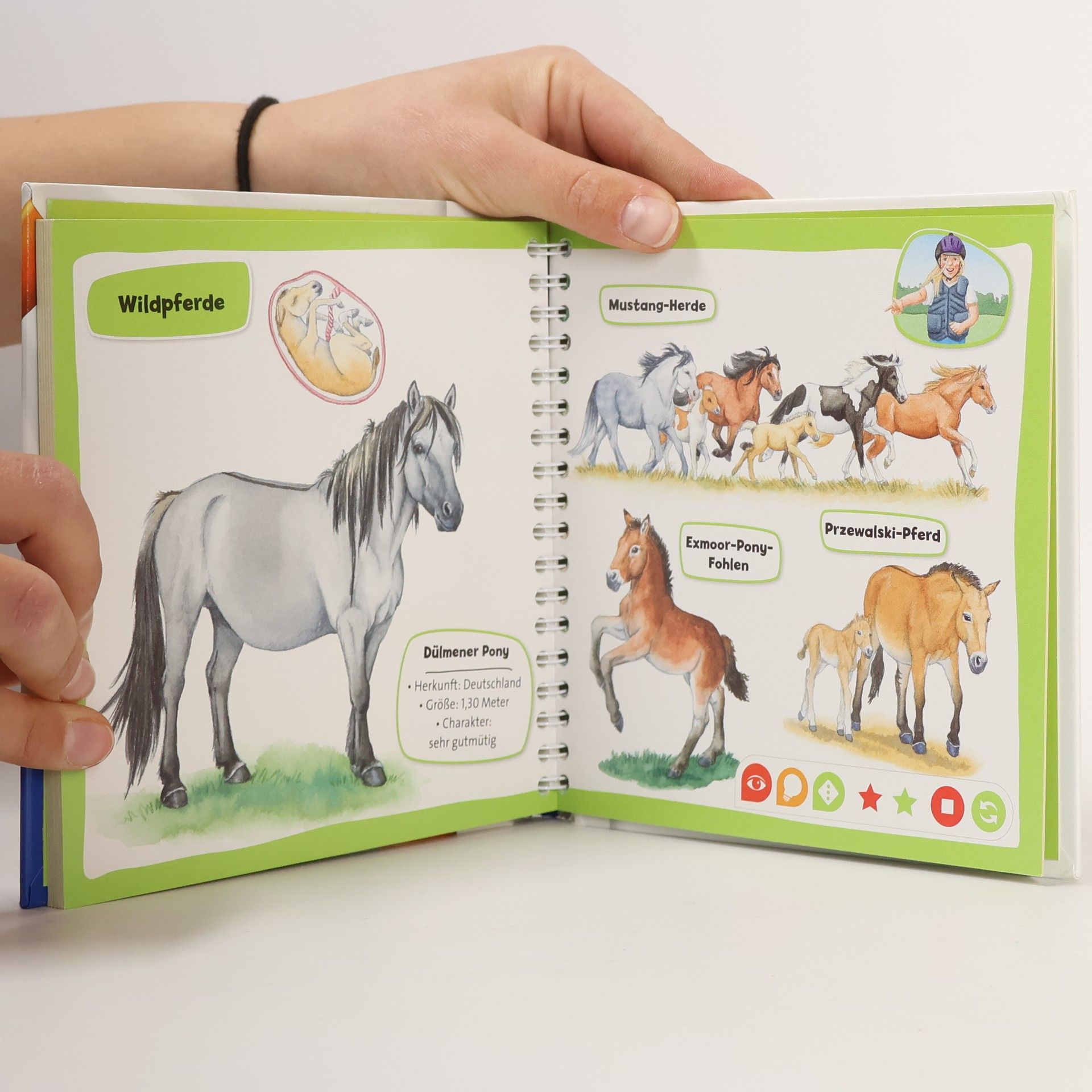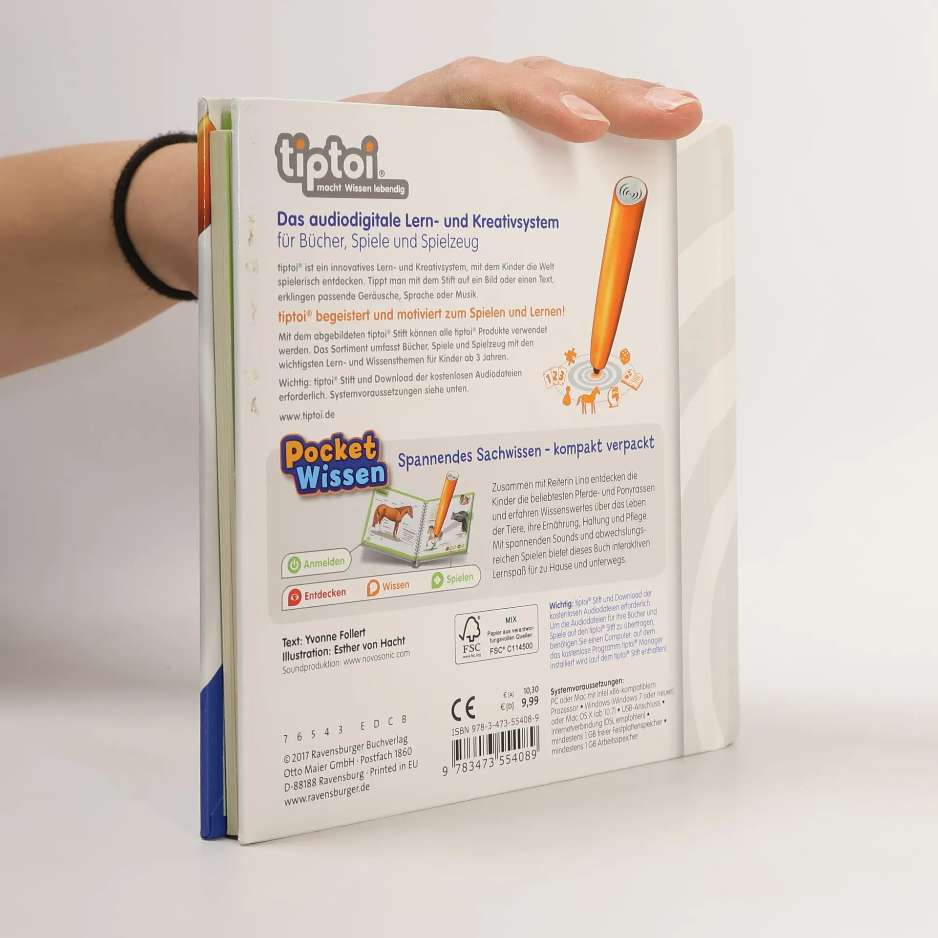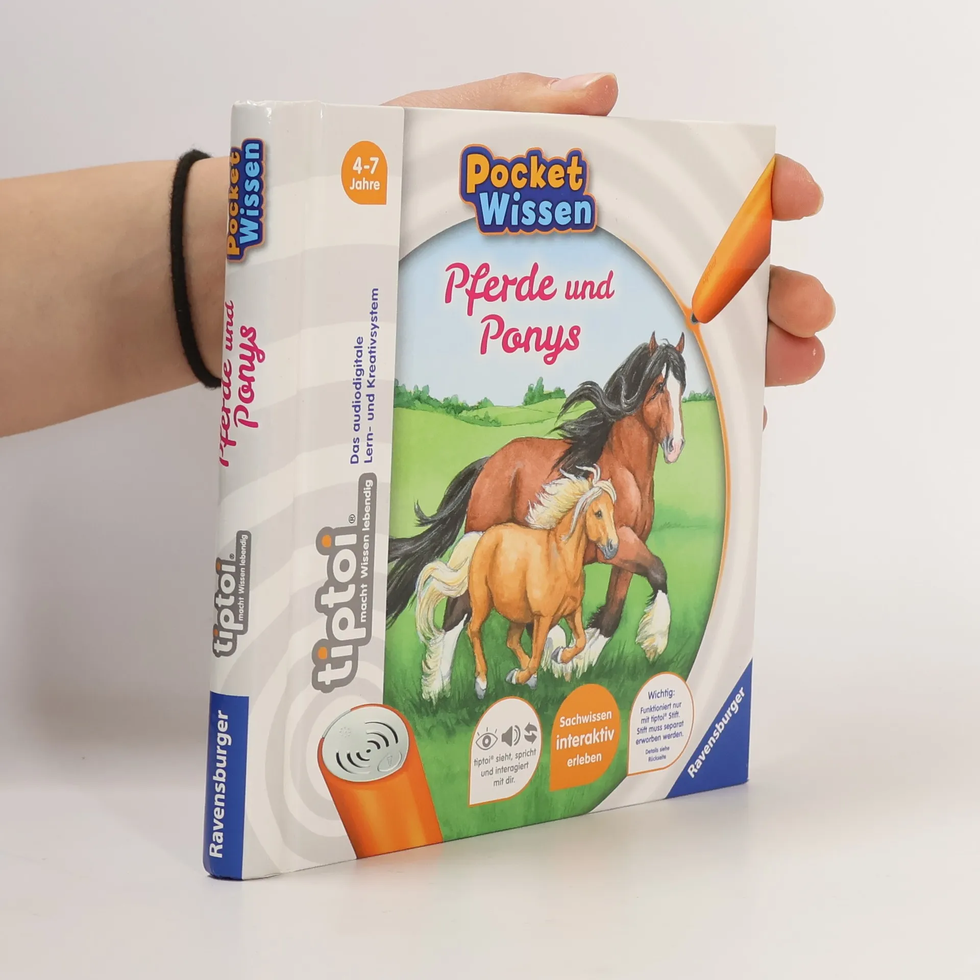 Kompaktes Sachwissen zum Mitnehmen rund um das Thema „Pferde und Ponys“ Zusammen mit Reiterin Lina entdecken Kinder die beliebtesten Pferde- und Ponyrassen. Sie erfahren, was der Unterschied zwischen einem Shetlandpony und einem Haflinger ist, warum Kaltblüter besonders stark sind und wie Wildpferde in der freien Natur leben. Gleichzeitig lernen sie viel über die Haltung und Pflege ihrer liebsten Vierbeiner. Interaktiver Lernspaß für Zuhause und Unterwegs Überall schnaubt, wiehert und prustet es - zahlreiche Geräusche machen die Welt der Pferde und Ponys lebendig. In interaktiven Spielen können die Kinder zeigen, wie gut sie sich mit ihrem Lieblingsthema schon auskennen. Ob Pferde und Ponys, Dinosaurier, Ballett oder Feuerwehr, mit der Reihe tiptoi Pocket Wissen können Kinder von 4 - 7 Jahren all ihre Lieblingsthemen entdecken und sammeln. Jeder Band bietet kompaktes Sachwissen mit vielen interessanten Informationen, authentischen Geräuschen und kniffligen Spielen. Der tiptoi-Stift lässt die kindgerecht aufgearbeiteten Sachthemen lebendig werden. So können sich die Kinder spannende Wissensinhalte mit viel Spaß selbständig und interaktiv aneignen. Die abwechslungsreichen Spiele helfen dabei, das gelernte Wissen zu vertiefen. Dank des handlichen Formats ist tiptoi Pocket Wissen ideal für unterwegs, als Geschenk zum Kindergeburtstag oder zum Schmökern zu Hause.