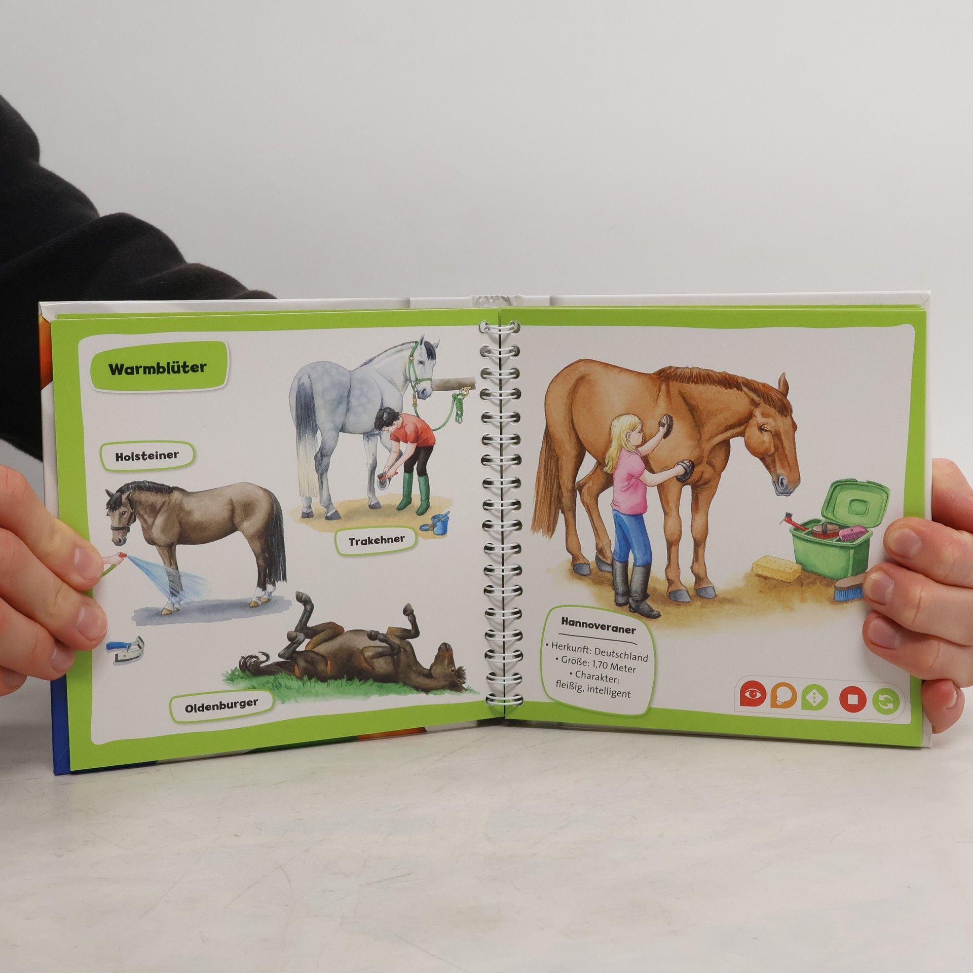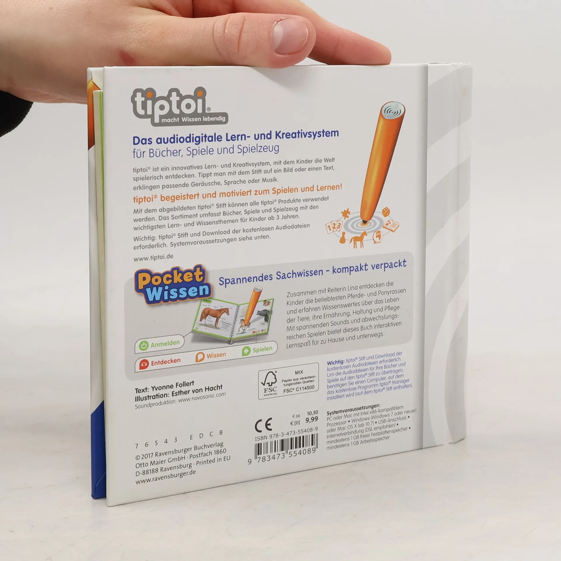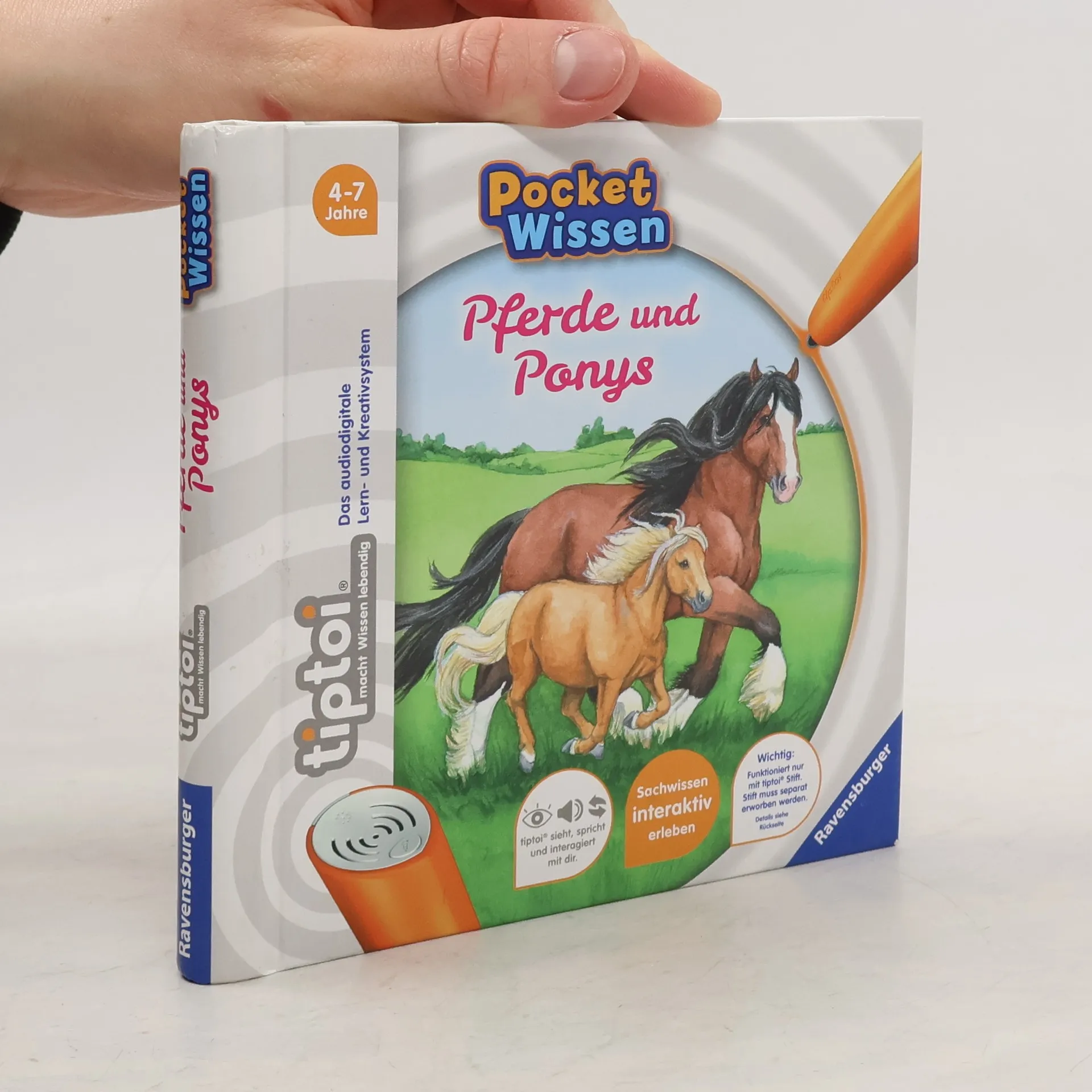 Kompaktes Sachwissen zum Mitnehmen rund um das Thema „Pferde und Ponys“ Zusammen mit Reiterin Lina entdecken Kinder die beliebtesten Pferde- und Ponyrassen. Sie erfahren, was der Unterschied zwischen einem Shetlandpony und einem Haflinger ist, warum Kaltblüter besonders stark sind und wie Wildpferde in der freien Natur leben. Gleichzeitig lernen sie viel über die Haltung und Pflege ihrer liebsten Vierbeiner. Interaktiver Lernspaß für Zuhause und Unterwegs Überall schnaubt, wiehert und prustet es - zahlreiche Geräusche machen die Welt der Pferde und Ponys lebendig. In interaktiven Spielen können die Kinder zeigen, wie gut sie sich mit ihrem Lieblingsthema schon auskennen. Ob Pferde und Ponys, Dinosaurier, Ballett oder Feuerwehr, mit der Reihe tiptoi Pocket Wissen können Kinder von 4 - 7 Jahren all ihre Lieblingsthemen entdecken und sammeln. Jeder Band bietet kompaktes Sachwissen mit vielen interessanten Informationen, authentischen Geräuschen und kniffligen Spielen. Der tiptoi-Stift lässt die kindgerecht aufgearbeiteten Sachthemen lebendig werden. So können sich die Kinder spannende Wissensinhalte mit viel Spaß selbständig und interaktiv aneignen. Die abwechslungsreichen Spiele helfen dabei, das gelernte Wissen zu vertiefen. Dank des handlichen Formats ist tiptoi Pocket Wissen ideal für unterwegs, als Geschenk zum Kindergeburtstag oder zum Schmökern zu Hause.