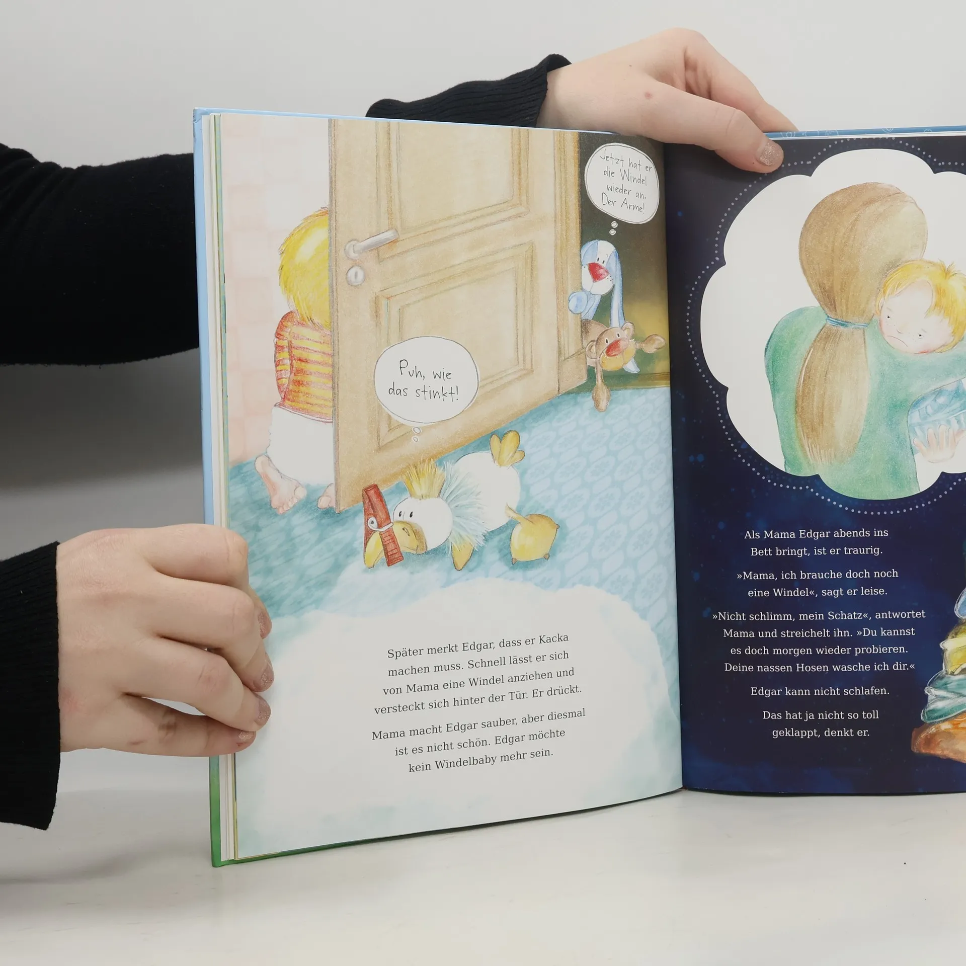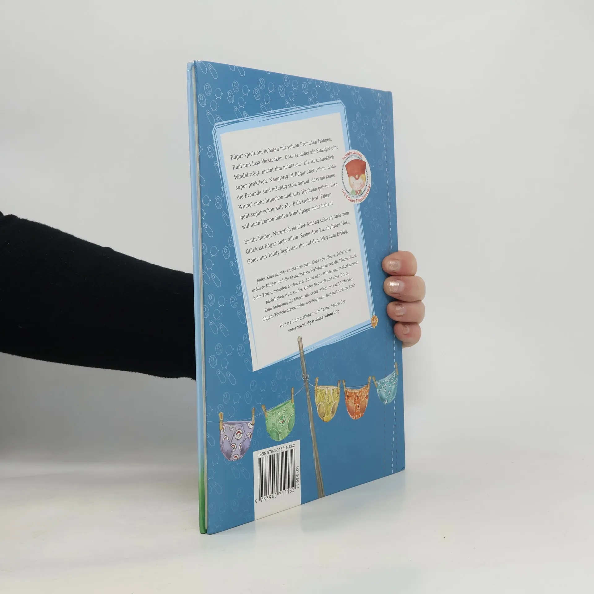 Edgar spielt am liebsten mit seinen Freunden Hannes, Emil und Lisa Verstecken. Dass er dabei als Einziger eine Windel trägt, macht ihm nichts aus. Die ist schließlich super praktisch. Neugierig ist Edgar aber schon, denn die Freunde sind mächtig stolz darauf, dass sie keine Windel mehr brauchen und aufs Töpfchen gehen. Lisa geht sogar schon aufs Klo. Bald steht fest: Edgar will auch keinen blöden Windelpopo mehr haben! Er übt fleißig. Natürlich ist aller Anfang schwer, aber zum Glück ist Edgar nicht allein. Seine drei Kuscheltiere Hasi, Geier und Teddy begleiten ihn auf dem Weg zum Erfolg. Jedes Kind möchte trocken werden. Ganz von alleine. Dabei sind größere Kinder und die Erwachsenen Vorbilder, denen die Kleinen auch beim Trockenwerden nacheifern. Edgar ohne Windel unterstützt diesen natürlichen Wunsch des Kindes liebevoll und ohne Druck. Eine Anleitung für Eltern, die verdeutlicht, wie mit Hilfe von Edgars Töpfchentrick geübt werden kann, befindet sich im Buch.