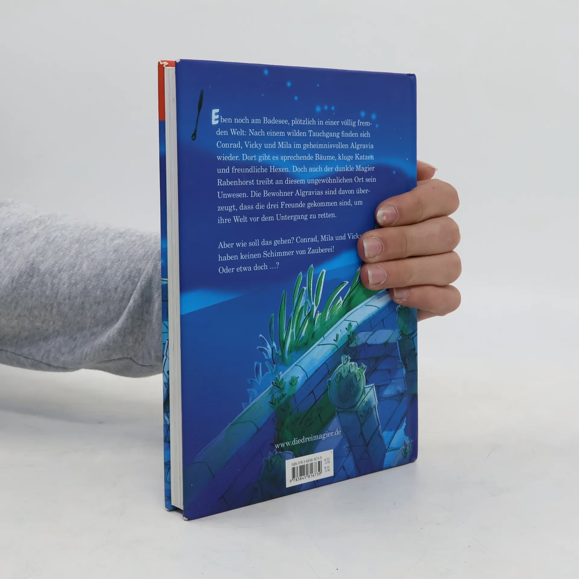 Im kleinen Städtchen Mühlfeld geht es immer beschaulich zu. Hier passiert nie etwas Aufregendes. Stimmt's? Nein, ganz und gar nicht! Conrad, Mila und Vicky geraten nach einem Sprung in den Badeweiher plötzlich in eine fremde Welt. Und in der gibt es sprechende Bäume, kluge Katzen und freundliche Hexen! Die Bewohner dieses ungewöhnlichen Ortes nennen ihre Welt Algravia und sind davon überzeugt, dass die drei Kinder die lange erwarteten drei Magier sind, die Algravia vor den gemeinen Machenschaften des fiesen Zauberers Rabenhorst retten sollen. Doch Conrad, Mila und Vicky haben keine Ahnung von Zauberei, also müssen sie wohl die Falschen sein. Oder doch nicht ...?