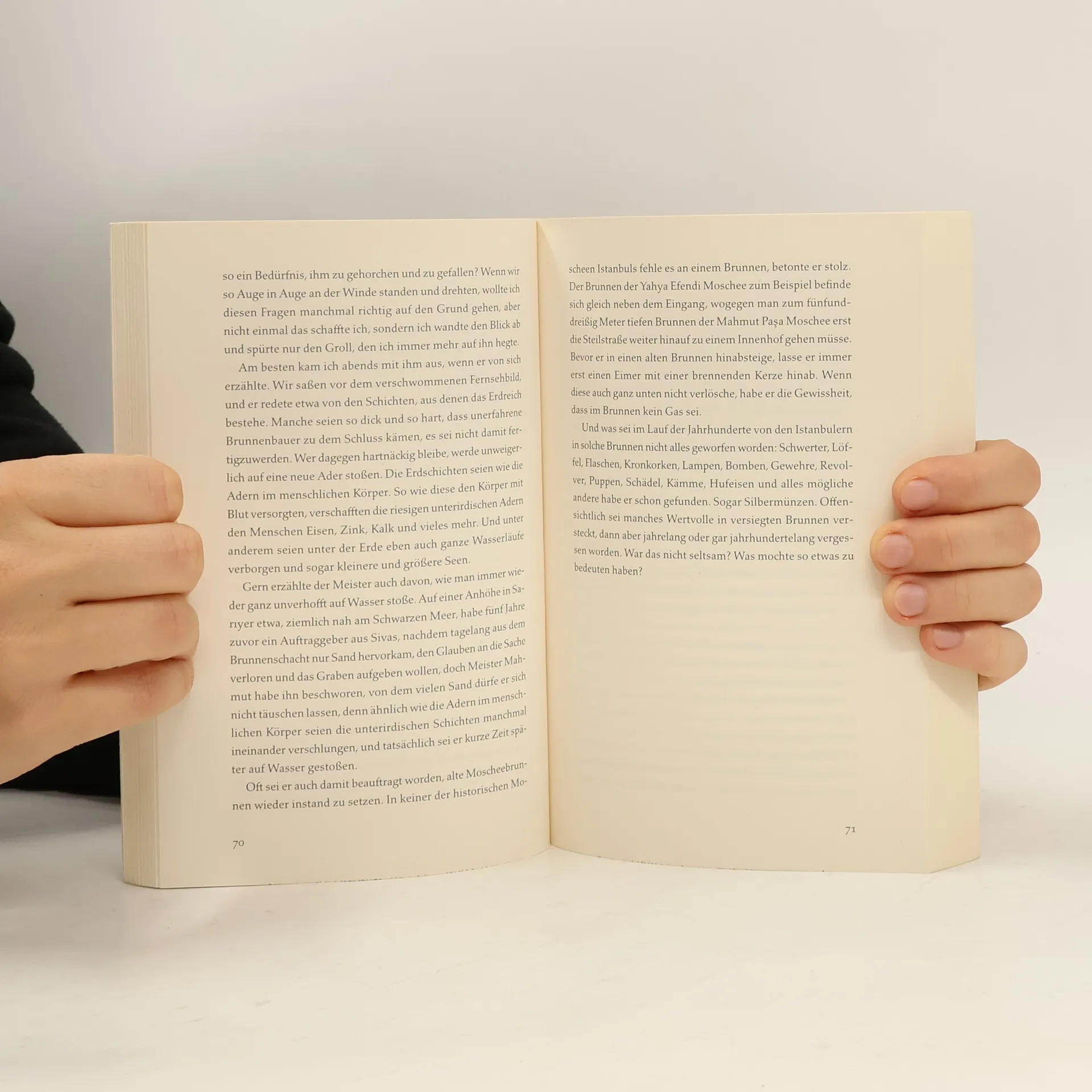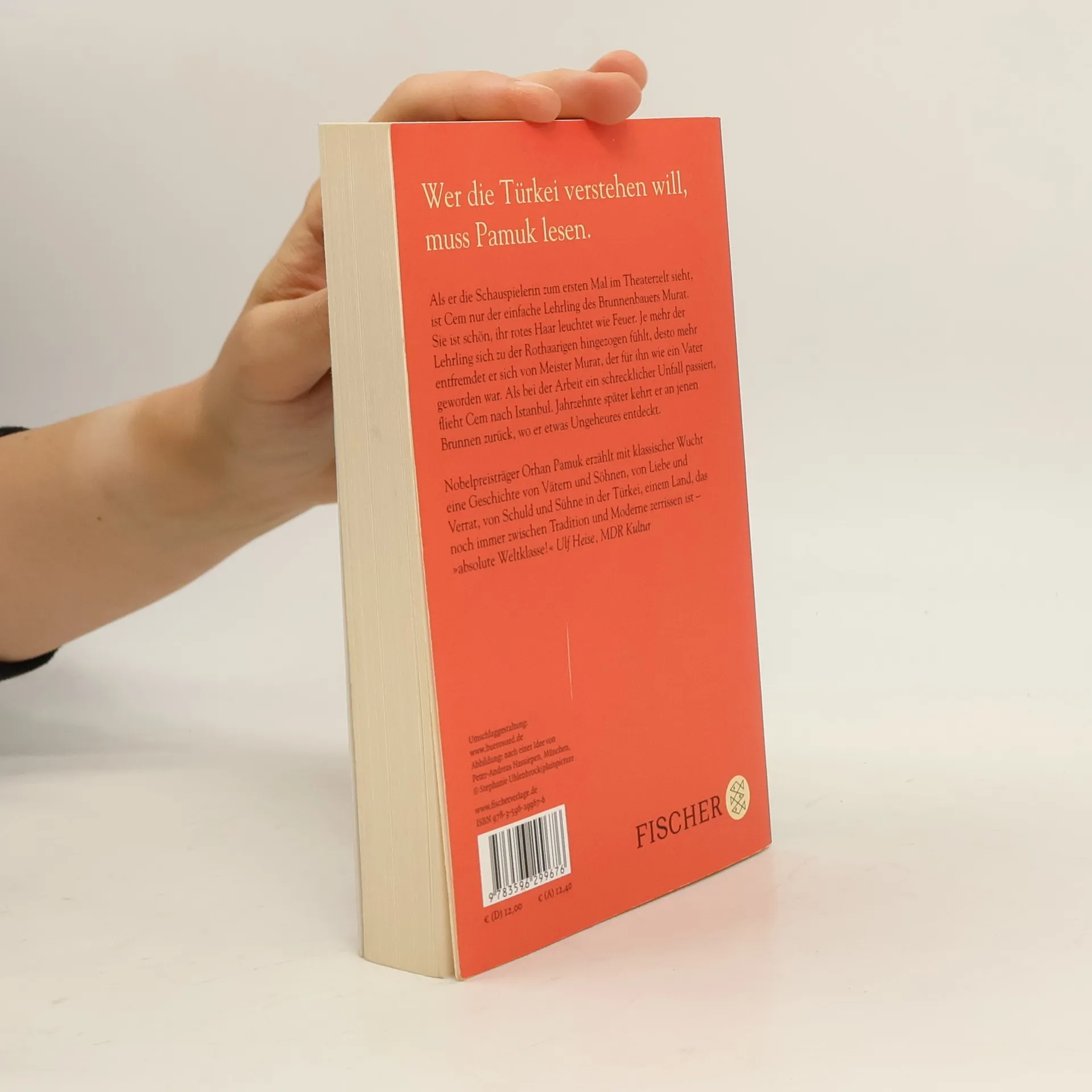 Wer die Türkei verstehen will, muss Pamuk lesen. Als er die Schauspielerin zum ersten Mal im Theaterzelt sieht, ist Cem nur der einfache Lehrling des Brunnenbauers Murat. Sie ist schön, ihr rotes Haar leuchtet wie Feuer. Je mehr der Lehrling sich zu der Rothaarigen hingezogen fühlt, desto mehr entfremdet er sich von Meister Murat, der für ihn wie ein Vater geworden war. Als bei der Arbeit ein schrecklicher Unfall passiert, flieht Cem nach Istanbul. Jahrzehnte später kehrt er an jenen Brunnen zurück, wo er etwas Ungeheures entdeckt. Nobelpreisträger Orhan Pamuk erzählt mit klassischer Wucht eine Geschichte von Vätern und Söhnen, von Liebe und Verrat, von Schuld und Sühne in der Türkei, einem Land, das noch immer zwischen Tradition und Moderne zerrissen ist – »absolute Weltklasse!« (Ulf Heise, MDR Kultur)