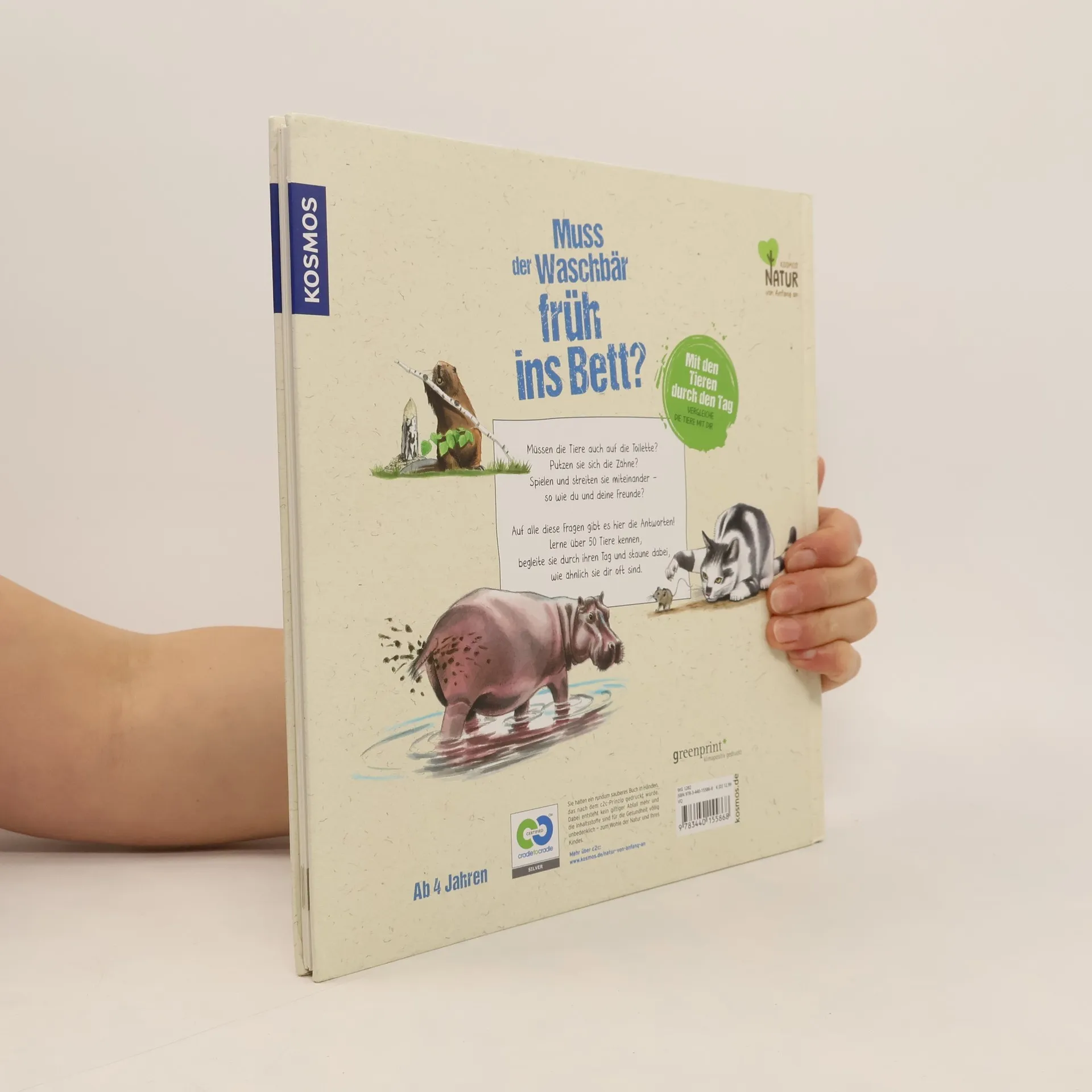 Sich waschen, essen, auf die Toilette gehen, spielen, streiten, schlafen – all das machen Tiere auch. Dieses innovative Sachbilderbuch zeigt Kindern, wie sich der Tagesablauf von Mensch und Tier ähnelt und wo die Unterschiede liegen. Über 50 Tiere werden in liebevollen Illustrationen und mit kurzen Sachtexten vorgestellt. Der Vergleich der eigenen Lebenswelt mit der Welt der Tiere macht Kindern großen Spaß und regt an, die Natur ganz genau zu beobachten. KOSMOS Natur von Anfang an – konsequent nachhaltig. Produziert nach dem zertifizierten Cradle-to-Cradle-Prinzip.