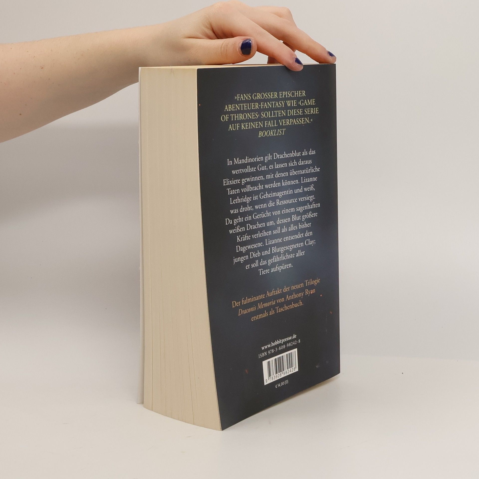 Im riesigen Gebiet von Mandinorien gilt Drachenblut als das wertvollste Gut. Rote, grüne, blaue und schwarze Drachen werden gejagt, um an ihr Blut zu kommen. Das daraus gewonnene Elixier verleiht den wenigen Gesegneten übernatürliche Kräfte. Doch das letzte Zeitalter der Drachen neigt sich seinem Ende zu. Kaum jemand kennt die Wahrheit: Die Drachen werden immer weniger und schwächer. Sollten sie aussterben, wäre ein Krieg Mandinoriens mit dem benachbarten Corvantinischen Kaiserreich unausweichlich. Alle Hoffnung des Drachenblut-Syndikats beruht auf einem Gerücht, nach dem es eine weitere Drachenart gibt, die weitaus mächtiger ist als alle anderen. Claydon Torcreek, ein Dieb und unregistrierter Blutgesegneter, wird von der obersten Herrschergilde in das wilde, unerforschte Inland geschickt, um einem Geschöpf nachzuspüren, das er selbst für reine Legende hält: dem weißen Drachen. »Mühelos verbindet Ryan Drachen- Fantasy mit Spionageroman und Seeabenteuer, meisterhaft und glaubwürdig.« Publishers Weekly
