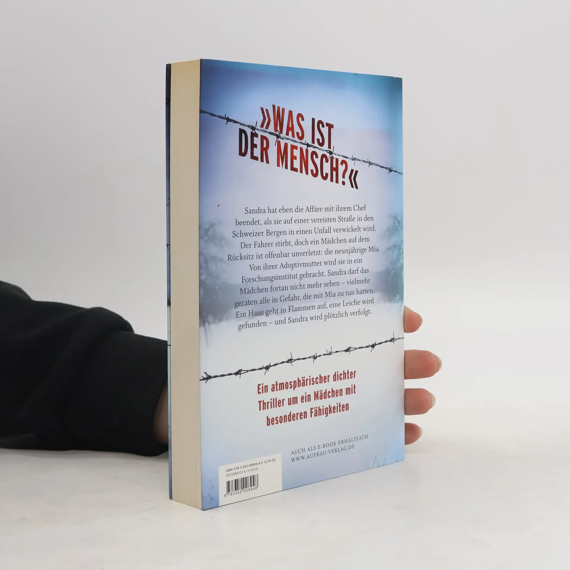 „Was ist der Mensch?“ Sandra hat eben die Affäre mit ihrem Chef beendet, als sie auf einer vereisten Straße in den Schweizer Bergen in einen Unfall verwickelt wird. Der Fahrer stirbt, doch ein Mädchen auf dem Rücksitz ist offenbar unverletzt: die neunjährige Mia. Von ihrer Adoptivmutter wird sie in ein Forschungsinstitut gebracht. Sandra darf das Mädchen fortan nicht mehr sehen – vielmehr geraten alle in Gefahr, die mit Mia zu tun hatten. Ein Haus geht in Flammen auf, eine Leiche wird gefunden – und Sandra wird plötzlich verfolgt. Ein atmosphärischer dichter Thriller um ein Mädchen mit besonderen Fähigkeiten
