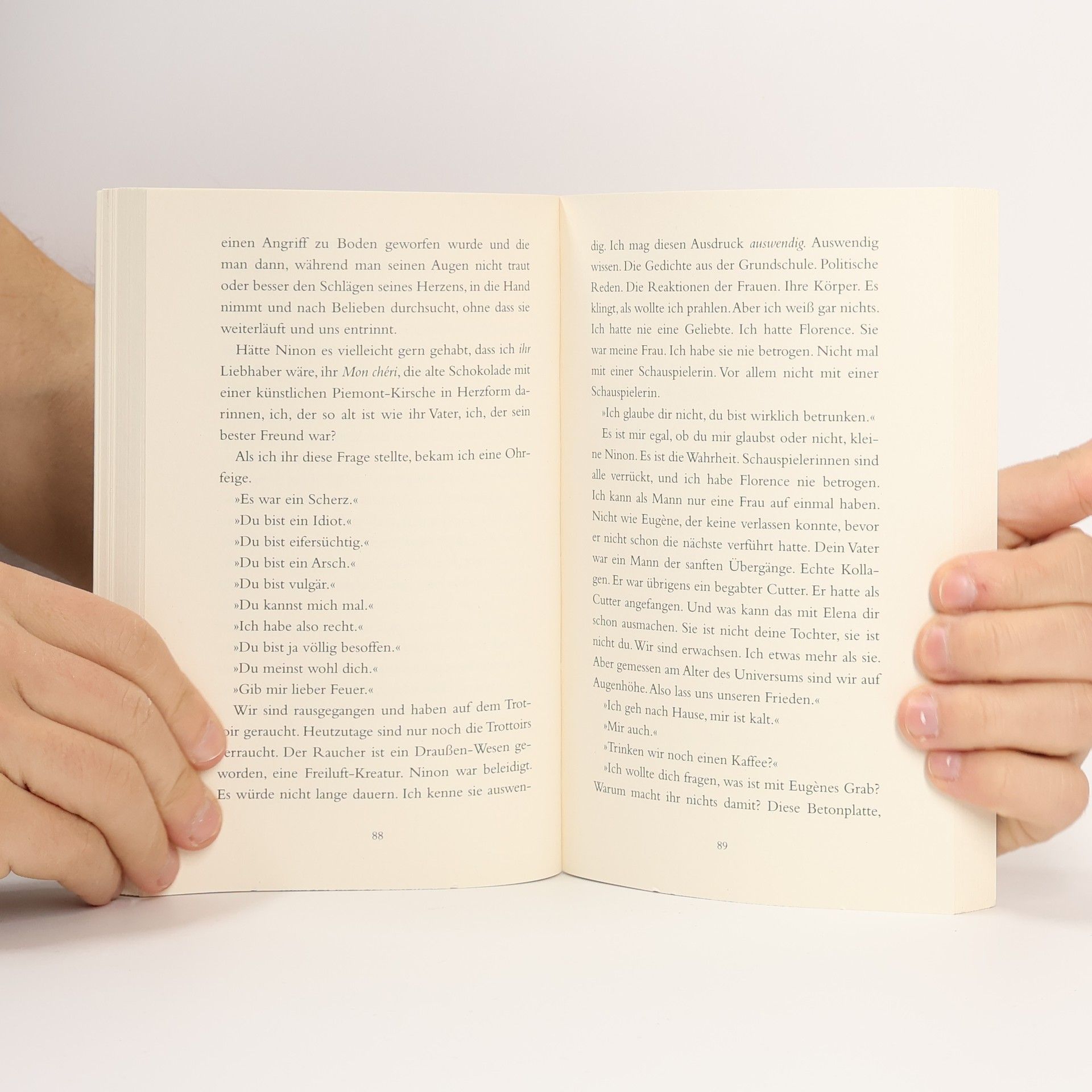 Der Abschied von seinem besten Freund Eugène ist für den Erzähler Anlass, über die wichtigen Fragen des Lebens nachzudenken. Er selbst befindet sich gerade an einem Wendepunkt – der freundschaftlichen Trennung von seiner Ex-Frau Florence und der Begegnung mit der jungen Anthropologin Elena, deren Küsse nach Orangen schmecken. Zwischen zwei wunderbaren Frauen, zwischen der Erinnerung an geliebte Gesichter und dem Licht unerwarteter Begegnungen, entspinnt sich eine Geschichte, die wahrhaftig ist und anrührend und an deren Ende neue Kraft und das Versprechen des Lebens stehen.