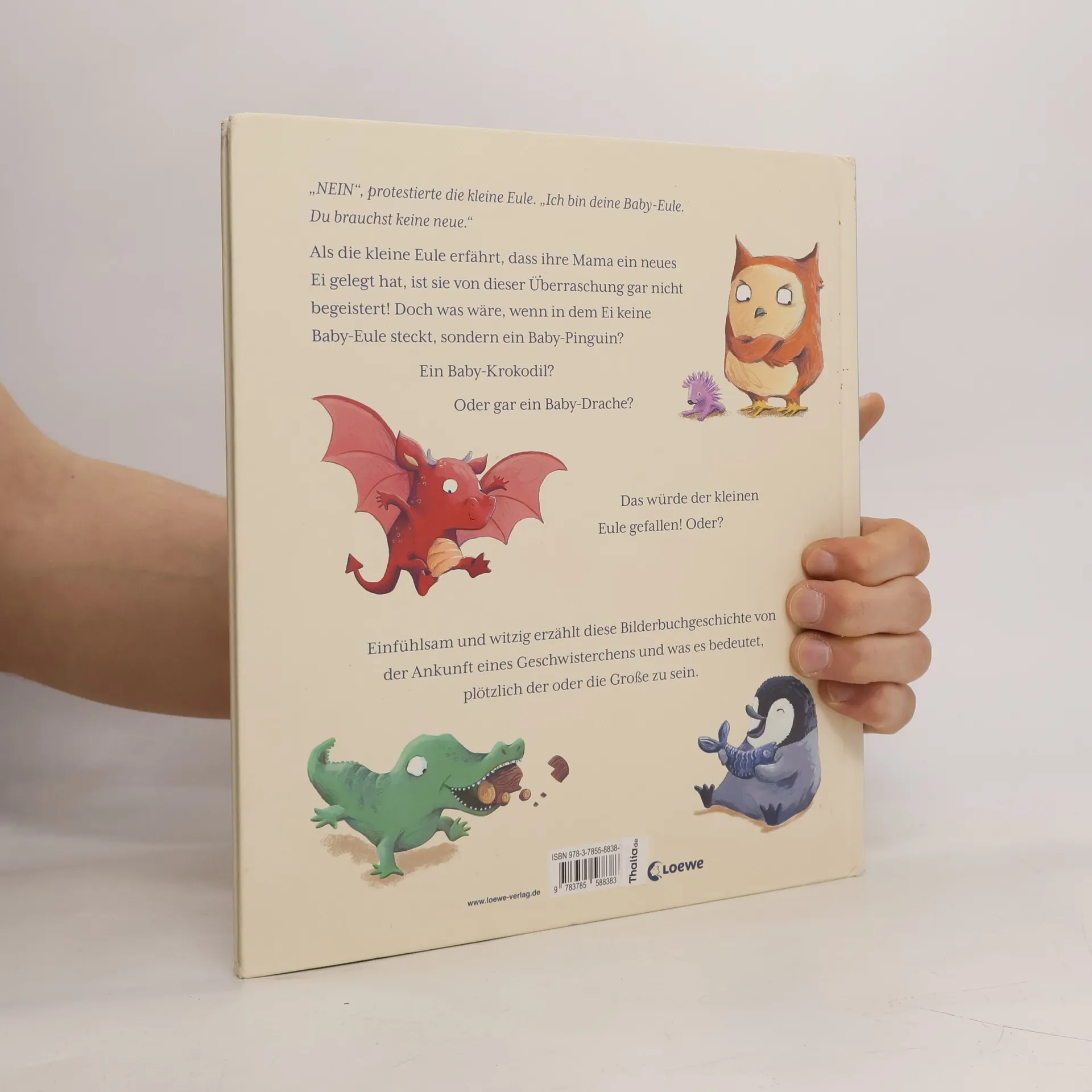 Als die kleine Eule erfährt, dass ihre Mama ein neues Ei gelegt hat, ist sie von dieser Überraschung gar nicht begeistert! Doch was wäre, wenn in dem Ei keine Baby-Eule steckt, sondern ein Baby-Pinguin? Ein Baby-Krokodil? Oder gar ein Baby-Drache? Das würde der kleinen Eule gefallen! Oder? Einfühlsam und witzig erzählt diese Bilderbuchgeschichte von der Ankunft eines Geschwisterchens und was es bedeutet, plötzlich der oder die Große zu sein. Die kleine Eule bekommt ein Geschwisterchen und fragt sich, ob ein anderes Tier als neues Familienmitglied nicht noch spannender wäre? Ein feinfühliges und lustiges Bilderbuch , für alle zukünftigen Geschwister ab 3 Jahren , um sich auf Bruder oder Schwester zu freuen.