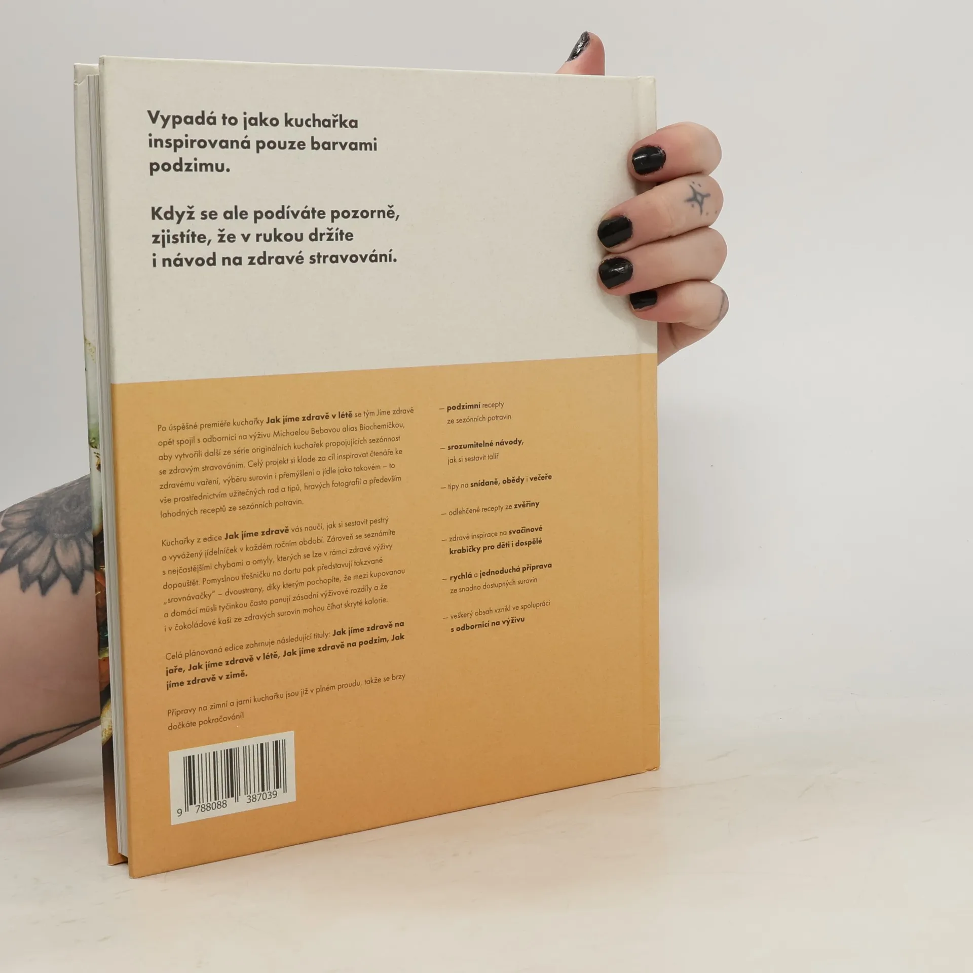 Kuchařka, nebo průvodce zdravým stravováním? Obojí! Kromě 94 sezónních receptů totiž v knize najdete celou řadu srozumitelných návodů a tipů, jak jíst zdravě. Zbrusu nový koncept je plný inspirace, překvapivého obsahu a nádherných fotografií, které vás hravou formou postupně vedou k tomu, abyste se naučili přemýšlet o skladbě jídla na talíři, výběru surovin nebo velikosti porcí. Pomocí knihy si snadno sestavíte vyvážený jídelníček, můžete jí ale i jen tak listovat a objevovat přitom nové chutě a zdravé kombinace. Ukážeme vám, že naše recepty nejsou žádná věda – většinu jídel připravíte do 30 minut, a to ze surovin, které seženete v běžném obchodě. Kuchařka plná podzimně laděných receptů přímo navazuje na Jak jíme zdravě v létě a skvěle tak rozšíří vaši sbírku – ať už hledáte nové recepty, nebo chcete proniknout do principů zdravého stravování. Na knize s námi spolupracovala odbornice na výživu RNDr. Michaela Bebová alias Biochemička.