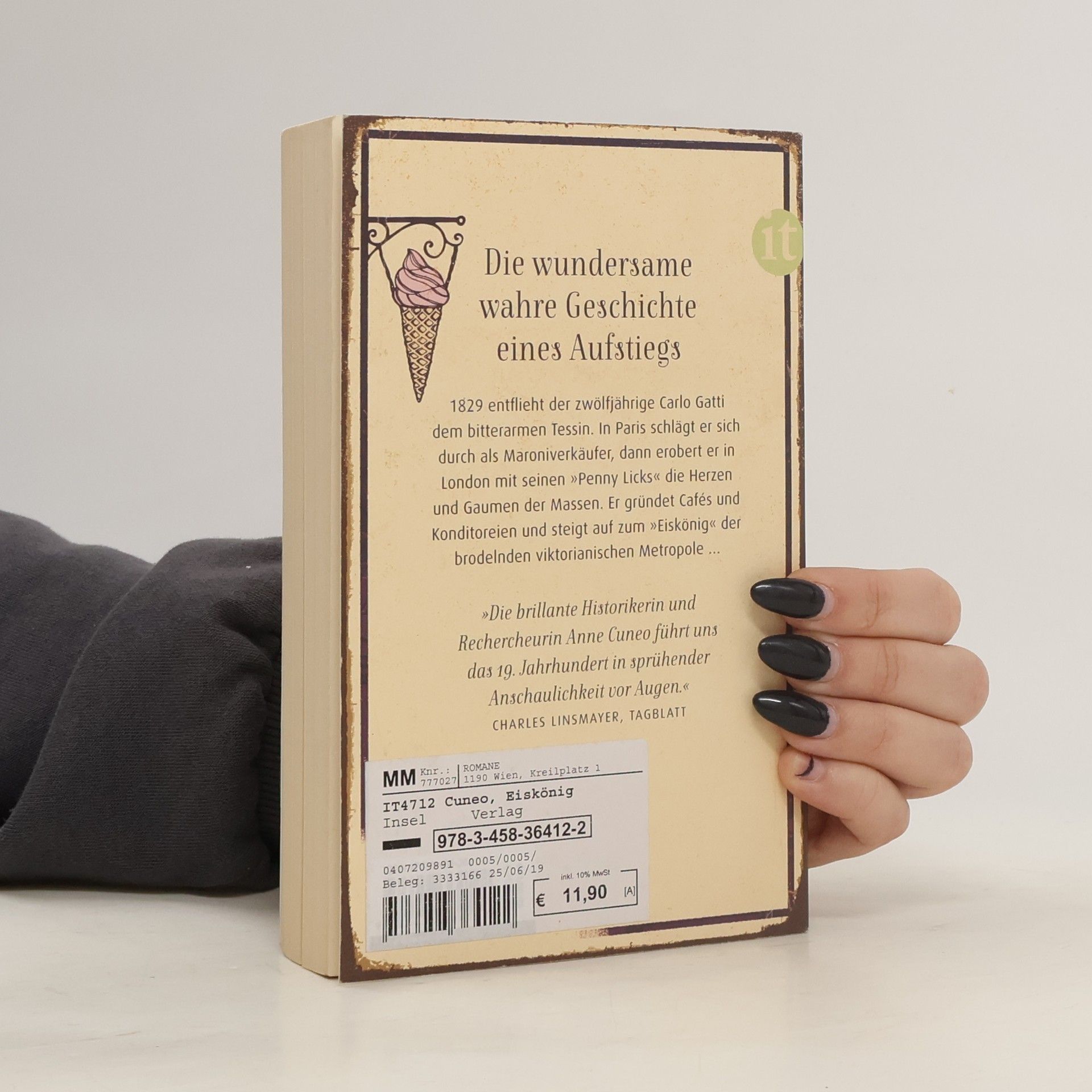 Tessin, in den 1830er Jahren. Bittere Armut herrscht im Bleniotal. Der Straßenjunge Carlo Gatti flieht von dort, kommt auf Umwegen nach Paris. Er schlägt sich durch, verkauft Esskastanien, um zu überleben, atmet begierig das Flair der Hauptstadt. Er steigt auf durch harte Arbeit. Als energischer Selfmademan geht er nach London, ein kometenhafter Aufstieg beginnt. Er gründet Kaffeehäuser im französischen Stil, sein Erfolgsrezept: Schokolade und Speiseeis, auch für die einfache Bevölkerung. Im brodelnden London der Jahrhundertwende wird Carlo Gatti berühmt. Der Genuss von Speiseeis war lange den Wohlhabenden vorbehalten. Doch seine »Penny Licks« können sich auch einfache Leute leisten. Anne Cuneo erzählt die wundersame Geschichte eines Aufsteigers, der es vom Straßenkind im Tessin zum Eiskönig von London brachte. Ein ergreifendes Porträt eines Lebens im viktorianischen England wie bei Charles Dickens. Nach einer wahren Geschichte.