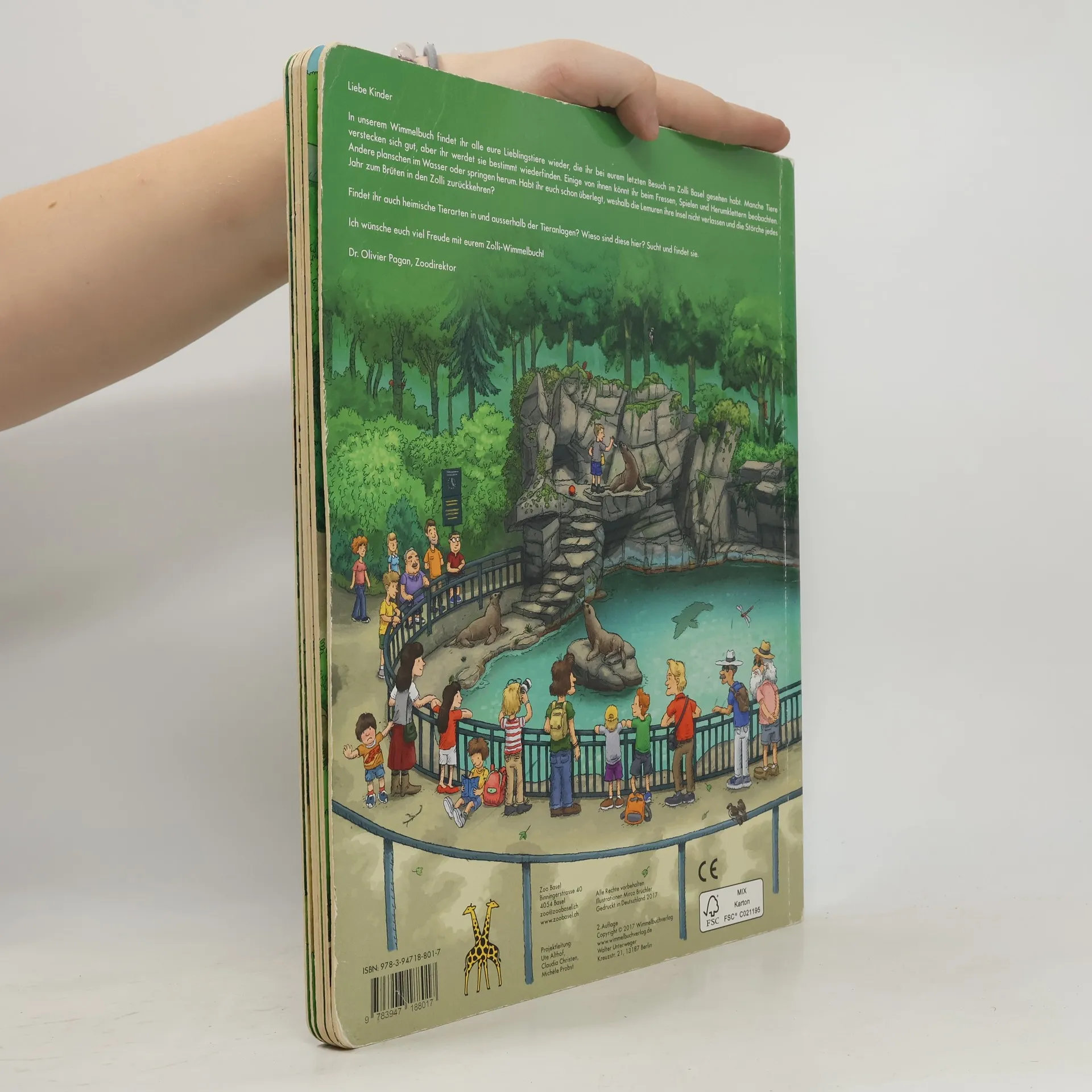 Liebe Kinder In unserem Wimmelbuch findet ihr alle eure Lieblingstiere wieder, die ihr bei eurem letzten Besuch im Zolli Basel gesehen habt. Manche Tiere verstecken sich gut, aber ihr werdet sie bestimmt wiederfinden. Einige von ihnen könnt ihr beim Fressen, Spielen und Herumklettern beobachten. Andere planschen im Wasser oder springen herum. Habt ihr euch schon überlegt, weshalb die Lemuren ihre Insel nicht verlassen und die Störche jedes Jahr zum Brüten in den Zolli zurückkehren? Findet ihr auch heimische Tierarten in und ausserhalb der Tieranlagen? Wieso sind diese hier? Sucht und findet sie. Ich wünsche euch viel Freude mit eurem Zolli-Wimmelbuch! Dr. Olivier Pagan, Zoodirektor