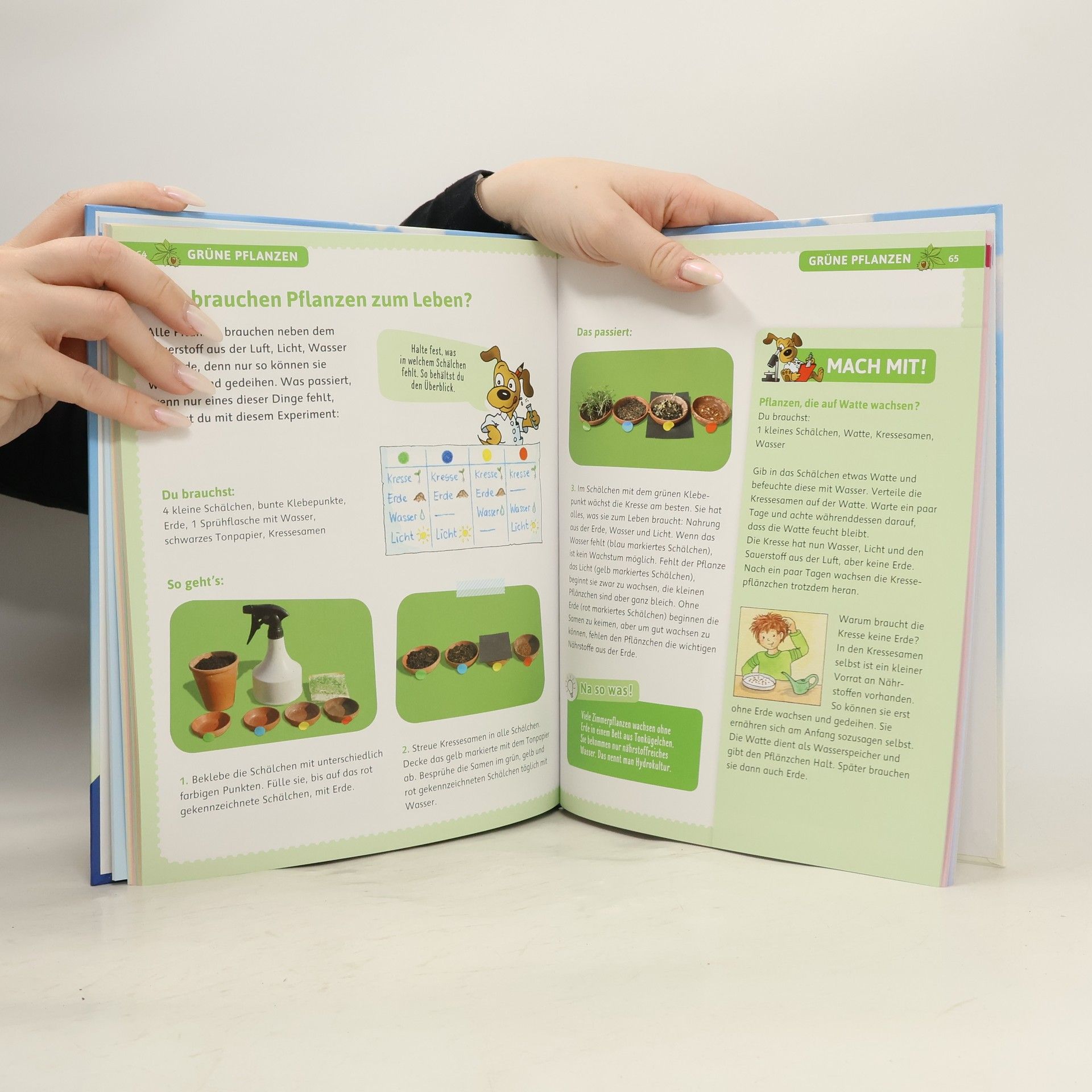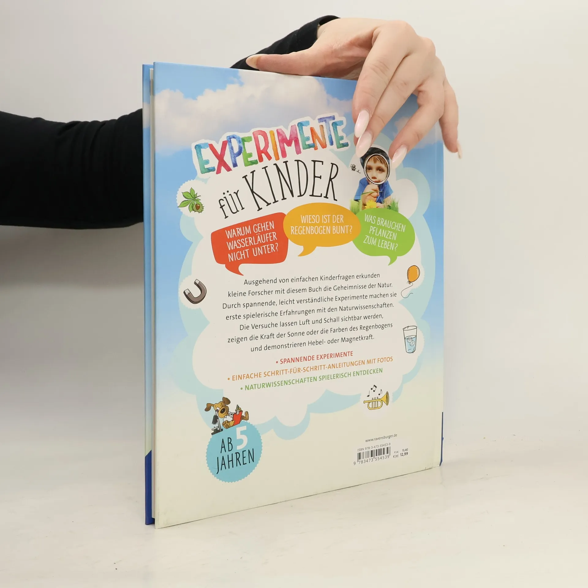 Kleine Forscher entdecken in diesem Buch mit spannenden Experimenten ganz spielerisch die Naturwissenschaften. Die Versuche können leicht durchgeführt werden und behandeln die Themen: Wasser und Eis, Luft, Licht und Farben, grüne Pflanzen, Hören und Musik, Wärme und Temperatur, Kraft und Bewegung sowie Magnetismus. Die Auswahl ist auf die Bildungspläne der Kindergärten und Grundschulen abgestimmt. Spielend Naturwissenschaften erkundenExperimente machen Spaß! Schon früh kann man Kinder dafür gewinnen, Versuche und Experimente durchzuführen. So erkunden sie spielend Felder der Naturwissenschaften und lernen zugleich jede Menge spannende Fakten. Breites ThemenspektrumDer Aufbau dieses Experimentebuches orientiert sich an den Bildungsplänen für Kindergärten und Grundschulen. Wasser und Eis, Luft, Licht und Farben, grüne Pflanzen, Hören, Musik, Wärme und Temperatur, Kraft und Bewegung sowie Magnetismus lauten die Kapitelüberschriften, die ein breites Themenspektrum aus der Physik, der Chemie und der Biologie abdecken. Einfache AnleitungenDie Experimente dieses Buches gehen meist vom Alltag der Kinder aus. Klare und verständliche Anleitungen sorgen dafür, dass die Versuche gelingen, die sich mit einfachen Haushaltsmitteln durchführen lassen.