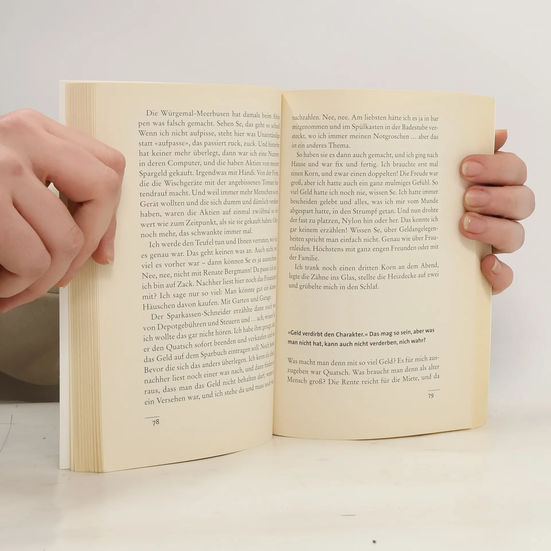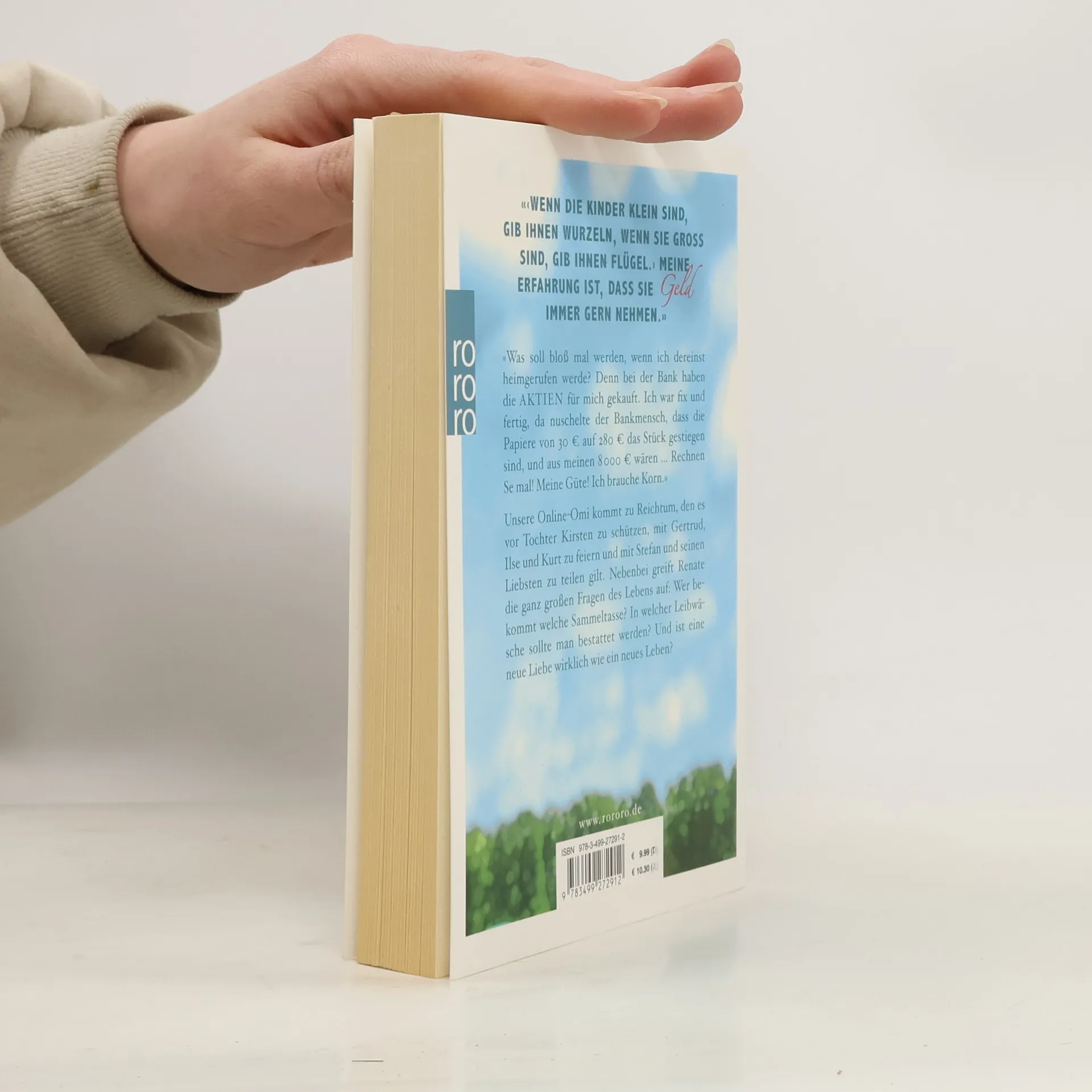 Wenn die Kinder klein sind, gib ihnen Wurzeln, wenn sie groß sind, gib ihnen Flügel.› Meine Erfahrung ist, dass sie Geld immer gern nehmen.' 'Was soll bloß mal werden, wenn ich dereinst heimgerufen werde? Denn bei der Bank haben die AKTIEN für mich gekauft. Ich war fix und fertig, da nuschelte der Bankmensch, dass die Papiere von 30 € auf 280 € das Stück gestiegen sind, und aus meinen 8.000€ wären… Rechnen Se mal! Meine Güte! Ich brauche Korn.' Unsere online-Omi kommt zu Reichtum, den es vor Tochter Kirsten zu schützen, mit Gertrud, Ilse und Kurt zu feiern und mit Stefan und seinen Liebsten zu teilen gilt. Nebenbei greift Renate die ganz großen Fragen des Lebens auf: Wer bekommt welche Sammeltasse? In welcher Leibwäsche sollte man bestattet werden? Und ist eine neue Liebe wirklich wie ein neues Leben?
