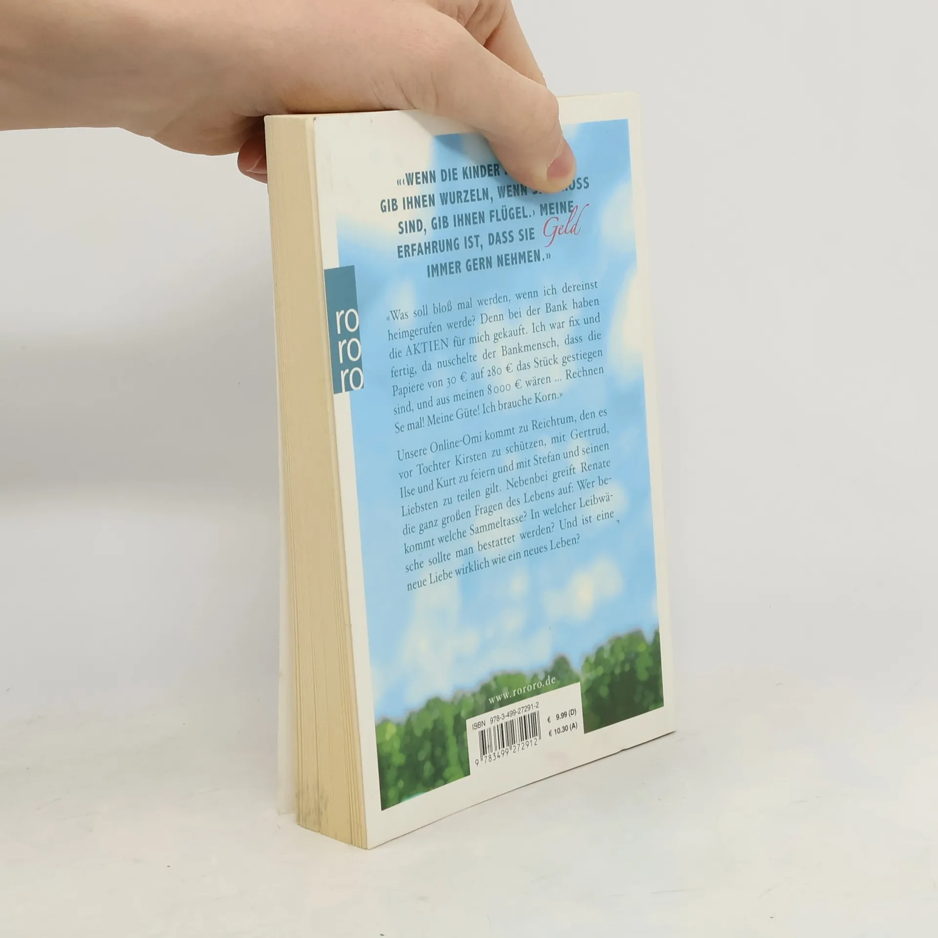 Wenn die Kinder klein sind, gib ihnen Wurzeln, wenn sie groß sind, gib ihnen Flügel.› Meine Erfahrung ist, dass sie Geld immer gern nehmen.' 'Was soll bloß mal werden, wenn ich dereinst heimgerufen werde? Denn bei der Bank haben die AKTIEN für mich gekauft. Ich war fix und fertig, da nuschelte der Bankmensch, dass die Papiere von 30 € auf 280 € das Stück gestiegen sind, und aus meinen 8.000€ wären… Rechnen Se mal! Meine Güte! Ich brauche Korn.' Unsere online-Omi kommt zu Reichtum, den es vor Tochter Kirsten zu schützen, mit Gertrud, Ilse und Kurt zu feiern und mit Stefan und seinen Liebsten zu teilen gilt. Nebenbei greift Renate die ganz großen Fragen des Lebens auf: Wer bekommt welche Sammeltasse? In welcher Leibwäsche sollte man bestattet werden? Und ist eine neue Liebe wirklich wie ein neues Leben?
