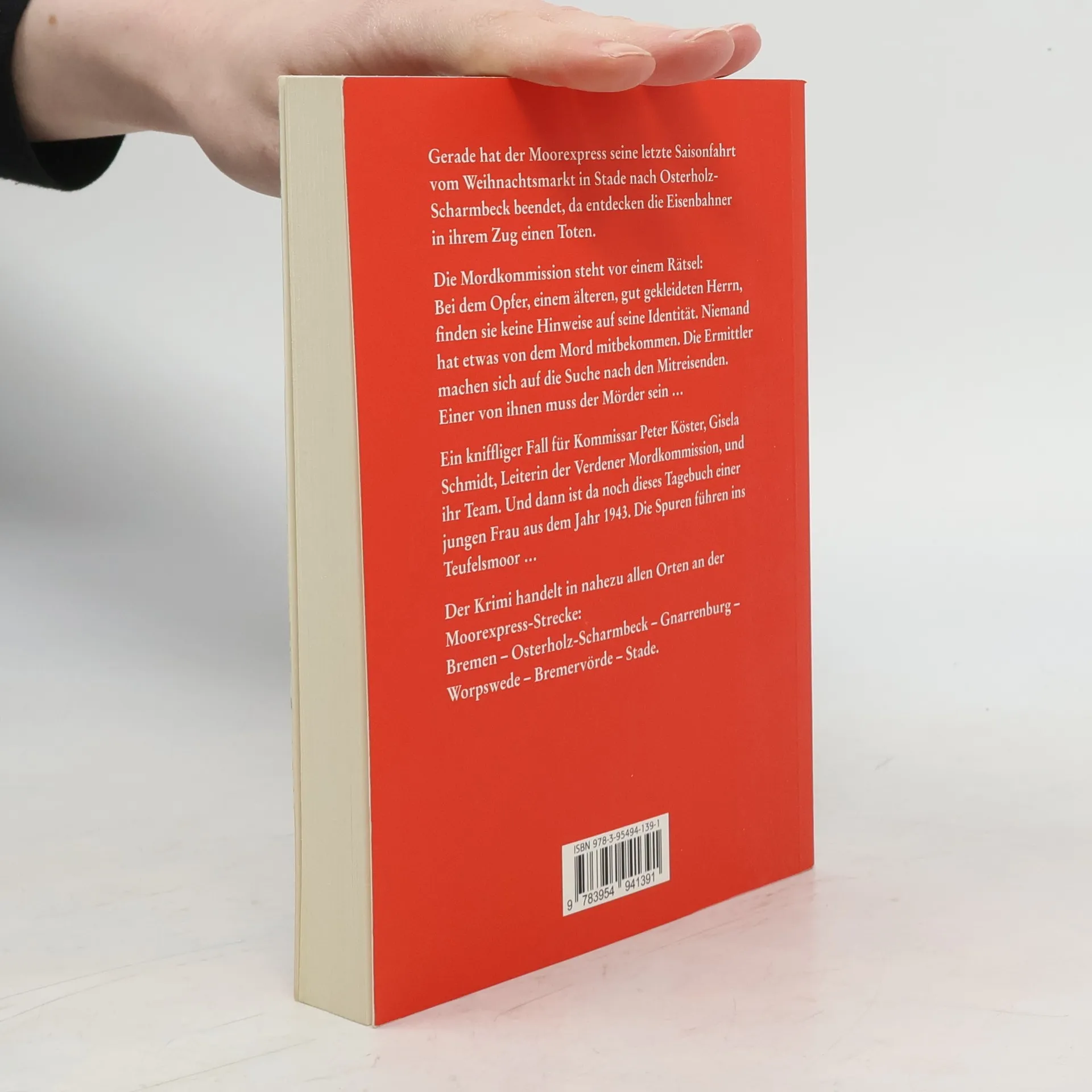 Gerade hat der Moorexpress seine letzte Saisonfahrt vom Weihnachtsmarkt in Stade nach Osterholz-Scharmbeck beendet, da entdecken die Eisenbahner in ihrem Zug einen Toten. Die Mordkommission steht vor einem Rätsel: Bei dem Opfer, einem älteren, gut gekleideten Herrn, finden sie keine Hinweise auf seine Identität. Niemand hat etwas von dem Mord mitbekommen. Die Ermittler machen sich auf die Suche nach den Mitreisenden. Einer von ihnen muss der Mörder sein … Ein kniffliger Fall für Kommissar Peter Köster, Gisela Schmidt, Leiterin der Verdener Mordkommission, und ihr Team. Und dann ist da noch dieses Tagebuch einer jungen Frau aus dem Jahr 1943. Die Spuren führen ins Teufelsmoor … Der Krimi handelt in nahezu allen Orten an der Moorexpress-Strecke: Bremen – Osterholz-Scharmbeck – Gnarrenburg – Worpswede – Bremervörde – Stade.