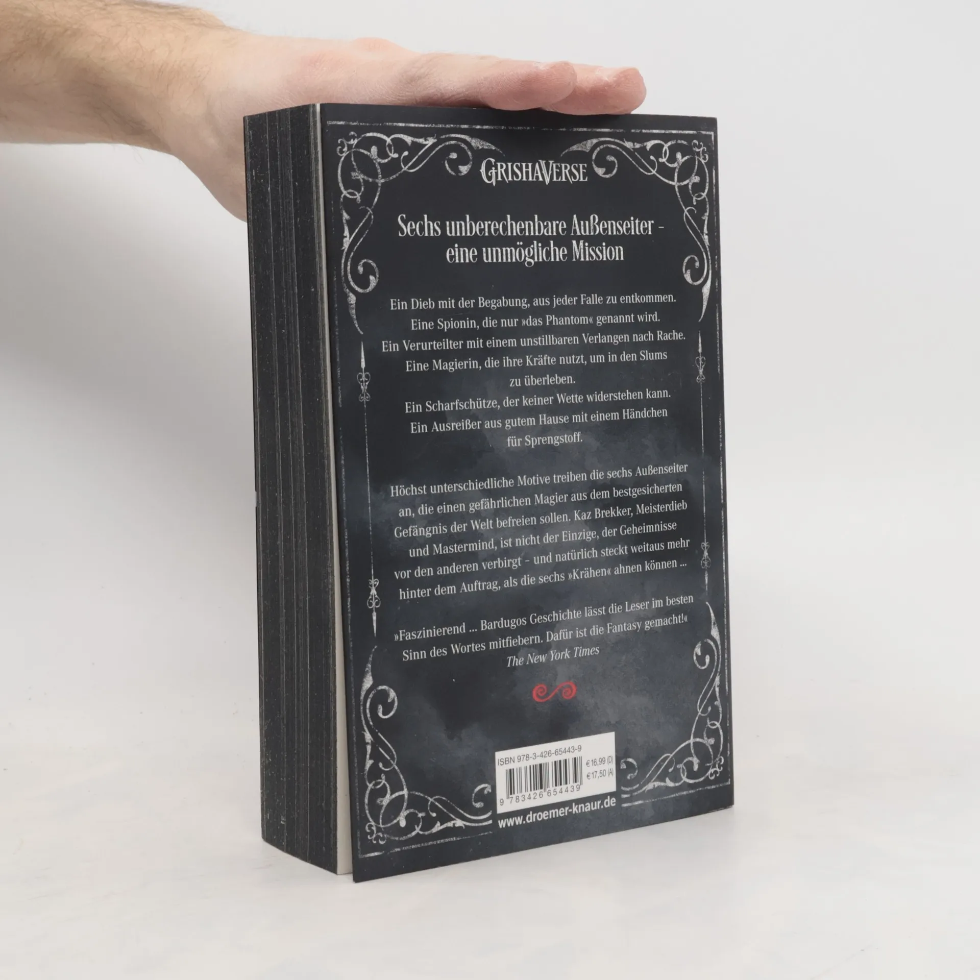Ein Dieb mit der Begabung, aus jeder Falle zu entkommen. Eine Spionin, die nur »das Phantom« genannt wird. Ein Verurteilter mit einem unstillbaren Verlangen nach Rache. Eine Magierin, die ihre Kräfte nutzt, um in den Slums zu überleben. Ein Scharfschütze, der keiner Wette widerstehen kann. Ein Ausreißer aus gutem Hause mit einem Händchen für Sprengstoff. Höchst unterschiedliche Motive trieben die sechs Außenseiter an, die einen gefährlichen Magier aus dem bestgesicherten Gefängnis der Welt befreien sollen. Kaz Brekker, Meisterdieb und Mastermind, ist nicht der Einzige, der Geheimnisse vor den anderen verbirgt - und natürlich steckt weitaus mehr hinter dem Auftrag, als die sechs »Krähen« ahnen können...