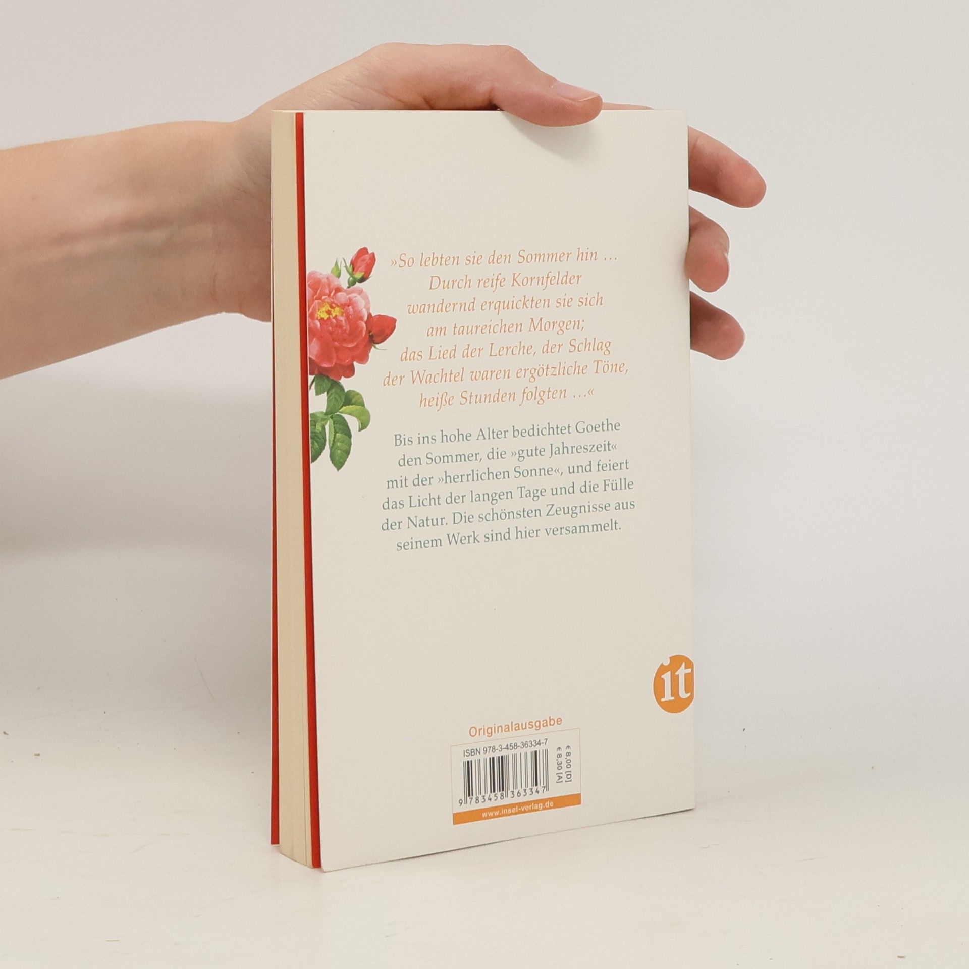 Der Sommer ist für Goethe die »gute Jahreszeit«, in der er die Fülle der Natur erfährt. Das Licht der langen Tage, im Glück der italienischen Reise noch einmal gesteigert, wird in vielen Zeugnissen poetisch gefeiert. Zum Leben in seiner intensivsten Gestalt gehören der Reiz der Sommernächte wie auch das drohende Gewitter und der versöhnende Regenbogen. Immer wieder ist es die »herrliche Sonne«, die bis ins hohe Alter bedichtet, immer wieder die Rose, die als Symbol der Liebe, der Schönheit und Verschwiegenheit beschworen wird.