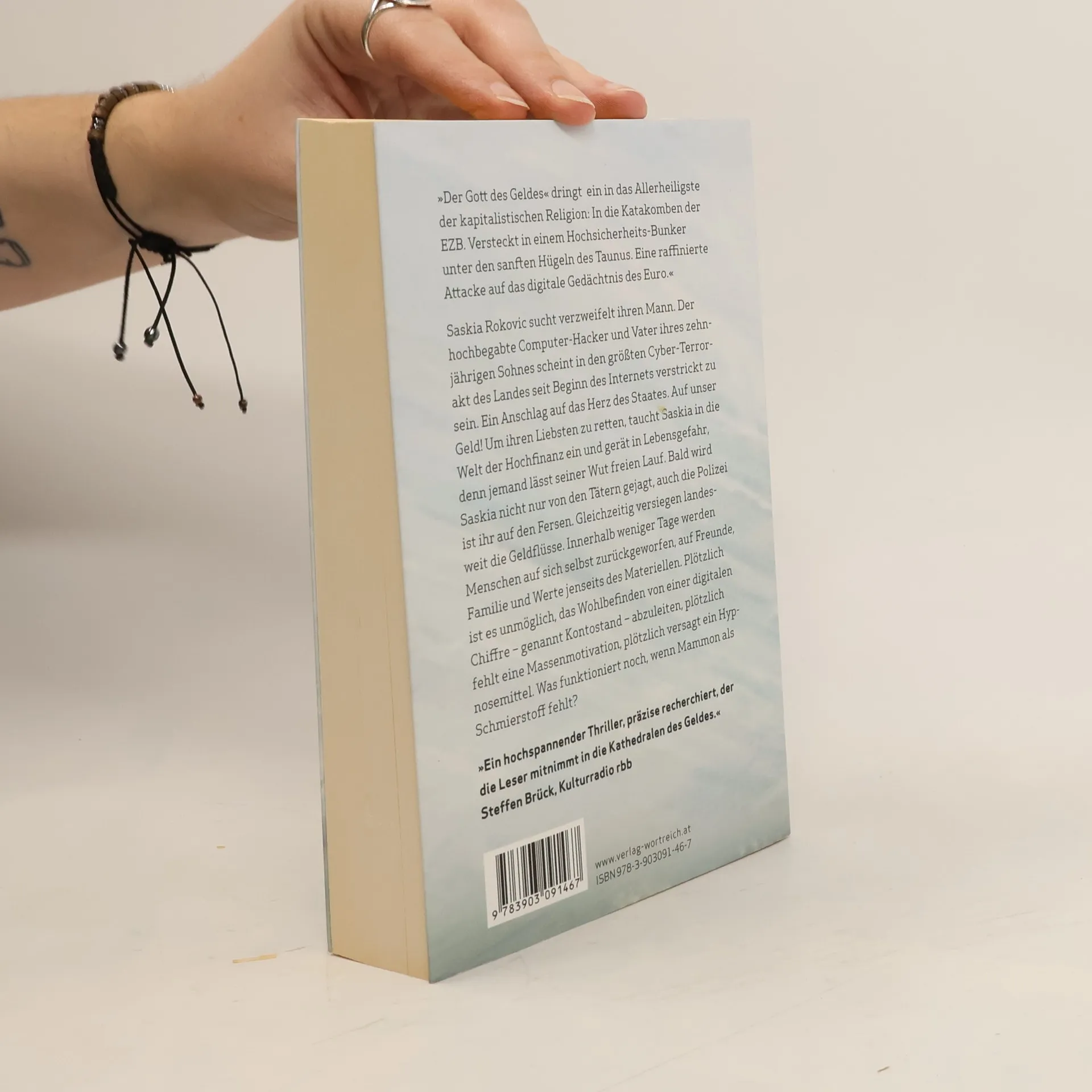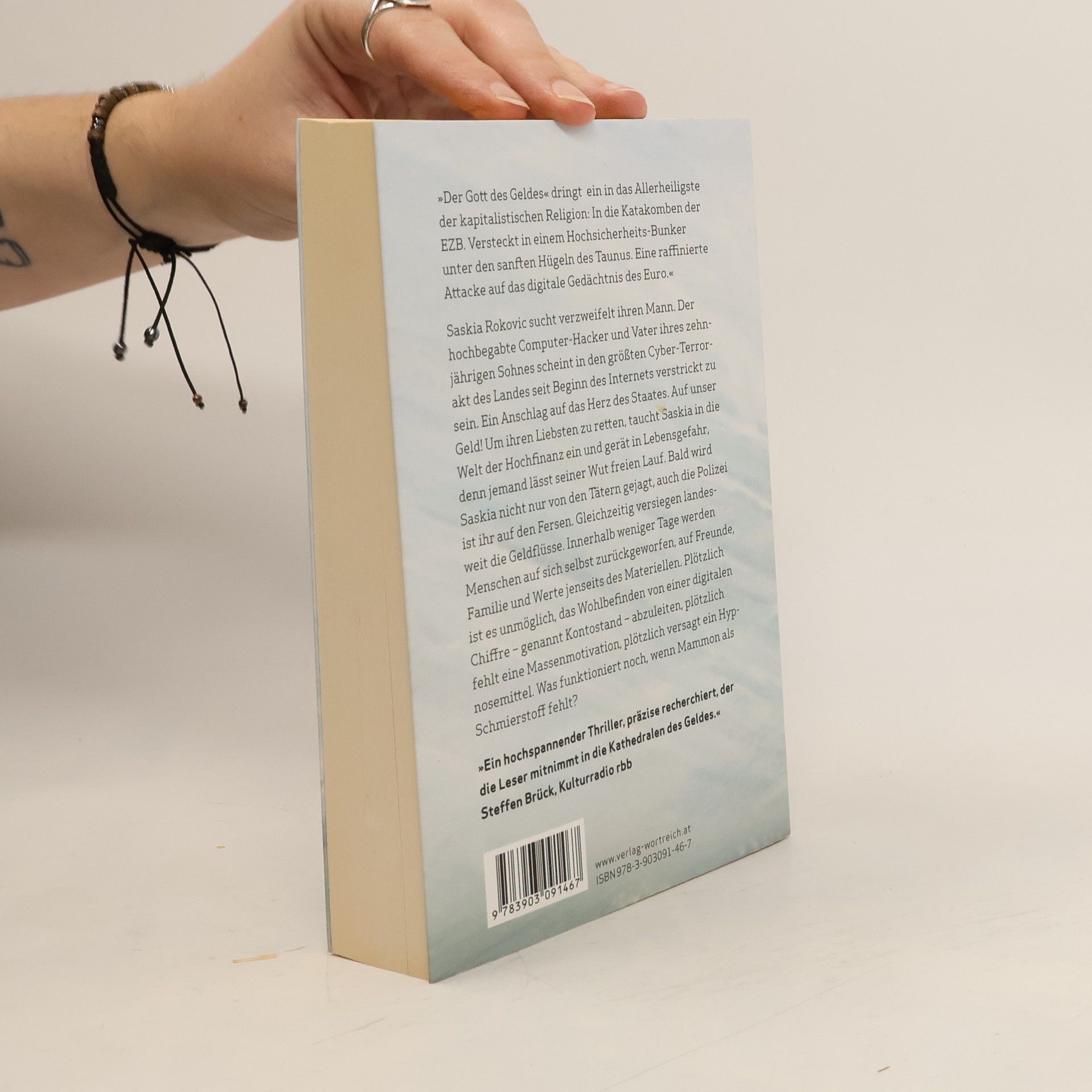 Saskia Rokovic sucht verzweifelt ihren Mann. Der hochbegabte Computer-Hacker und Vater ihres zehnjährigen Sohnes scheint in den größten Cyber-Terrorakt des Landes seit Beginn des Internets verstrickt zu sein. Ein Anschlag auf das Herz des Staates. Auf unser Geld! Um ihren Liebsten zu retten, taucht Saskia in die Welt der Hochfinanz ein und gerät in Lebensgefahr, denn jemand lässt seiner Wut freien Lauf. Bald wird Saskia nicht nur von den Tätern gejagt, auch die Polizei ist ihr auf den Fersen. Gleichzeitig versiegen landesweit die Geldflüsse. Innerhalb weniger Tage werden Menschen auf sich selbst zurückgeworfen, auf Freunde, Familie und Werte jenseits des Materiellen. Plötzlich ist es unmöglich, das Wohlbefinden von einer digitalen Chiffre – genannt Kontostand – abzuleiten, plötzlich fehlt eine Massenmotivation, plötzlich versagt ein Hypnosemittel. Was funktioniert noch, wenn Mammon als Schmierstoff fehlt?