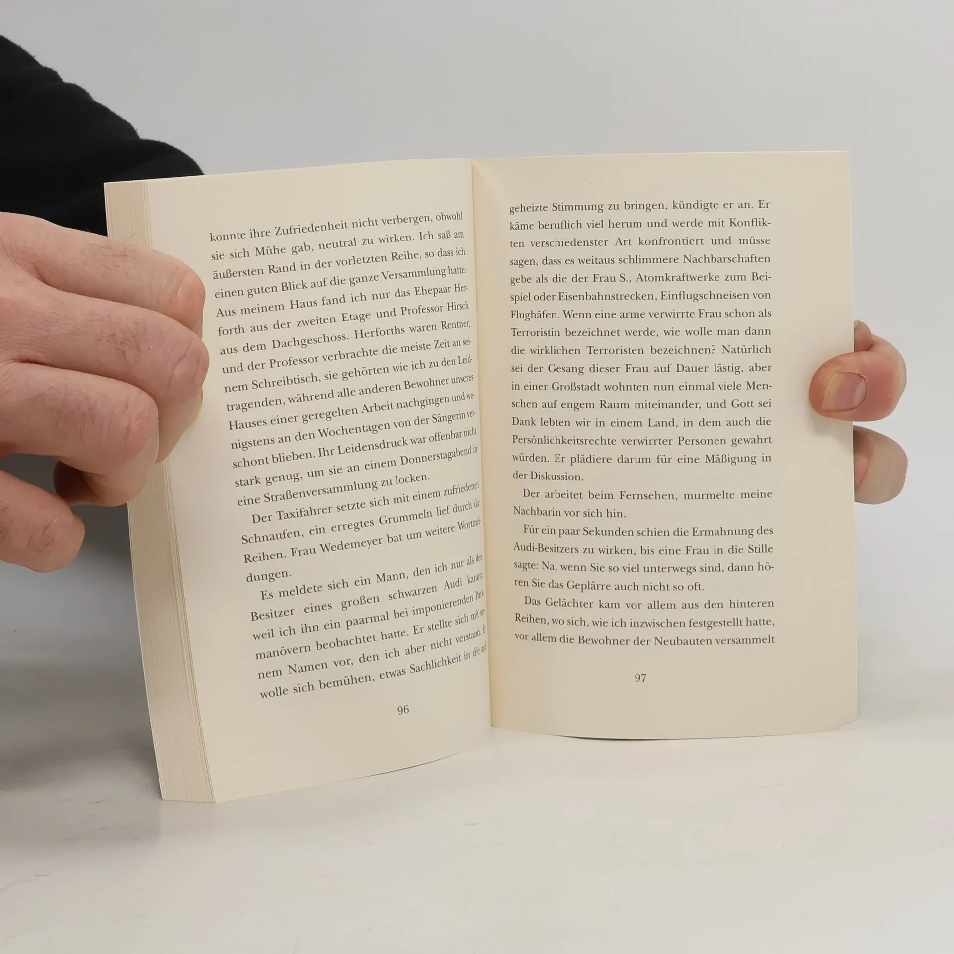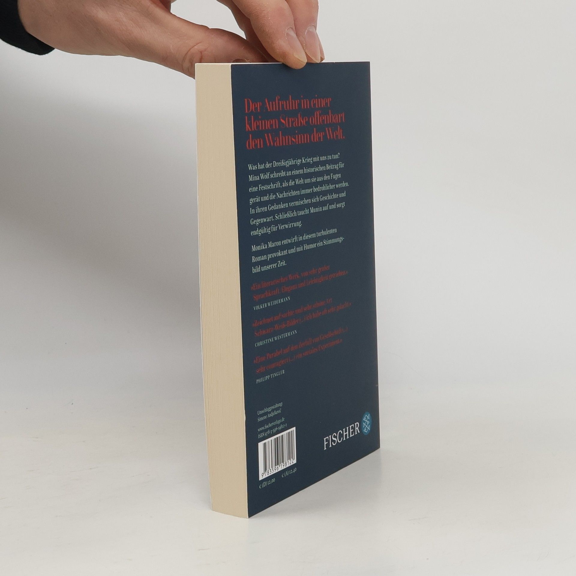 Mina Wolf, Journalistin und Gelegenheitstexterin, opfert den Sommer, um einen Aufsatz über den Dreißigjährigen Krieg für die Festschrift einer Kleinstadt zu schreiben. Eine irre Nachbarin, die Tag für Tag von morgens bis abends auf ihrem Balkon lauthals singt, zwingt sie, nur noch nachts zu arbeiten. Die kleine, enge Straße gerät in Aufruhr und in Minas Kopf vermischen sich der Dreißigjährige Krieg, die täglichen Nachrichten über Krieg und Terror mit der anschwellenden Aggression in der Nachbarschaft. Als auch noch eine Krähe in ihre nächtliche Einsamkeit gerät, die sie Munin nennt und mit der sie ein Gespräch über Gott und die Welt beginnt, ist das Chaos in Minas Kopf komplett. Monika Maron entwirft in diesem turbulenten Roman provokant und mit Humor ein Stimmungsbild unserer Zeit.