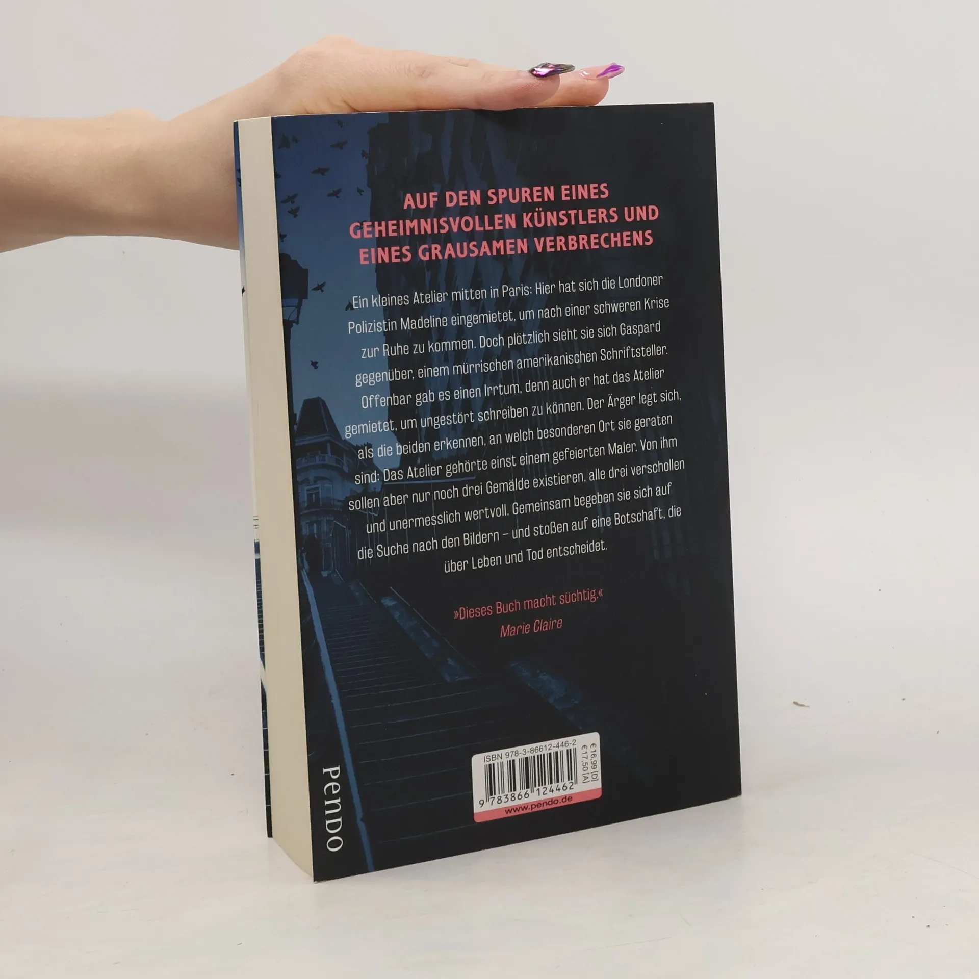 Ein abgelegenes kleines Atelier am Ende einer Allee, mitten in Paris: Hier hat sich die Londoner Polizistin Madeline eingemietet, um eine Weile abzuschalten. Doch plötzlich sieht sie sich Gaspard gegenüber, einem mürrischen amerikanischen Schriftsteller. Offenbar gab es einen Irrtum, denn auch er hat das Atelier gemietet, um in Ruhe schreiben zu können. Der Ärger legt sich, als die beiden erkennen, an welch besonderen Ort sie geraten sind. Das Atelier gehörte einst einem gefeierten Maler, von dem aber nur noch drei Gemälde existieren sollen – alle drei verschollen und unermesslich wertvoll. Als sie sich gemeinsam auf die Suche nach den Bildern begeben, wird ihnen schnell klar, dass den Maler ein grausames Geheimnis umgibt … Für Madeline und Gaspard beginnt eine spannende Jagd, die sie von Paris nach New York führt und sie nicht nur mit ungeahnten menschlichen Abgründen, sondern auch mit ihren eigenen Dämonen konfrontiert.