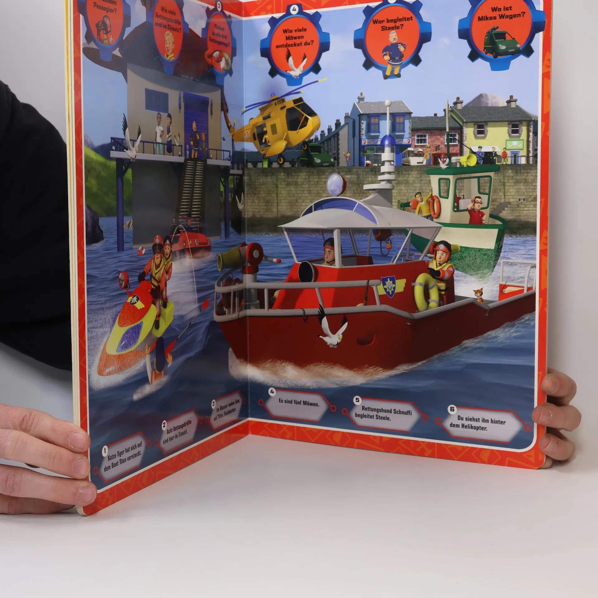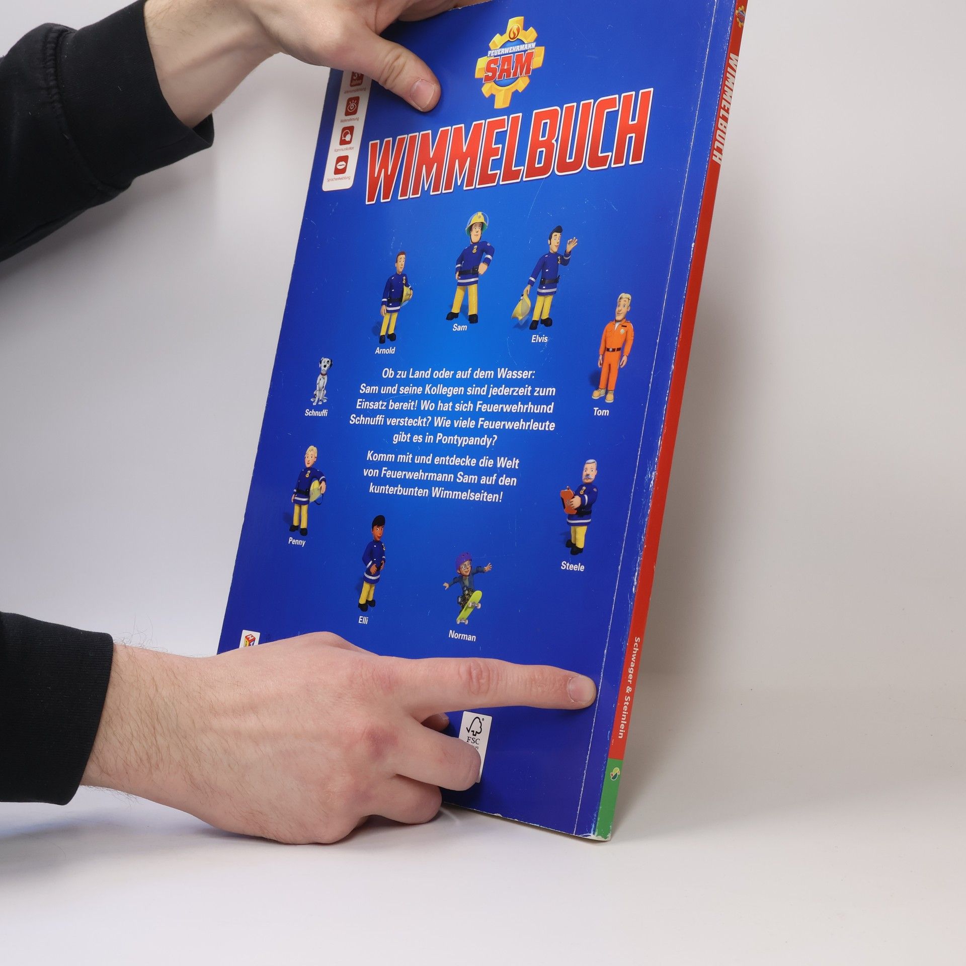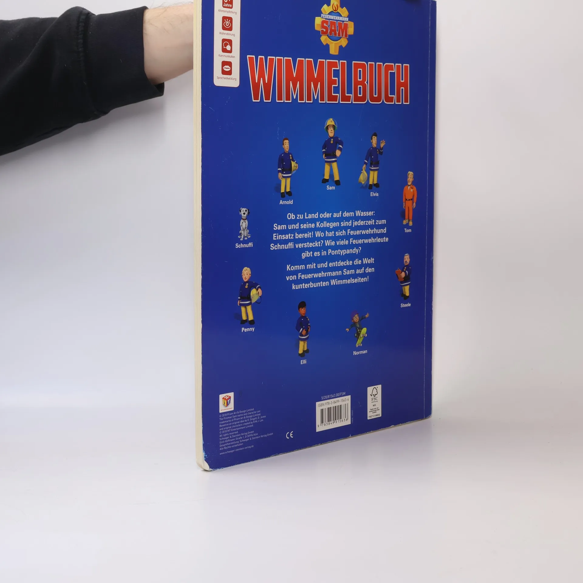 Wimmelspaß mit Feuerwehrmann Sam • Mit allen Figuren aus der Welt von Feuerwehrmann Sam • Mit lustigen Suchaufgaben und Lösungen • Details entdecken und benennen: fördert Konzentration, Wahrnehmungsvermögen und erweitert den Wortschatz Feuerwehrmann Sam ist wieder im Einsatz. Aber wo ist sein Funkgerät? Und wo hat sich Feuerwehrhund Schnuffi versteckt? Entdecke die abenteuerliche Welt von Sam, seiner Kollegin Penny, Hauptfeuerwehrmann Steele, Cridlington und allen anderen Bewohnern von Pontypandy. Ob zu Land oder auf dem Wasser: Die Feuerwehrleute von Pontypandy sind jederzeit bereit! Oh je, Mike ist am Hafen ins Wasser gefallen - zum Glück ist Sam direkt zur Stelle und rettet ihn! Auf den riesengroßen Wimmelseiten gibt es zahlreiche Details zu entdecken. Besonders toll: Zu jeder Szene gibt es Suchaufgaben, die die Kinder zum Geschichten erfinden und erzählen animieren. So werden spielerisch noch Wortschatz, Konzentration und Fantasie aller kleinen Feuerwehrmann Sam-Fans gefördert.