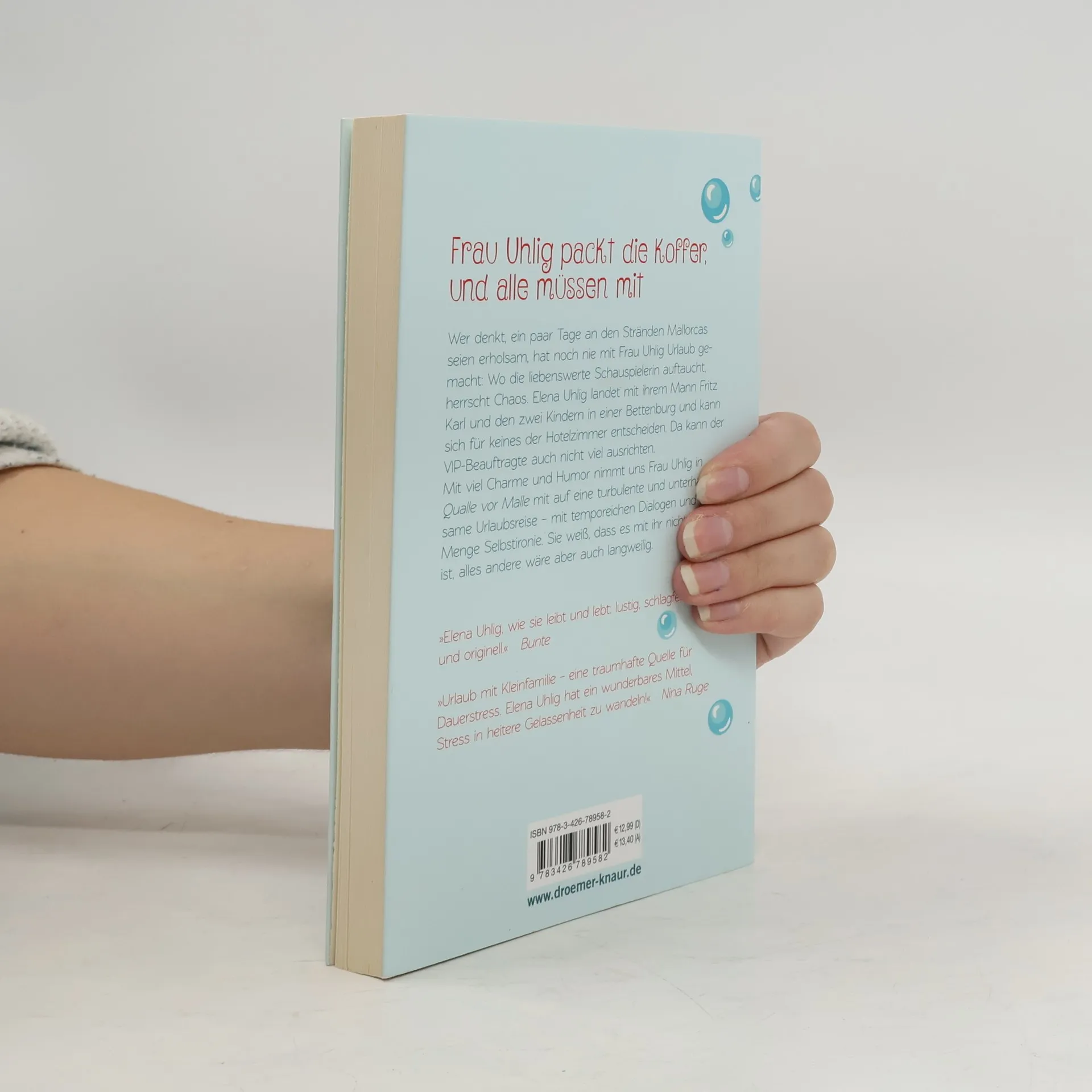 Die Schauspielerin Elena Uhlig erzählt ihre lustigsten Urlaubs-Geschichten: Wo Frau Uhlig mit ihrem Partner Fritz Karl und ihren Kindern auftaucht, herrscht Chaos. Nach „Mein Gewicht und ich“ und großen TV- und Kinoproduktionen wie „Auf der anderen Seite ist das Gras viel Grüner“ und „Die Ketzerbraut“ macht sie mit ihrer Familie Urlaub auf Mallorca und erlebt dort turbulente und chaotische Ferien. Wer denkt, ein paar Tage an den Stränden Mallorcas seien erholsam, hat noch nie mit Frau Uhlig Urlaub gemacht: Wo die liebenswerte Schauspielerin auftaucht, herrscht Chaos. Elena Uhlig landet mit ihrem Partner Fritz Karl und ihren Kindern auf Mallorca in einer Bettenburg und kann sich schon am ersten Tag nicht entscheiden, in welchem Hotelzimmer sie das Glück des Urlaubs genießen möchte. Da kann der VIP-Beauftragte, der seine Dienste anbietet, auch nicht viel ausrichten. Elena Uhligs Talent ist es, mit einer großen Portion Charme, viel Humor und Herzlichkeit, jeden auf ihre Seite zu ziehen. In „Qualle vor Malle“ nimmt sie uns mit auf eine turbulente, lustige und unterhaltsame Urlaubsreise mit überladenen Tellern vom Buffet, verdreckten Stränden, temporeichen Dialogen und immer einer Menge guter Laune und Selbstironie. Denn Frau Uhlig weiß, dass es mit ihr nicht leicht ist, alles andere wäre aber auch langweilig. „Qualle vor Malle“ sind witzige Urlaubs-Geschichten und ist die perfekte Urlaubslektüre für alle, die humorvolle Bücher lieben. „Elena Uhlig wie sie leibt und lebt: lustig, schlagfertig und originell.“ Bunte „Urlaub mit Kleinfamilie – eine traumhafte Quelle für Dauerstress. Elena Uhlig hat ein wunderbares Mittel, Stress in heitere Gelassenheit zu wandeln: Sie trainiert uns in der großen Kunst des Humors - und lässt uns entspannen in buddhistischer Liebe zu allem, was ist: Die Qualle, das Dixie-Klo, die Tintenfischsauce. Der letzte Ernst der Dinge ist heiter!“ Nina Ruge