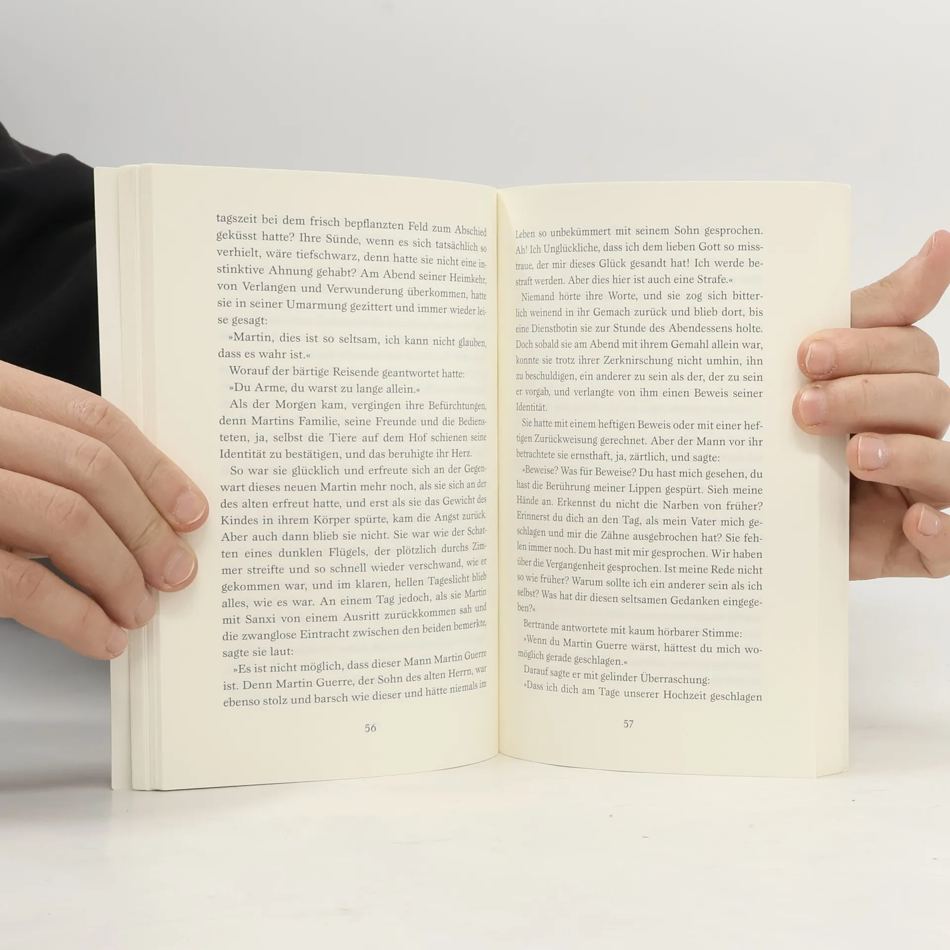 Die tragische Liebesgeschichte von Bertrande und Martin Als Martin Guerre nach langjähriger, rätselhafter Abwesenheit endlich zu seiner Frau zurückkehrt, ist Bertrande de Rols von Sinnen vor Glück. Acht Jahre lang hatte sie sich gesehnt, hatte gebangt und gezürnt, war weder Witwe noch frei gewesen, und jetzt – endlich – kann sie sich hingeben. Der Liebe, ihrer Sinnlichkeit, seinem Begehren. Welcher Dämon treibt ihr plötzlich Zweifel ins Herz? Ist der Mann, den sie liebt, wirklich Martin? Hin- und hergerissen zwischen ihrer Sehnsucht nach Zugehörigkeit und einer düsteren Ahnung entfesselt sie eine richterliche Untersuchung – und eine Tragödie.