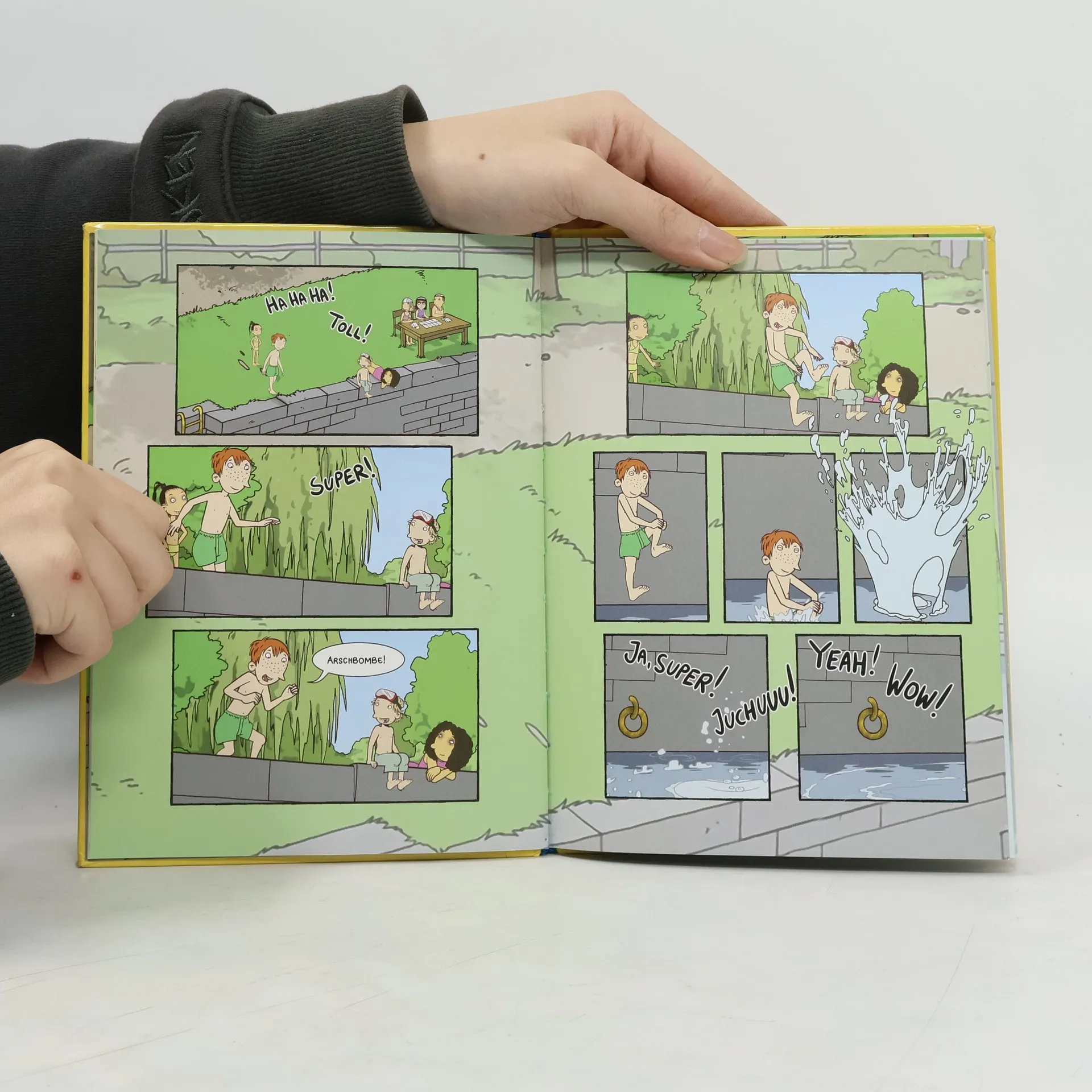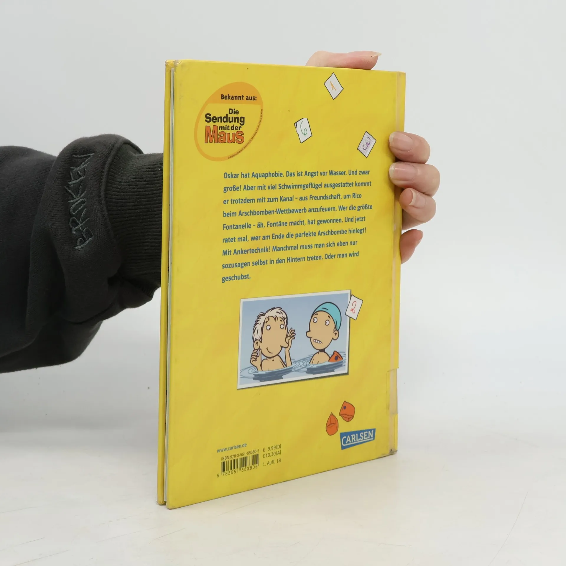 Oskar hat Aquaphobie. Das ist Angst vor Wasser. Und zwar große! Aber mit viel Schwimmgeflügel ausgestattet kommt er trotzdem mit zum Kanal – aus Freundschaft, um Rico beim Arschbomben-Wettbewerb anzufeuern. Wer die größte Fontanelle – äh, Fontäne macht, hat gewonnen. Und jetzt ratet mal, wer am Ende die perfekte Arschbombe hinlegt! Mit Ankertechnik! Manchmal muss man sich eben nur sozusagen selbst in den Hintern treten. Oder man wird geschubst. Die Comicgeschichten von Rico und Oskar: bekannt aus der Sendung mit der Maus! Alle Bände: Fische aus Silber Die Regenhütte Die perfekte Arschbombe Die Sache mit den Öhrchen
