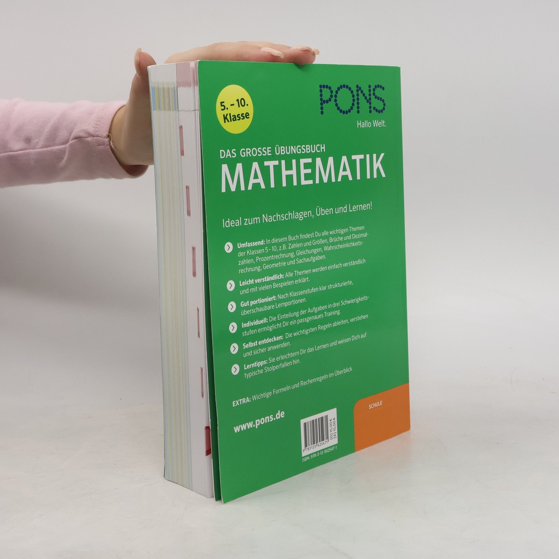 Ideal zum Nachschlagen, Üben und Lernen! Der komplette Lernstoff in 900 Übungen. Umfassend: In diesem Buch findest Du alle wichtigen Themen der Klassen 5 bis 10, z. B. Zahlen und Größen, Brüche, Dezimalzahlen, Prozentrechnung, Gleichungen, Wahrscheinlichkeitsrechnung, Geometrie und Sachaufgaben. Leicht verständlich: Alle Themen werden einfach erklärt und mit vielen Beispielen veranschaulicht. Gut portioniert: Für jede Klassenstufe gibt es klar strukturierte Lernportionen. Individuell: Die Aufgaben sind in drei Schwierigkeitsstufen unterteilt, was ein passgenaues Mathe-Training ermöglicht. Selbst entdecken: Die wichtigsten Mathe-Regeln können abgeleitet, verstanden und sicher angewendet werden. Lerntipps erleichtern das Lernen und weisen auf typische Stolperfallen hin. EXTRA: Auf den letzten Seiten findest Du wichtige Formeln und Rechenregeln im Überblick. Themen im Buch: 5. Klasse: Rechnen mit natürlichen Zahlen, geometrische Grundbegriffe, Text- und Sachaufgaben. 6. Klasse: Teilbarkeit, Prozentrechnung, Winkel, Rechnen mit ganzen Zahlen. 7. Klasse: Dreisatzrechnung, rationale Zahlen, lineare Funktionen, Wahrscheinlichkeitsrechnung. 8. Klasse: Binomische Formeln, Gleichungssysteme, Satz des Pythagoras. 9. Klasse: Quadratische Funktionen, Trigonometrie, Kombinatorik. 10. Klasse: Exponential- und Logarithmusfunktionen, Wahrscheinlichkeiten.