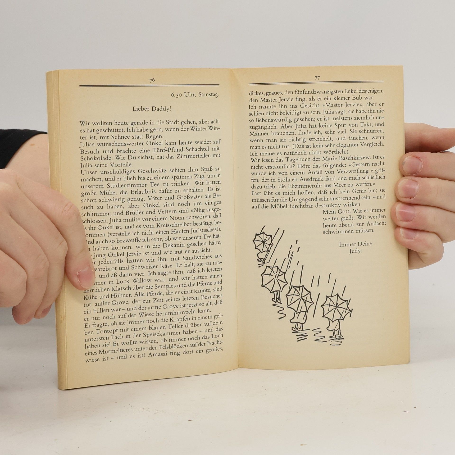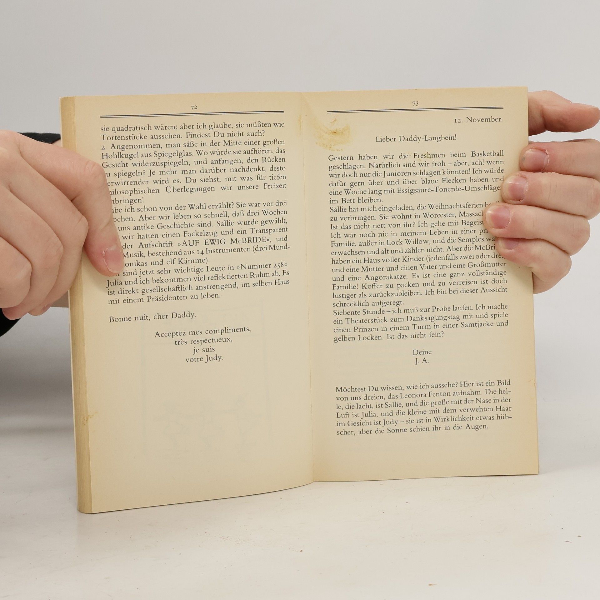Dieses Jugendbuch ist ein Liebesroman für junge Frauen. Der berühmte Klassiker wurde mit Fred Astaire verfilmt. Die junge Jerusha kann wunderbar schreiben, deshalb schickt ein reicher Gönner das Waisenkind aufs College. Er erwartet dafür jeden Monat einen Brief, in dem das Mädchen über ihre Fortschritte berichtet. Da ist Jerusha ganz in ihrem Element: freimütig und frech, voller Beobachtungsgabe und übersprudelnder Fantasie schildert sie dem ihr unbekannten Mann, den sie Daddy Langbein nennt, wie sie vorankommt und was sie bewegt. Und ihr Leben steckt voller Überraschungen! Seit Generationen wird die temperamentvolle Heldin von heranwachsenden Mädchen geliebt.